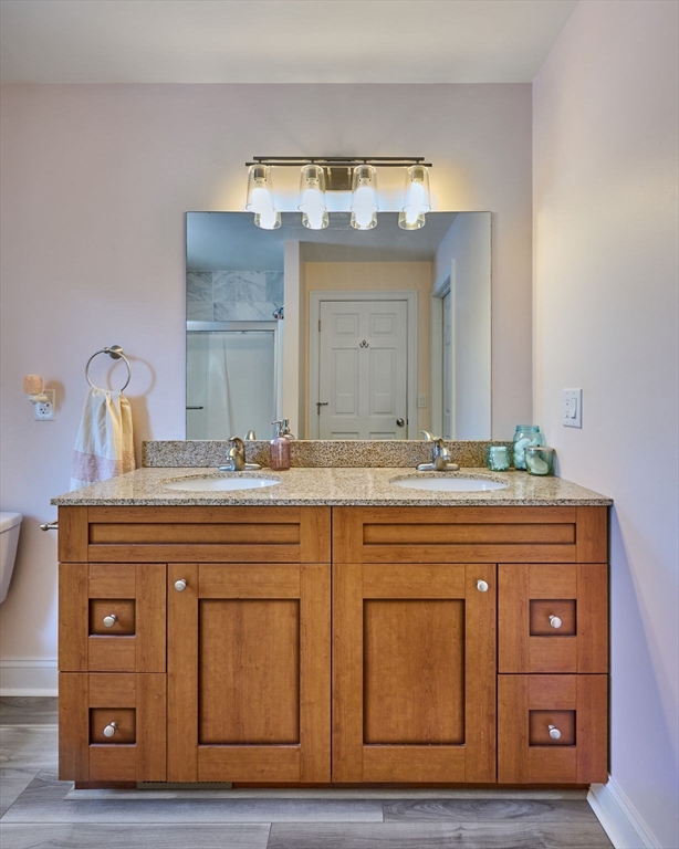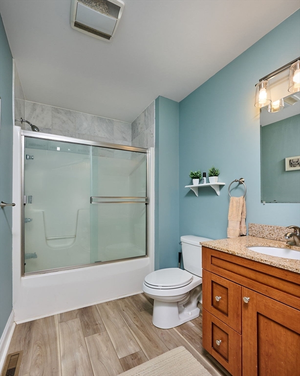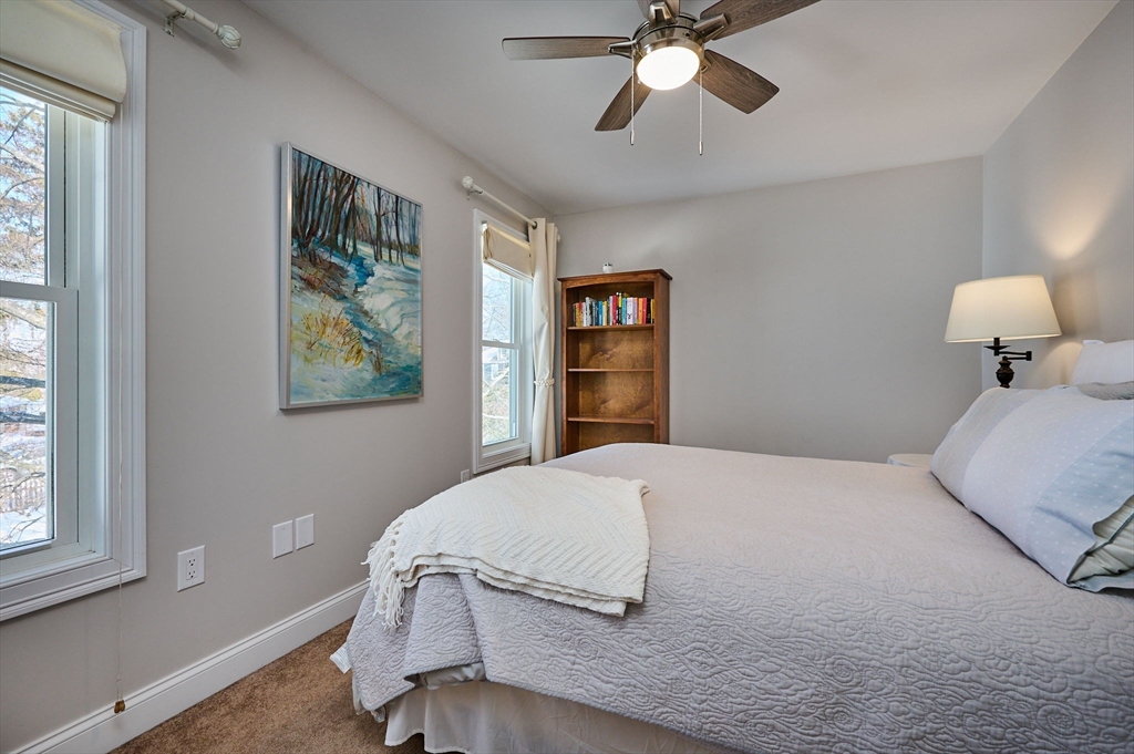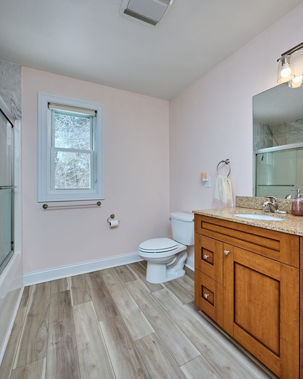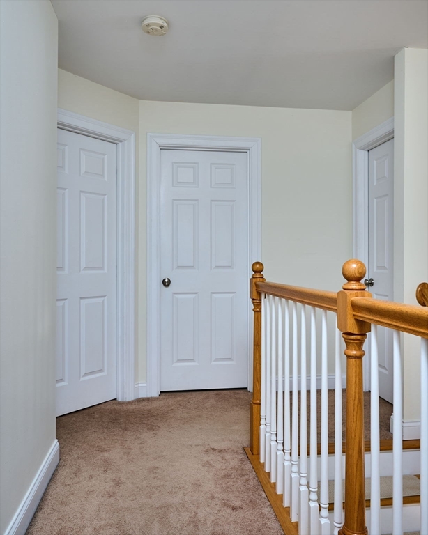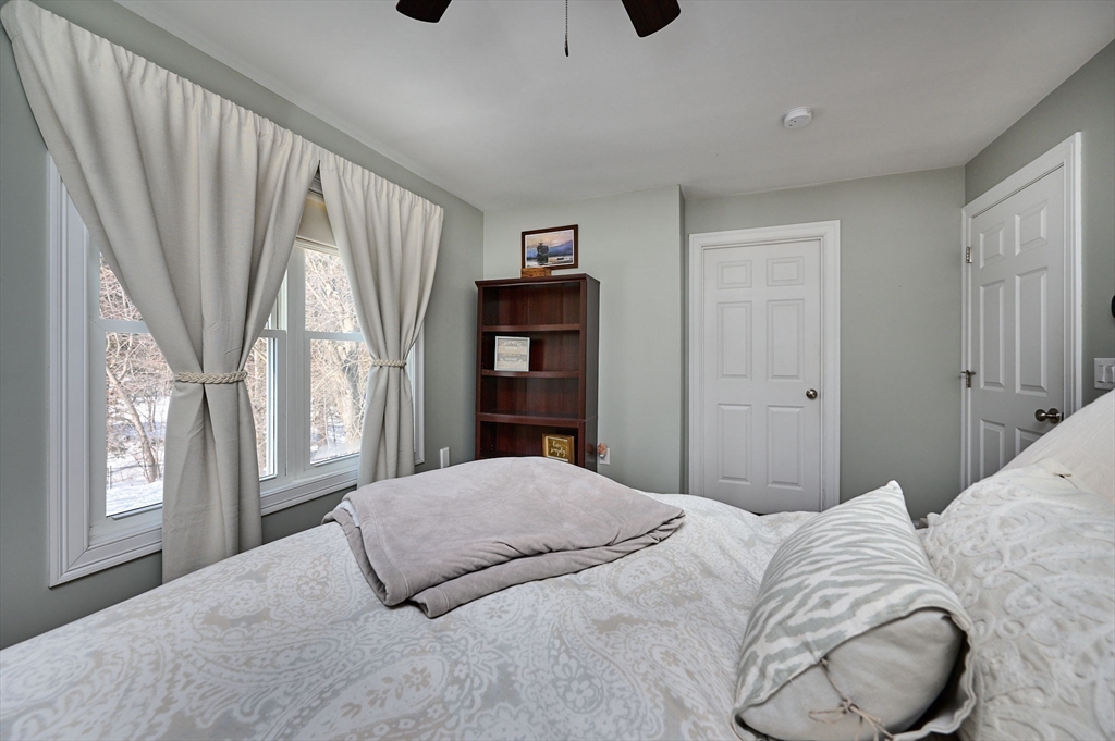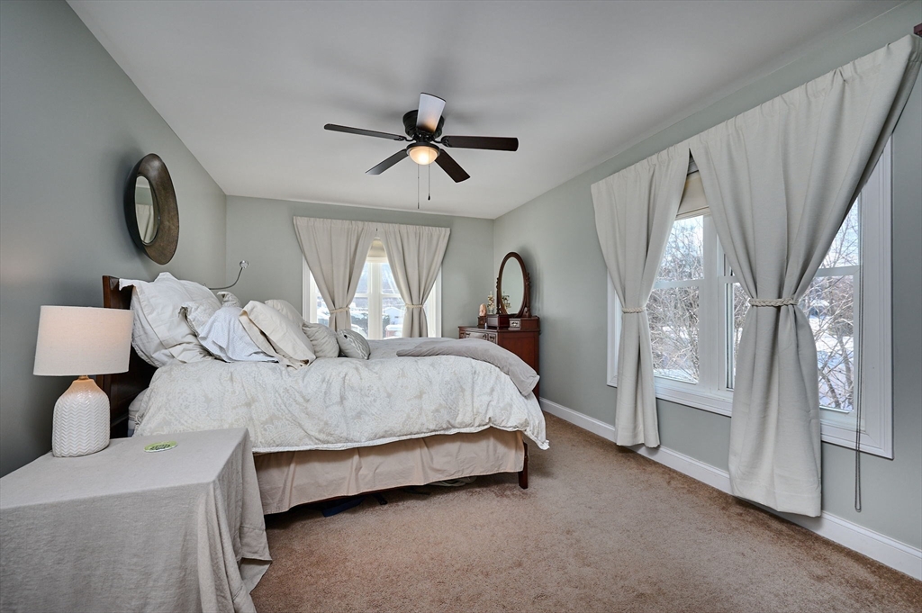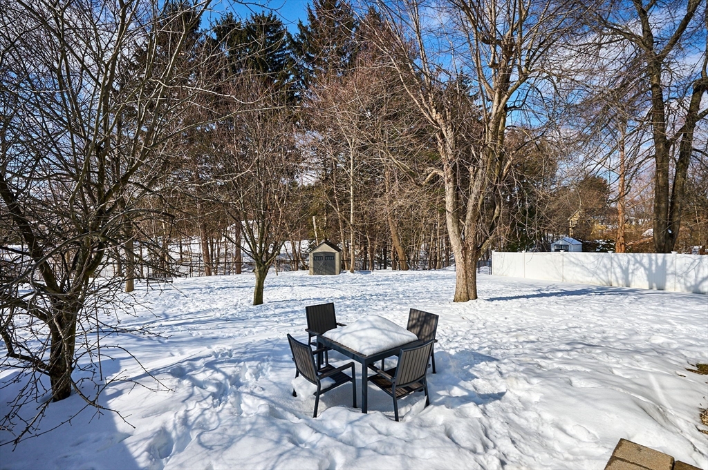 With views of the Mt Tom range, this 2007 Colonial is located within a short distance from the bike trail, hiking trails in the Mt Tom State Reservation and the cultural center of Easthampton. A dramatic two story foyer greets as you enter the front door. The formal dining room could be flex space with a slider to the patio and private fenced yard. This location feels like an oasis with a stream bordering the backyard. The open eat-in kitchen and living room offer great space for entertaining. A wood stove adds cozy warmth and heating. The primary bedroom has a large closet and spacious en-suite bath. Two more bedrooms and a guest bath are upstairs. There is extra storage space in the attic over the garage. The solar panels offset electricity bills. An efficient heat pump heating system was installed in 2023 with WiFi thermostats for a more environmentally friendly home. For an added bonus, there is an ultimate gaming room in the basement with a full wall of closets for storage.