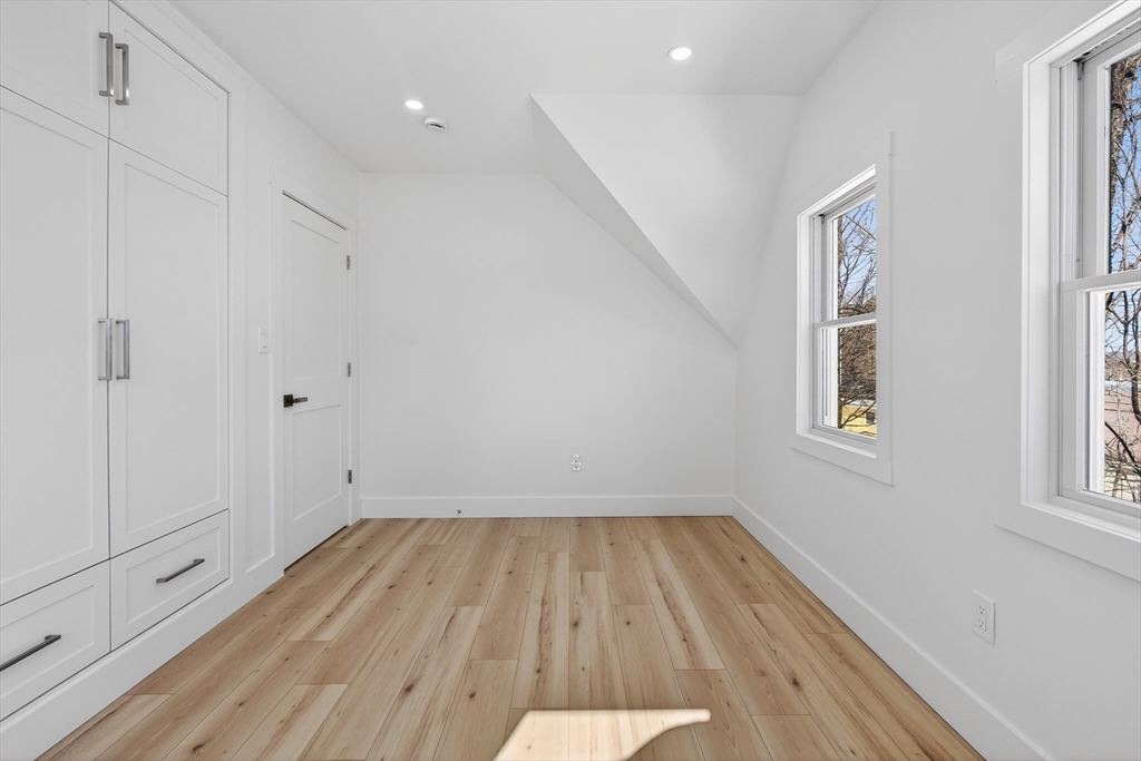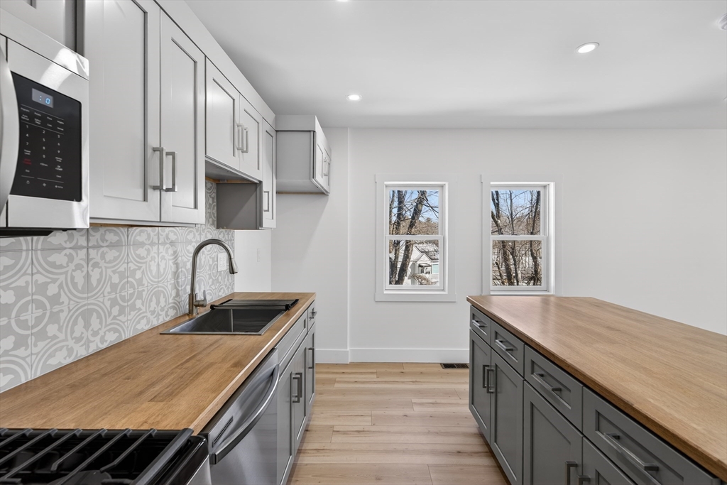 New construction and completely reimagined, this modern townhome lives like a single family while offering the efficiency of a low maintenance setup. Built with all new systems, finishes, and thoughtful design throughout, this 3 bedroom, 1.5 bath home features an open concept layout centered around a designer kitchen with warm grey cabinetry, light brown stained wood countertops, stainless steel appliances, and a soft grey decorative backsplash flowing seamlessly into a bright living area with built in electric fireplace. Finished in Greek Villa paint with neutral white oak style flooring throughout, creating a clean and cohesive feel. Upstairs offers three bedrooms with custom closets and a modern tiled full bath. Central air, off street parking, and basement storage complete the home. Convenient to Route 2, shopping, and local amenities.