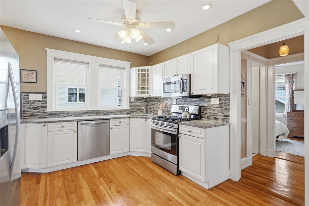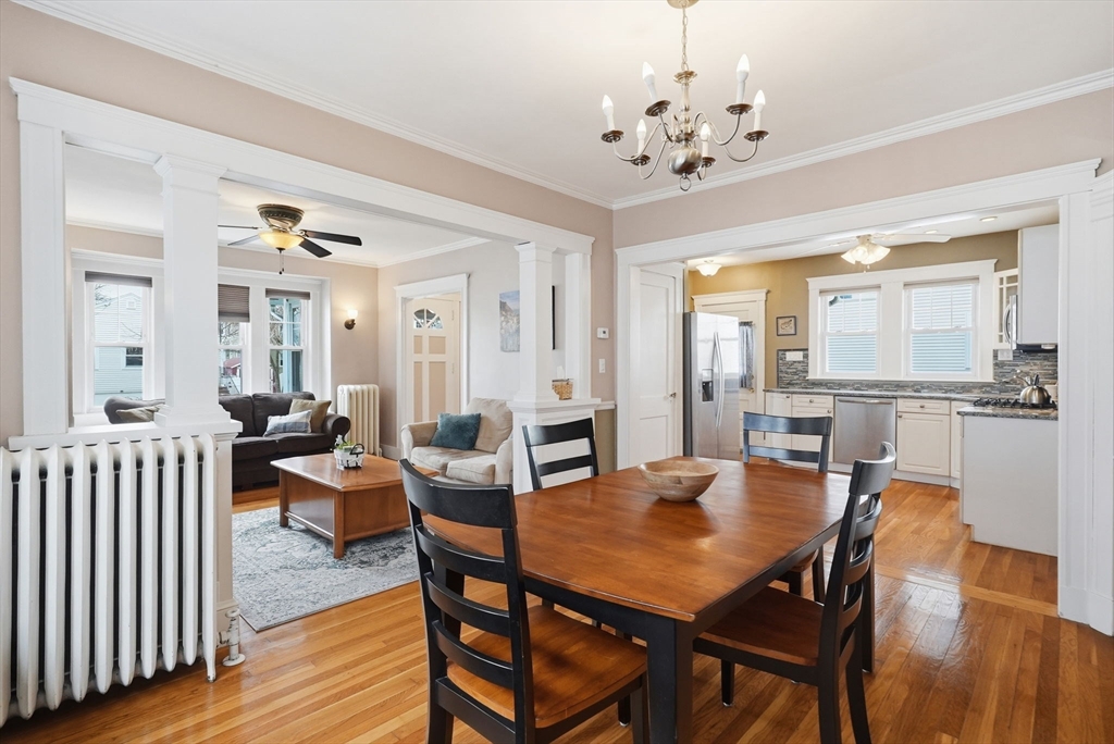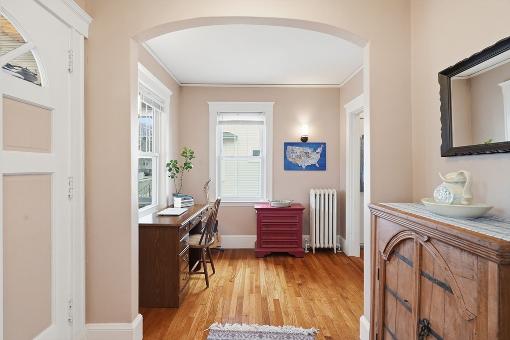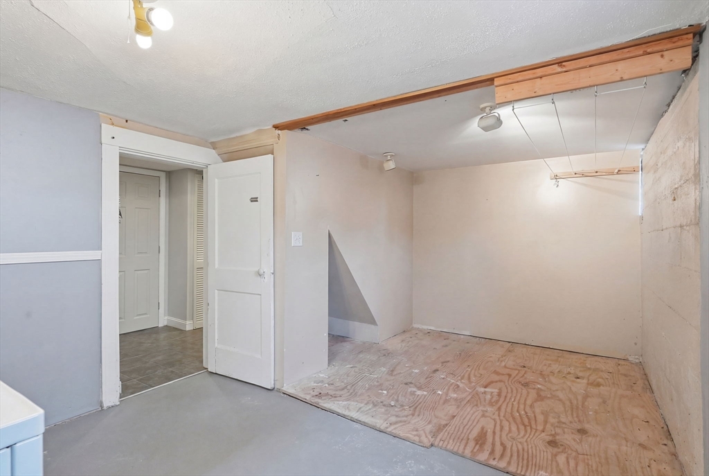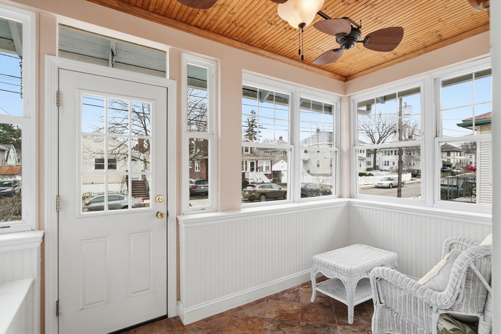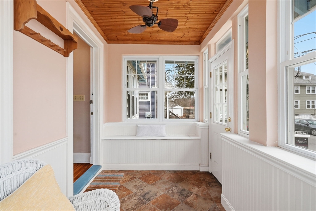 Charming 2-bedroom bungalow just 0.7 miles from the restaurants, shops & public transit of Quincy Center. A bright front porch welcomes you with a built-in window seat and storage. Inside, the fireplaced living room features stained glass windows and classic built-ins. A sunlit bonus area off the hallway is perfect for a home office. The dining room flows into an updated kitchen with stainless steel appliances. Two comfortable bedrooms and a full bath with a glass-enclosed tub round out the first floor. The lower level offers even more versatility with finished space for a family room, playroom, or media area, plus a laundry room and a separate room well-suited for a home gym. Enjoy a private yard, a side paver patio perfect for outdoor dining, and a garage for added convenience/ storage. Ideally located just over a mile from Wollaston Beach and close proximity to Merrymount Park. A perfect blend of charm, function, and location!
