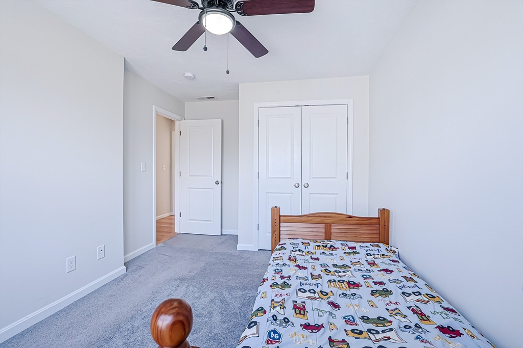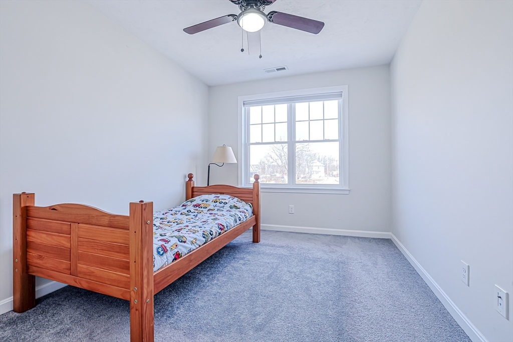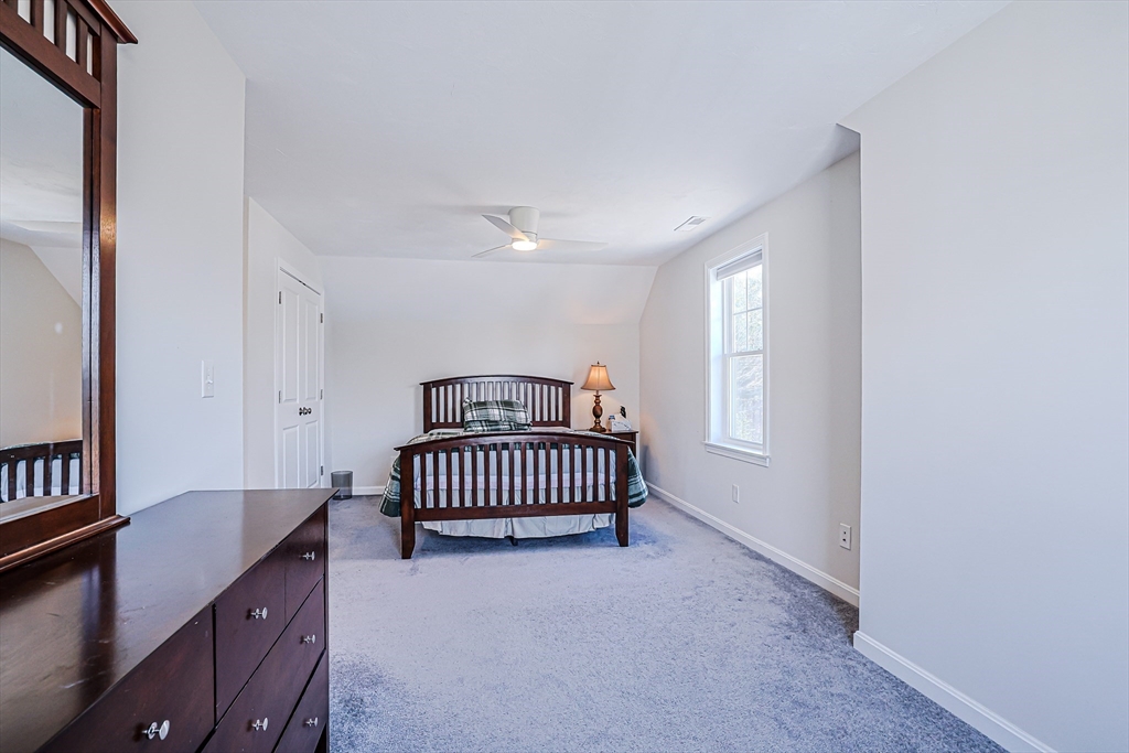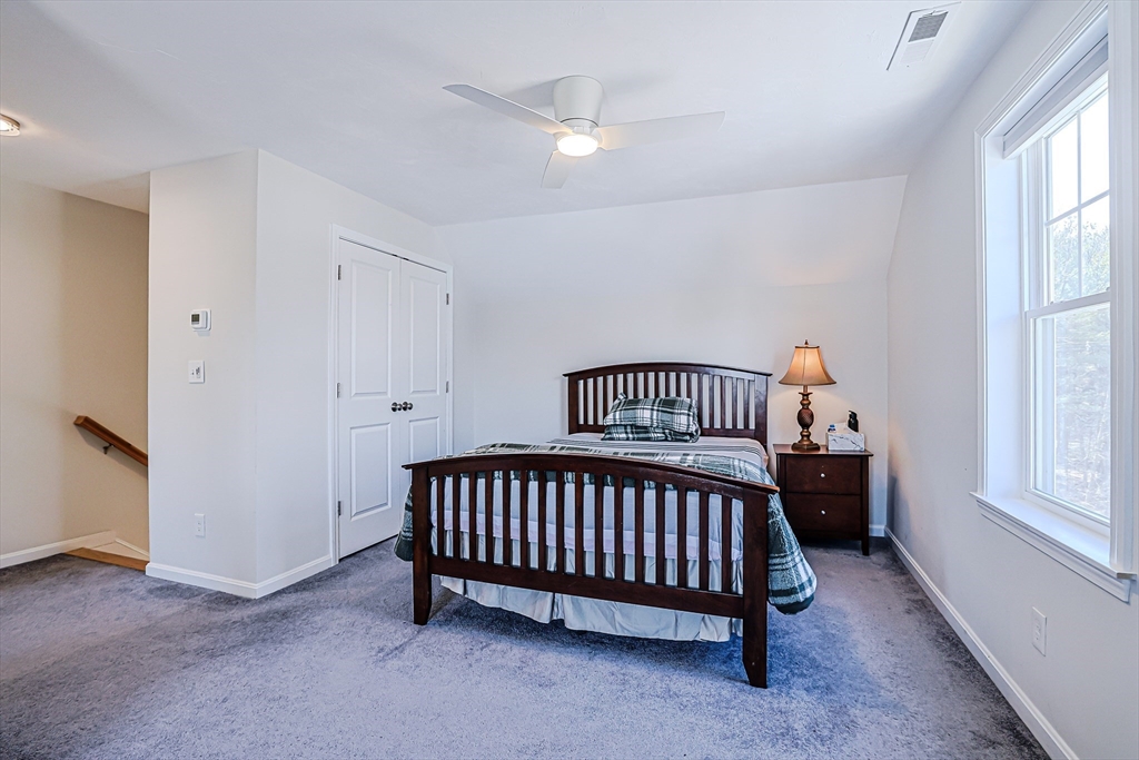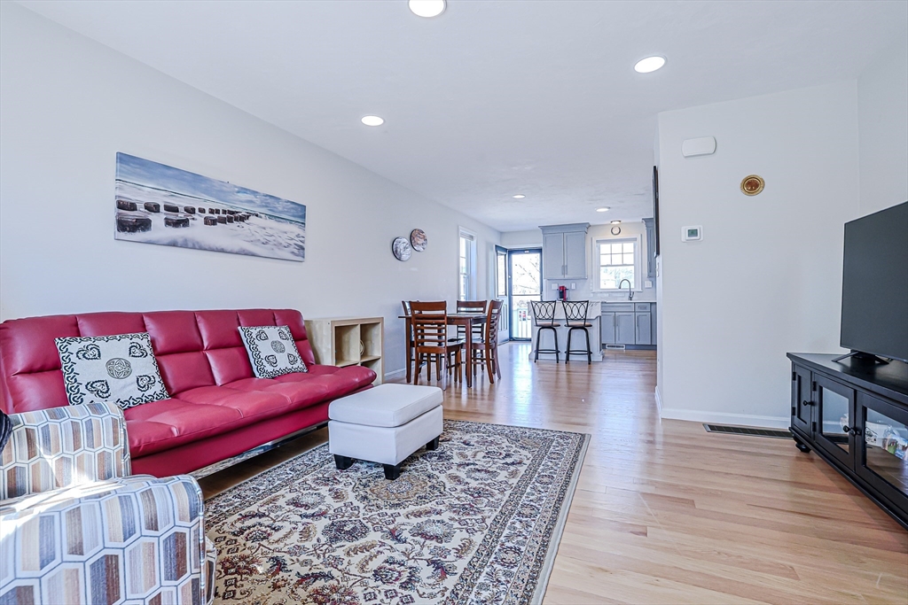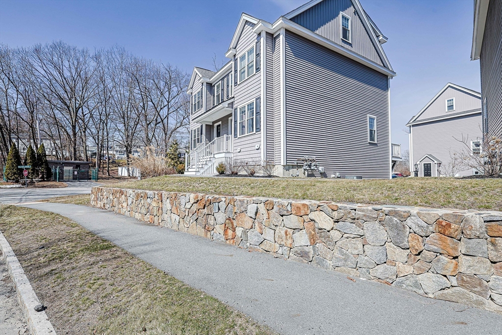 Welcome to this beautifully maintained, move-in ready end-unit townhouse, built in 2021, in sought-after North Chelmsford. The open-concept first floor features bright living and dining areas, a stylish kitchen with recessed lighting, stainless steel appliances, and a movable island—perfect for everyday living and entertaining. Enjoy easy access to a private deck and a convenient half bath on the main level. Upstairs offers two spacious bedrooms with ceiling fans, double closets, and a full bath with quartz counters and tile flooring. The third-floor main suite provides a large bedroom, ample closet space, and a full bath with modern finishes. Deep window sills, hardwood halls and stairs, and thoughtful details add charm throughout. The lower level includes laundry, storage, and direct access to an attached one-car garage.
