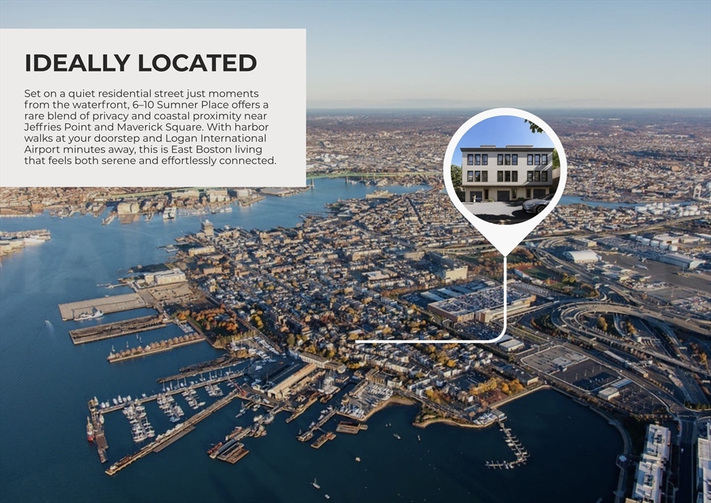 Welcome to Sumner Place, an unmatched collection of three luxury townhouses that live like single family homes in the heart of Jeffries Point. All homes have 1700+ sq ft, 2 Beds/2.5 Baths + multiple outdoor spaces including: oversized private roof decks with head houses, balconies + large private yards. #6 features private pull in garage parking on the 1st level with direct entry to a mudroom/hallway. Also on the 1st level is a laundry room with side by side full sized washer/dryer. Private staircase leads to great room with kitchen, separate dining nook, living area + powder room. Kitchen features Matte White GE Cafe appliance package + oversized Quartz island with seating for 4. Private balcony off living/dining area. 3rd level has guest bedroom + bath plus large Primary Bedroom w/en suite bath, floating double vanity + frameless glass shower. Stairs lead up to private head house and 120+ sq ft roof deck with 270 degree views. Fall 2026 completion. Showings available now by appt!