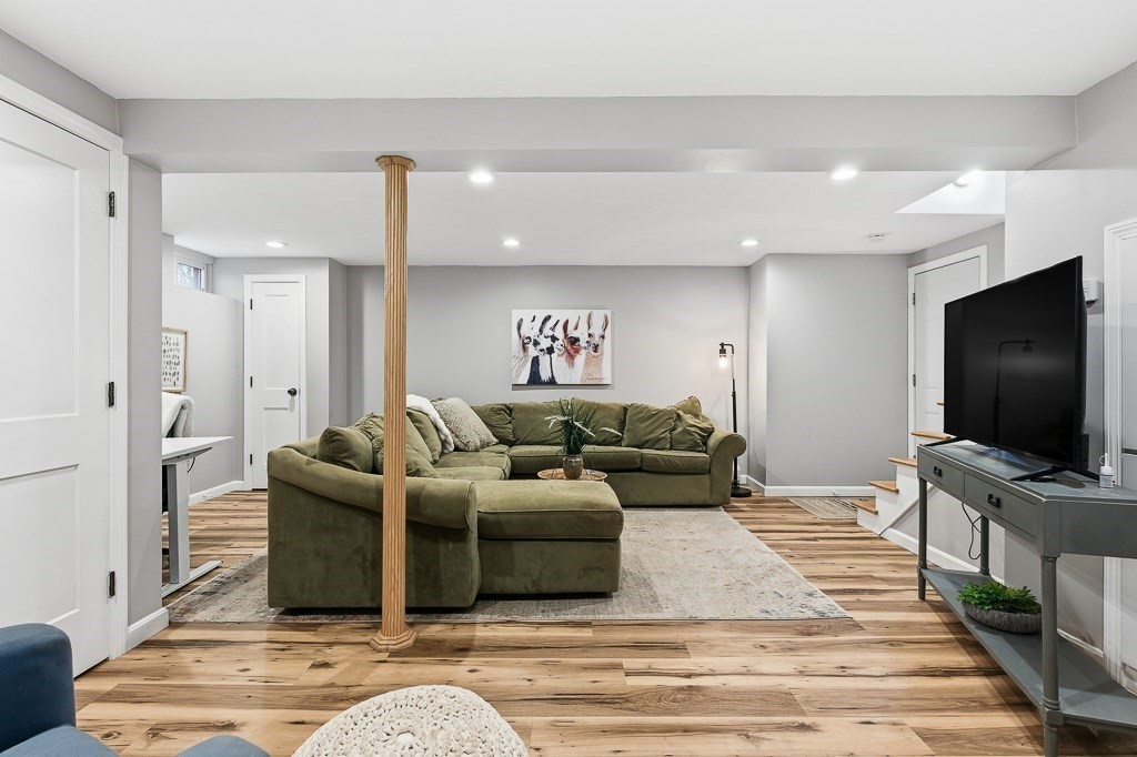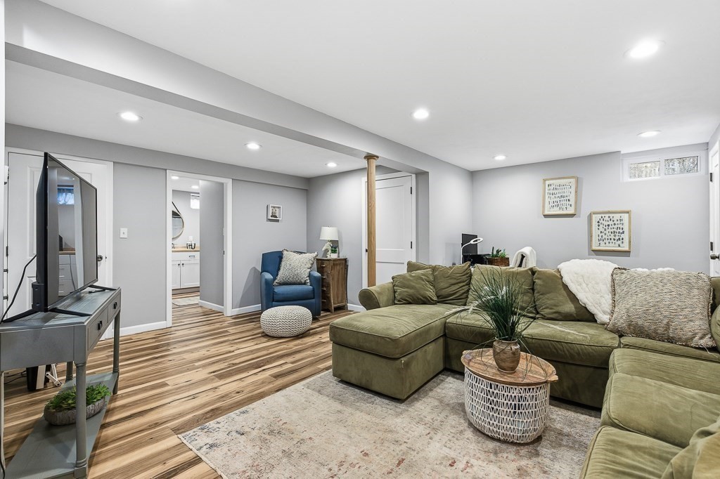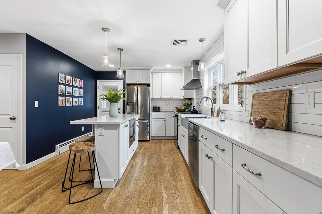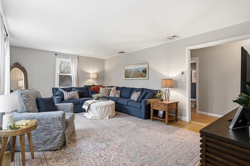 Beautiful ranch-style home with two car garage and plenty of off-street parking. This home has been meticulously updated! The elegant kitchen adorned with stainless steel appliances, stunning quartz counters and fresh modern cabinets includes an island and eat in area for guests to enjoy! Through the kitchen there is access to a mud room with a sliding door to the deck area. The spacious living room with beautiful hardwood floors and lots of windows to let in natural light allowing for a great place to relax. The first floor bathroom has a gorgeous tiled shower and custom vanity. The bedrooms all have hardwood flooring and attractive light fixtures. In the basement you will find a large family room with recessed lighting which makes for great entertaining with an additional full bathroom finished with vinyl flooring and washer/dryer hook up. Outside there is a fenced in back yard with patio area including a built in fire pit to enjoy a night under the stars. Don't miss out!
