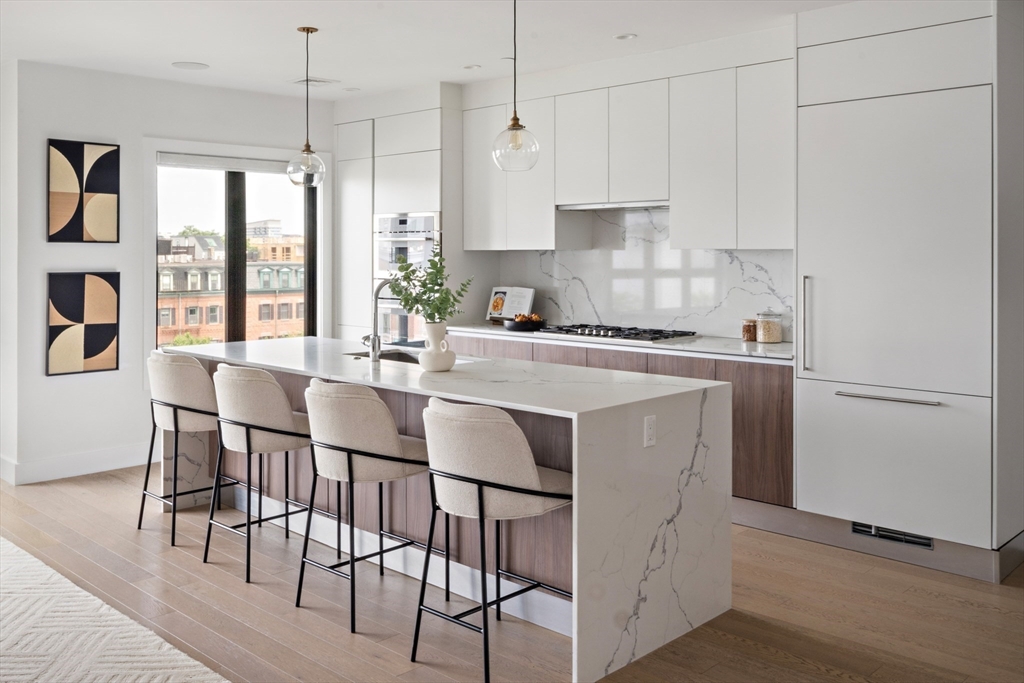 Luxury penthouse living in South Boston’s coveted West Broadway neighborhood. This expansive 3+ bedroom residence features an open layout designed for both everyday living and entertaining. The chefs kitchen, appointed with Scavolini cabinetry, quartz waterfall countertops, and Thermador appliances, opens seamlessly to the living and dining area with direct access to a private balcony. The primary suite offers a walk-in California Closet and a spa-like bath with a double vanity and a Porcelanosa tiled shower. Upstairs, a sun filled headhouse with wet bar provides flexible living space and opens to a private roof deck equipped with gas, water & electricity; ideal for entertaining while enjoying sweeping city views. Additional highlights include Hunter Douglas blinds, Lutron lighting, deeded storage, and seamless elevator access to your 2 garage parking spaces. Located just a block from public transportation, shops and restaurants. Experience exceptional living in an unbeatable location.