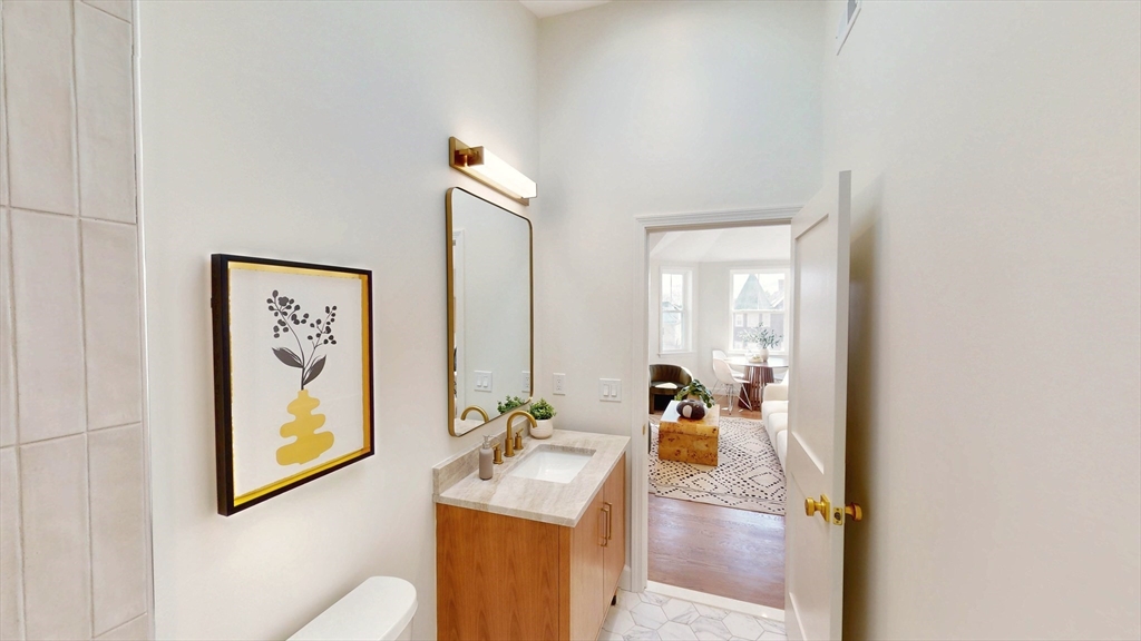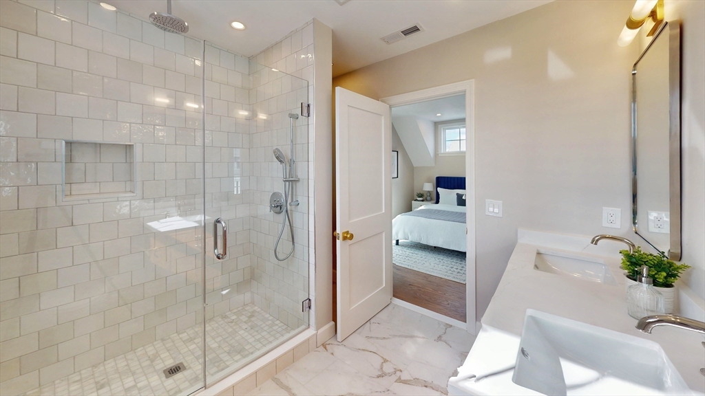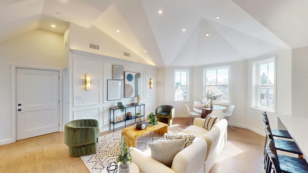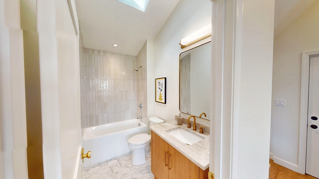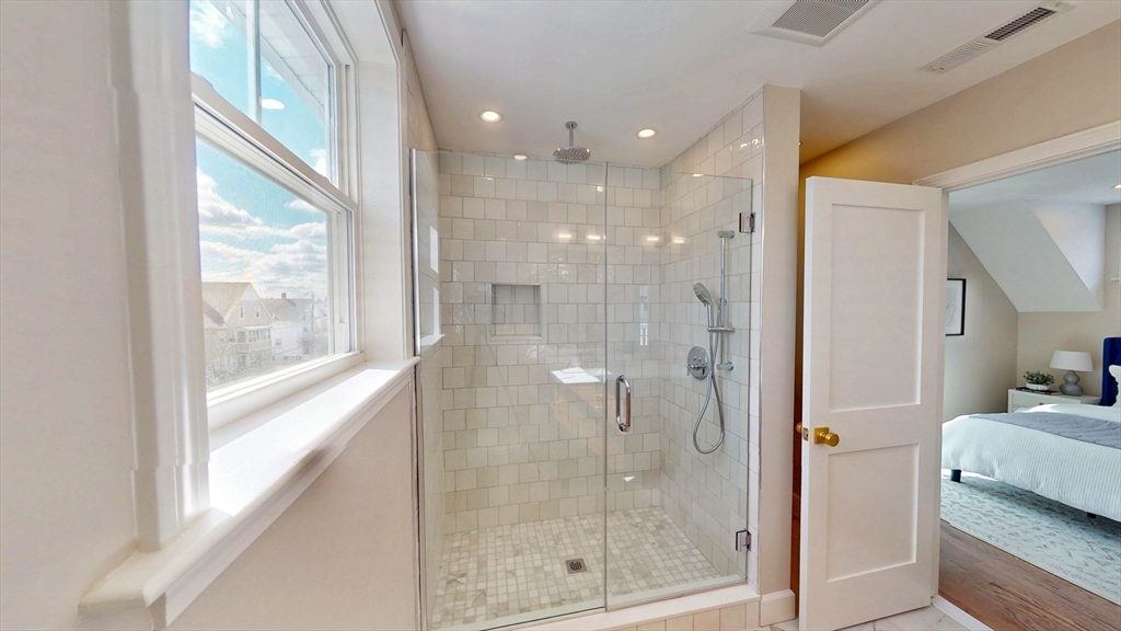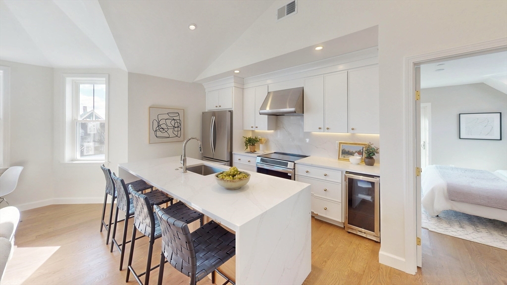 The top floor of 411 Salem was built for light. Vaulted cathedral ceilings span the entire main living area, filling the space with an openness and volume that carries through every room. The open-concept kitchen centers on a white oak waterfall island, with full-height Calacatta quartz backsplash, beverage cooler, brass hardware, and ceiling-height cabinetry flowing directly into the living space. A floor-to-ceiling custom paneled millwork wall anchors the living room. A dedicated mudroom with bench completes the entry. The primary suite features a walk-in closet and en suite with rain shower, double vanity, and calacatta tile, opening directly to a private balcony. A generously sized second bedroom and full second bath with soaking tub, Taj Mahal stone countertop, skylight, and brass fixtures complete the unit. In-unit laundry. Designed as much for efficiency as comfort and aesthetics, this all-electric home includes deeded tandem parking, all just steps from neighborhood shops.