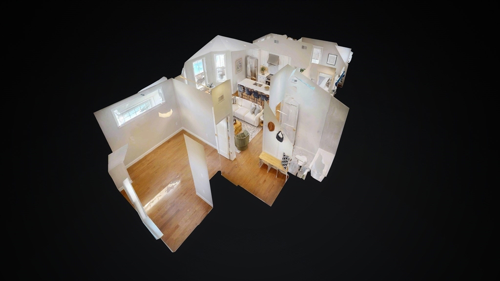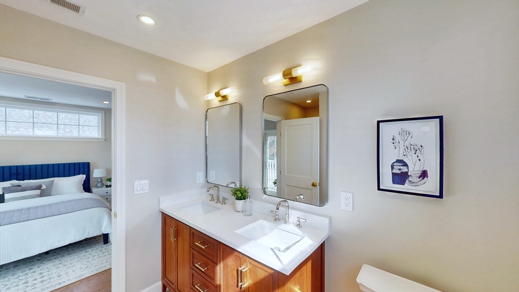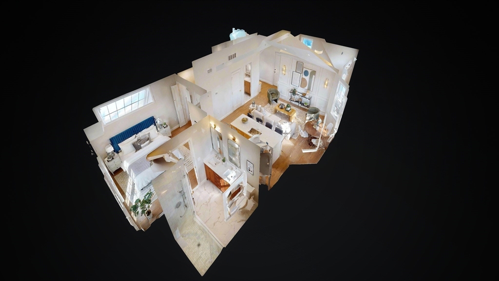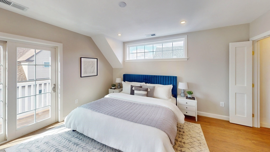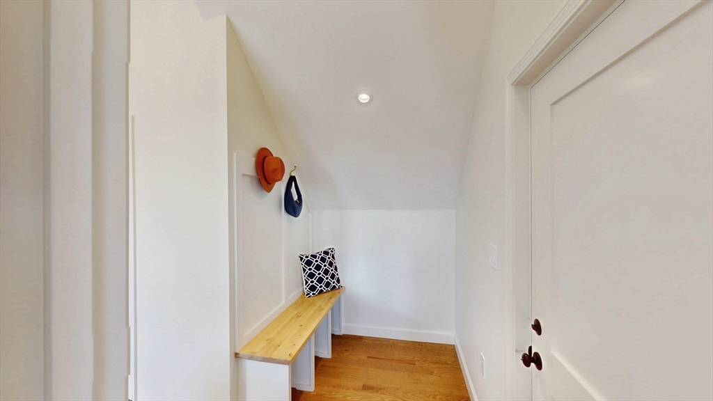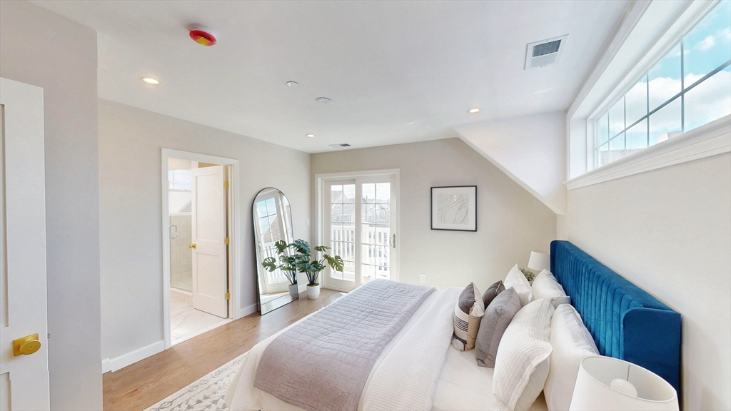 The top floor of 411 Salem was built for light. Vaulted cathedral ceilings span the entire main living area, filling the space with an openness and volume that carries through every room. The open-concept kitchen centers on a white oak waterfall island, with full-height Calacatta quartz backsplash, beverage cooler, brass hardware, and ceiling-height cabinetry flowing directly into the living space. A floor-to-ceiling custom paneled millwork wall anchors the living room. A dedicated mudroom with bench completes the entry. The primary suite features a walk-in closet and en suite with rain shower, double vanity, and calacatta tile, opening directly to a private balcony. A generously sized second bedroom and full second bath with soaking tub, Taj Mahal stone countertop, skylight, and brass fixtures complete the unit. In-unit laundry. Designed as much for efficiency as comfort and aesthetics, this all-electric home includes deeded tandem parking, all just steps from neighborhood shops.