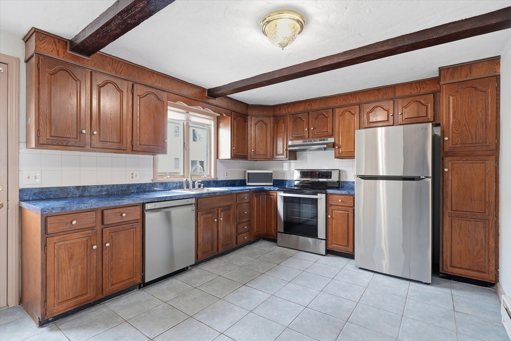 Tired of Rent? Welcome Home to 22 N. Central Street, Unit 5. This 1,000 sq ft, 2 bedroom, 1.5 bath Townhouse w/ garage is part of a small 6-unit Townhouse property. Your main level has a large eat-in kitchen with stainless appliances, half bath, living room w/ pellet stove & rear deck with stairs off the kitchen. The upper level has 2 large bedrooms, a full bathroom, and bonus attic access for additional storage. The lower level comprises a large garage, separate laundry/utility room with plenty of storage. Recent upgrades include upper-level flooring (2020); appliances (2020); and 5 new Anderson windows (2023). Additional assigned parking spot and shared outdoor picnic area. Centrally located less than 2 miles from the North Shore Mall. Perfect location for any commute with easy access to all major routes. Low HOA which includes water/sewer, landscaping and snow plowing services. This is a great opportunity to build equity and stop paying someone else’s bills!