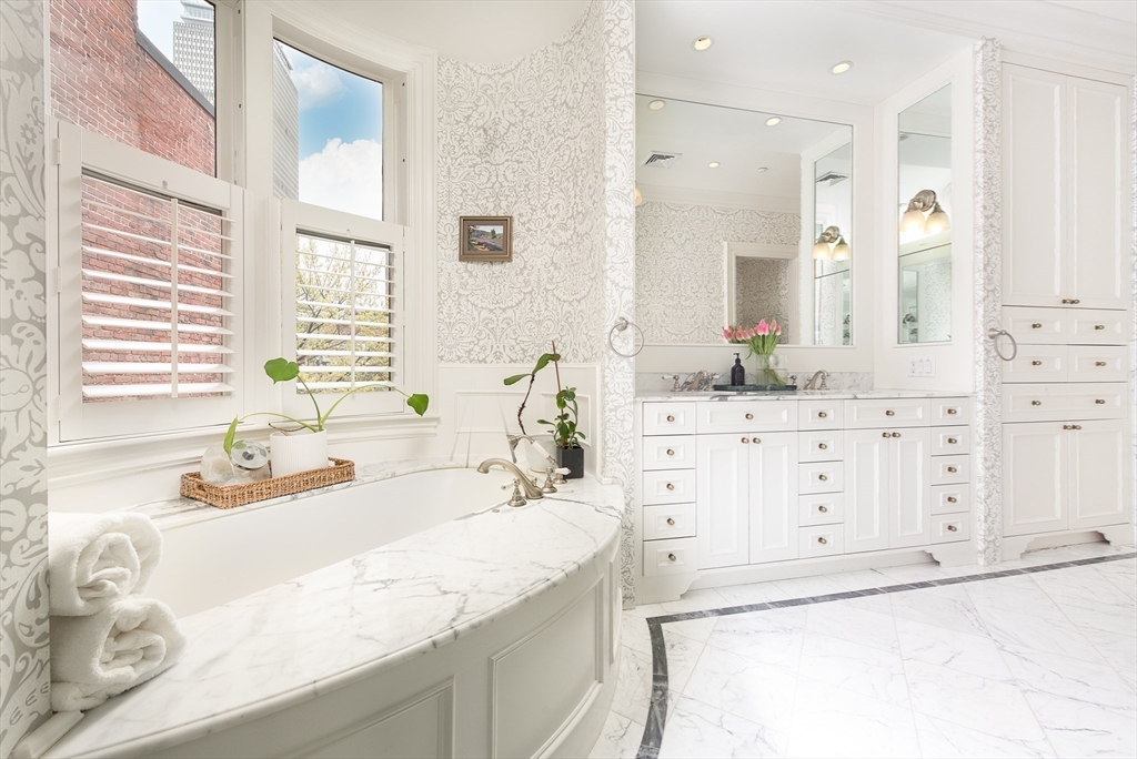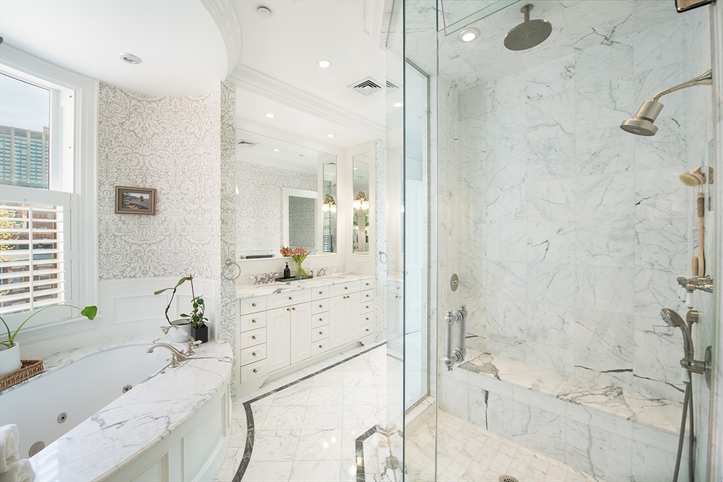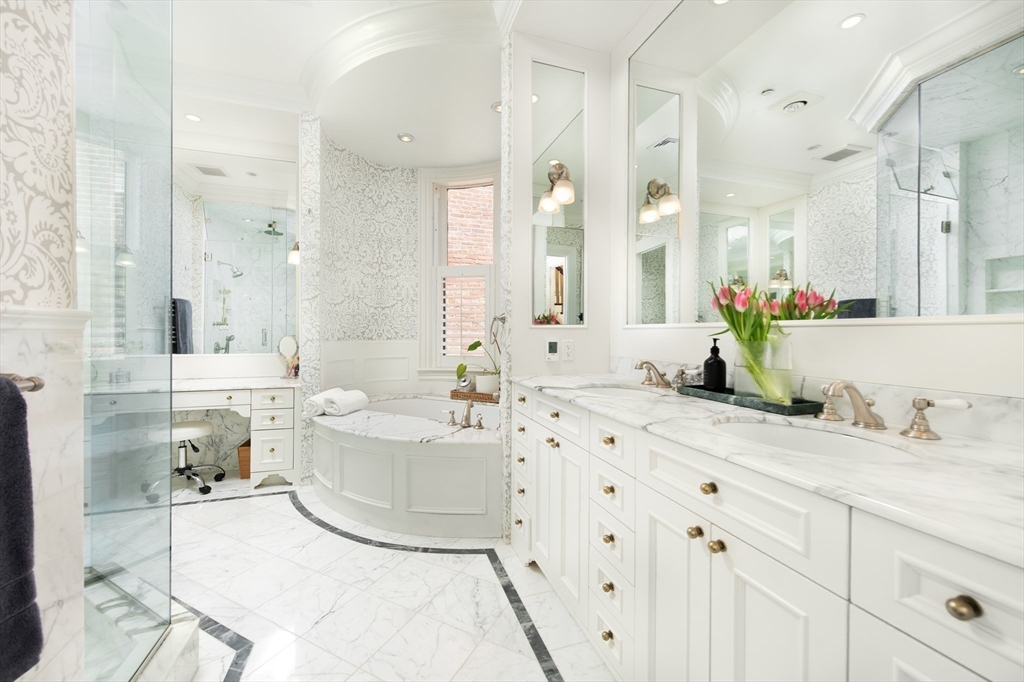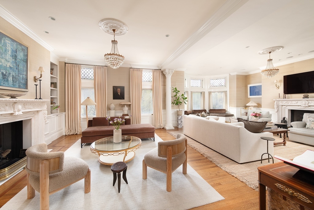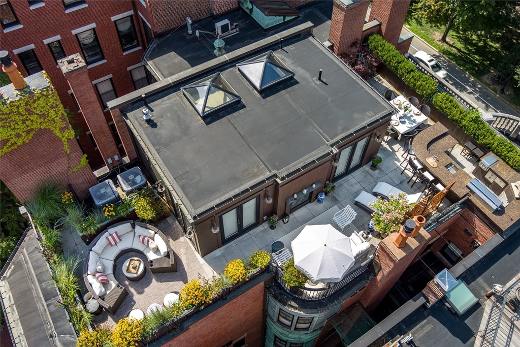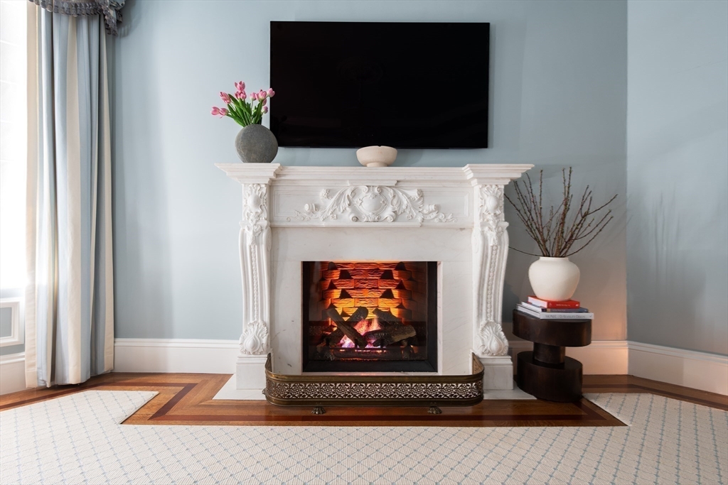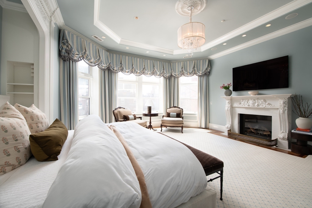Exceptional 35' wide Penthouse overlooking tree lined Commonwealth Ave. Set atop of the Clark Weld House built in 1896 and gut renovated in 2010, this spacious triplex stuns as you step off of your direct elevator access into your double wide living room flanked by 2 custom marble fireplaces & 10' ceilings. On this level, there is a beautiful Chef's Kitchen w/ 2 dishwashers, Dining Room, Mahogany fireplaced Study & Butler's Pantry. On the second level, relax by the fireplace in the huge primary suite w/ a spa like bathroom en suite and 2 walk in closets.Three more bedrooms, full bath & laundry finish out this level. The top floor boasts a custom solarium w/ fridge, dishwasher, 1/2 bath & indoor/outdoor fireplace w/ french doors out to a 930sf wrap around roof deck w/ outdoor kitchen & bar. This developer's unit spared no expense during the renovations including marble baths w/ radiant heat, 5 fireplaces, private locked storage, Creston system, pre-wired speakers & two garage spaces.
