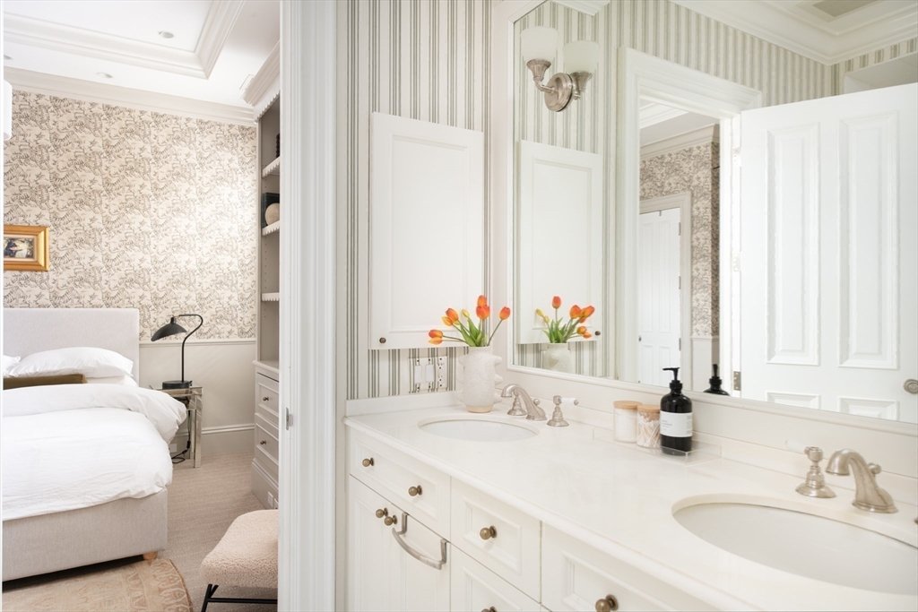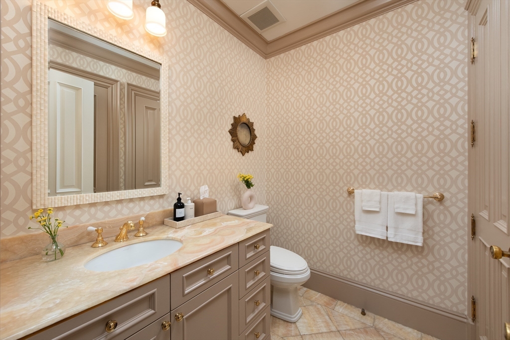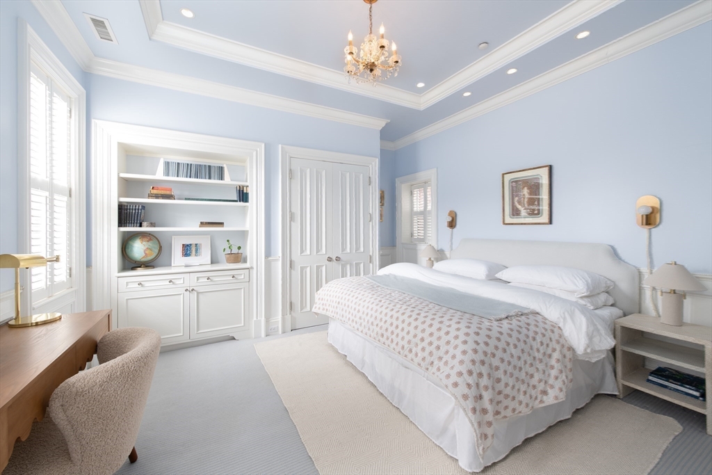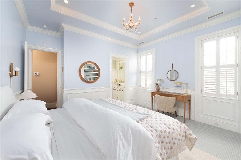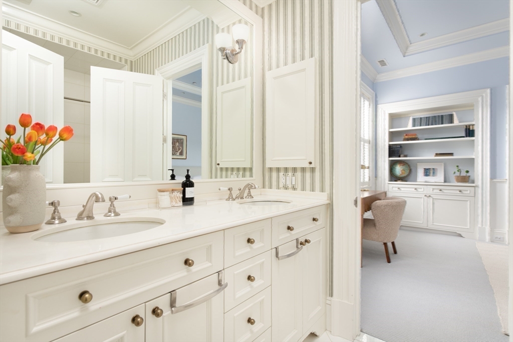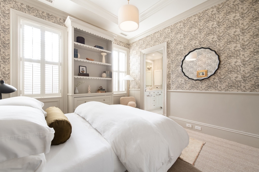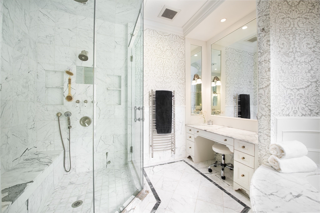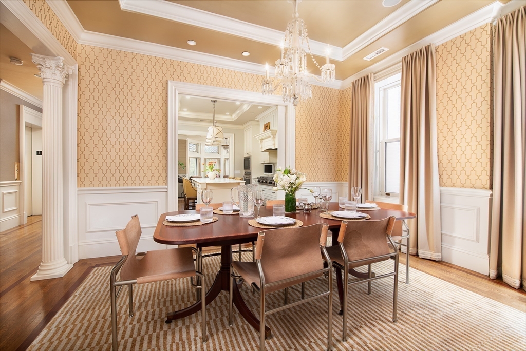 Exceptional 35' wide Penthouse overlooking tree lined Commonwealth Ave. Set atop of the Clark Weld House built in 1896 and gut renovated in 2010, this spacious triplex stuns as you step off of your direct elevator access into your double wide living room flanked by 2 custom marble fireplaces & 10' ceilings. On this level, there is a beautiful Chef's Kitchen w/ 2 dishwashers, Dining Room, Mahogany fireplaced Study & Butler's Pantry. On the second level, relax by the fireplace in the huge primary suite w/ a spa like bathroom en suite and 2 walk in closets.Three more bedrooms, full bath & laundry finish out this level. The top floor boasts a custom solarium w/ fridge, dishwasher, 1/2 bath & indoor/outdoor fireplace w/ french doors out to a 930sf wrap around roof deck w/ outdoor kitchen & bar. This developer's unit spared no expense during the renovations including marble baths w/ radiant heat, 5 fireplaces, private locked storage, Creston system, pre-wired speakers & two garage spaces.