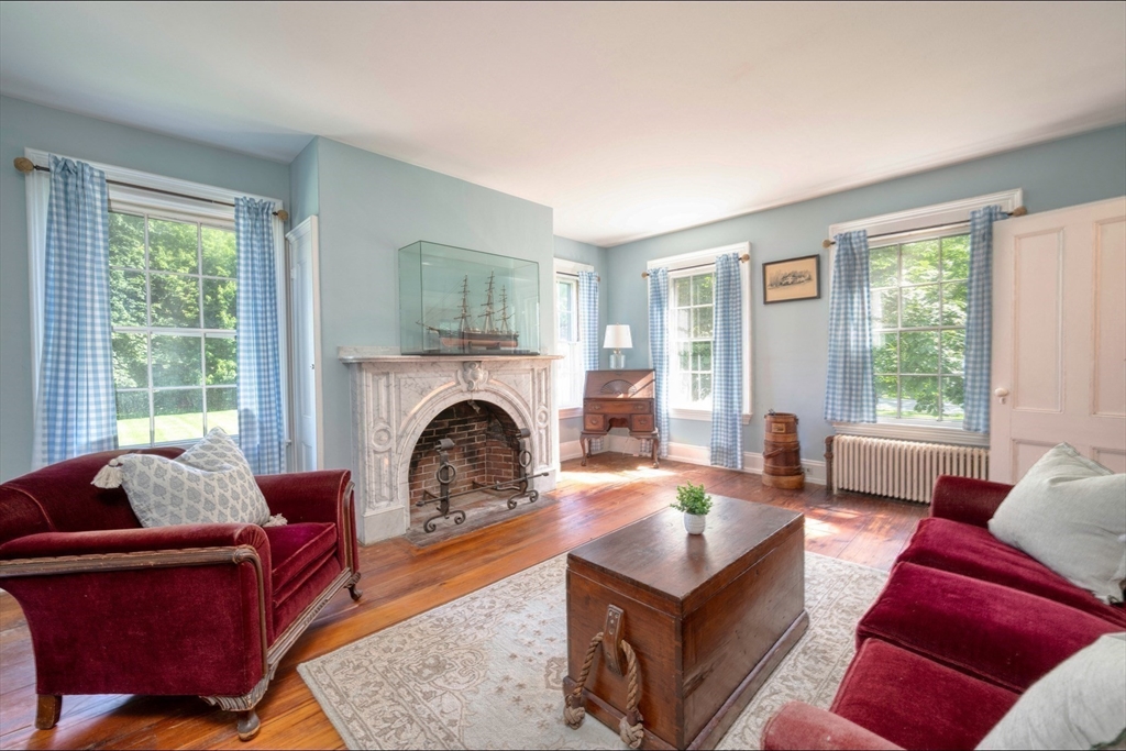 Rare opportunity to own a quintessential N.England property where classic character meets generous living, complemented by ample outbuildings in a scenic setting. Featuring high ceilings, wide pine floors & most rooms adorned w/ fireplaces. Treasured marble fp's are believed to be a sea Captain's gift. Charming kitchen boasts exposed beams, SSL applian, farmhouse sink. 2 living rooms--one w/ built-ins, stovetop/microw/wet bar. Whether you envision an office, studio, or guest suite, the possibilities are endless. Versatile rooms--view the floor plans. Outside, the property continues to impress with its picturesque setting & classic outbuildings, adding functionality & character. The serene porch creates a welcoming first impression. 3 garage bays w/ loft, plus magazine worthy cathedral barn w/ stunning chandelier, heat & electricity. Ideal setting for celebrations-inquire about the wedding! Need ADU? Newer gas furnace & 5 bedr septic. Outdoor Woodmaster furnace. In one fam for 60+yrs.