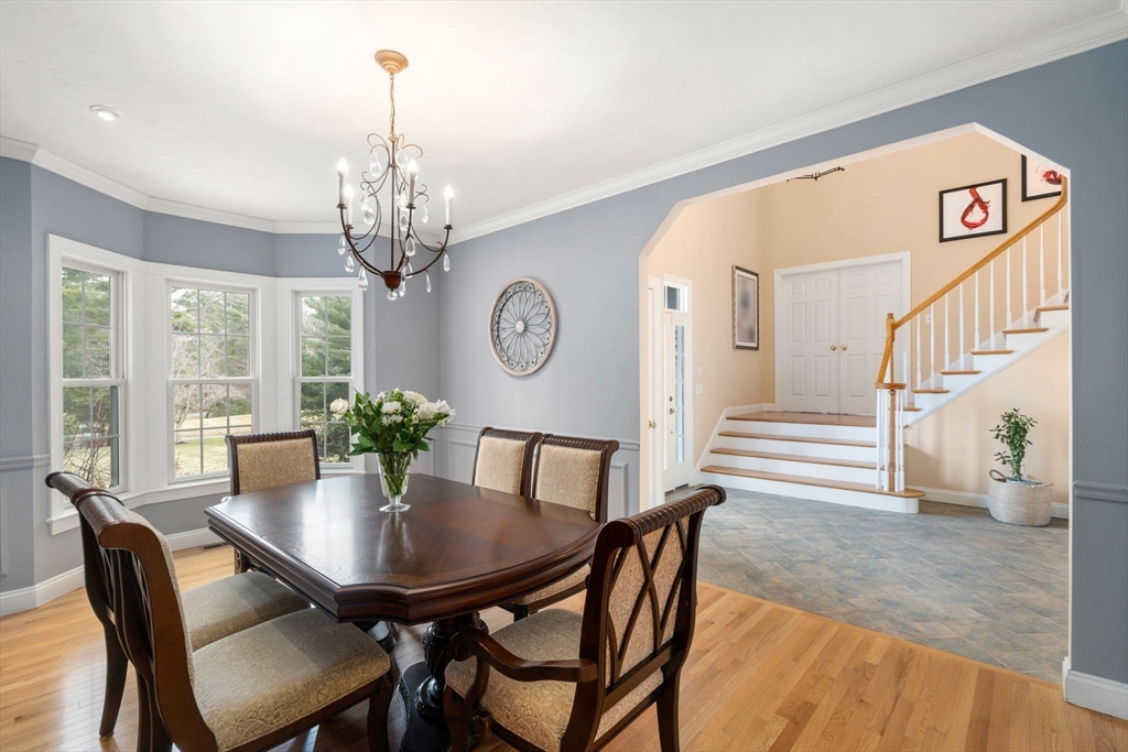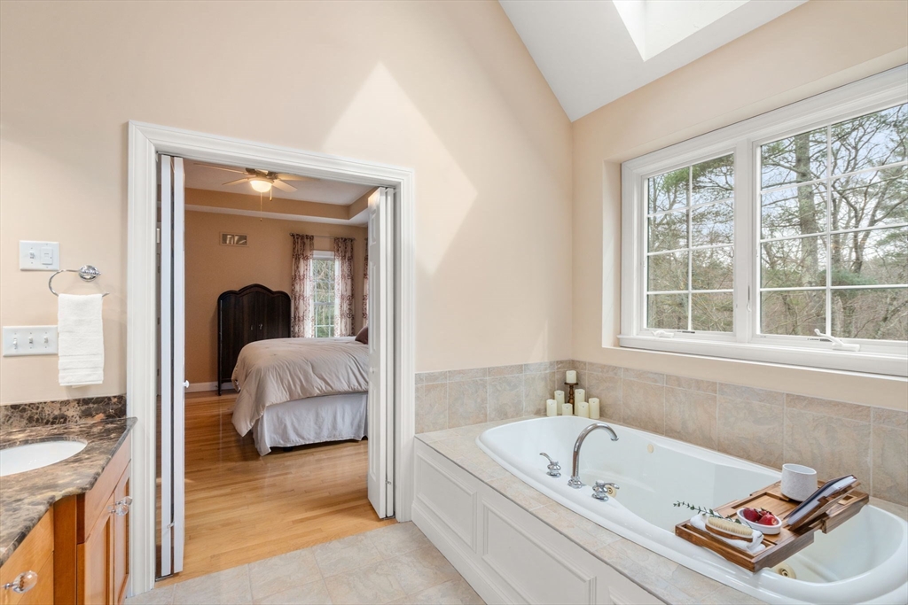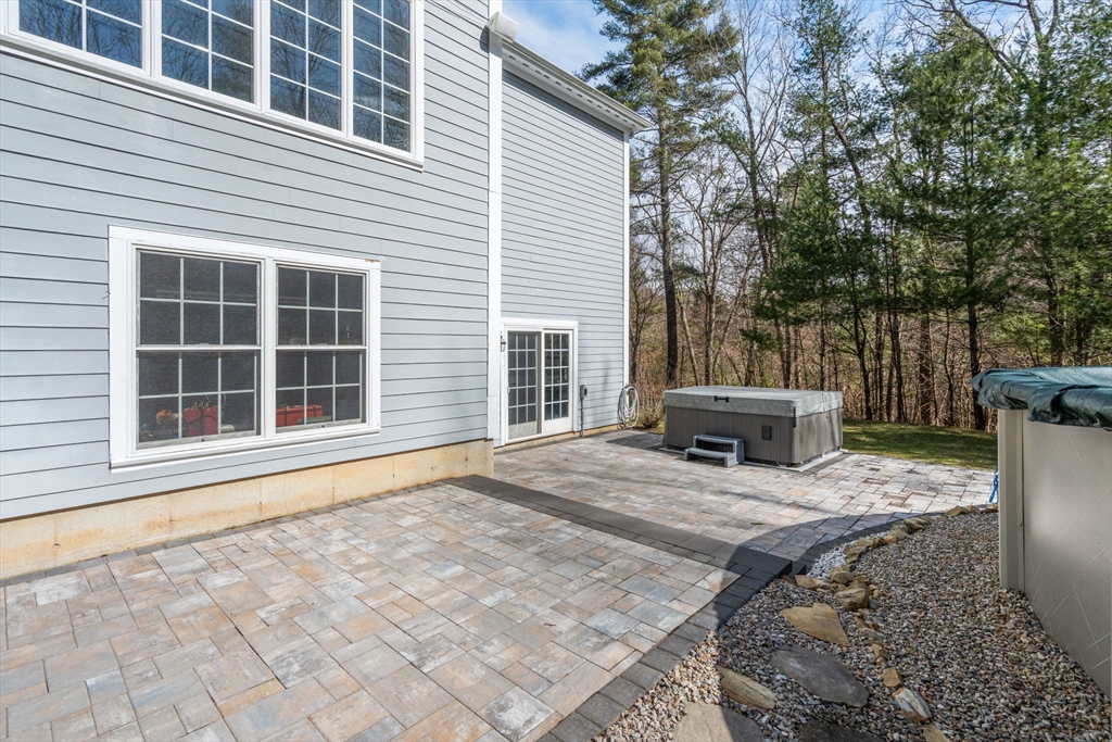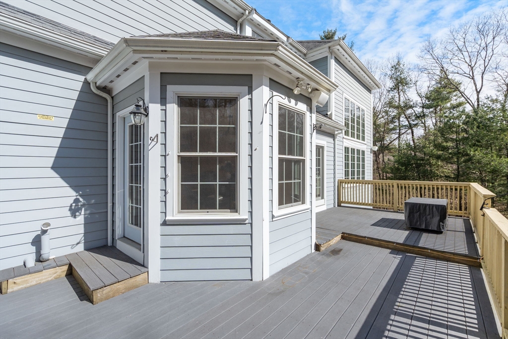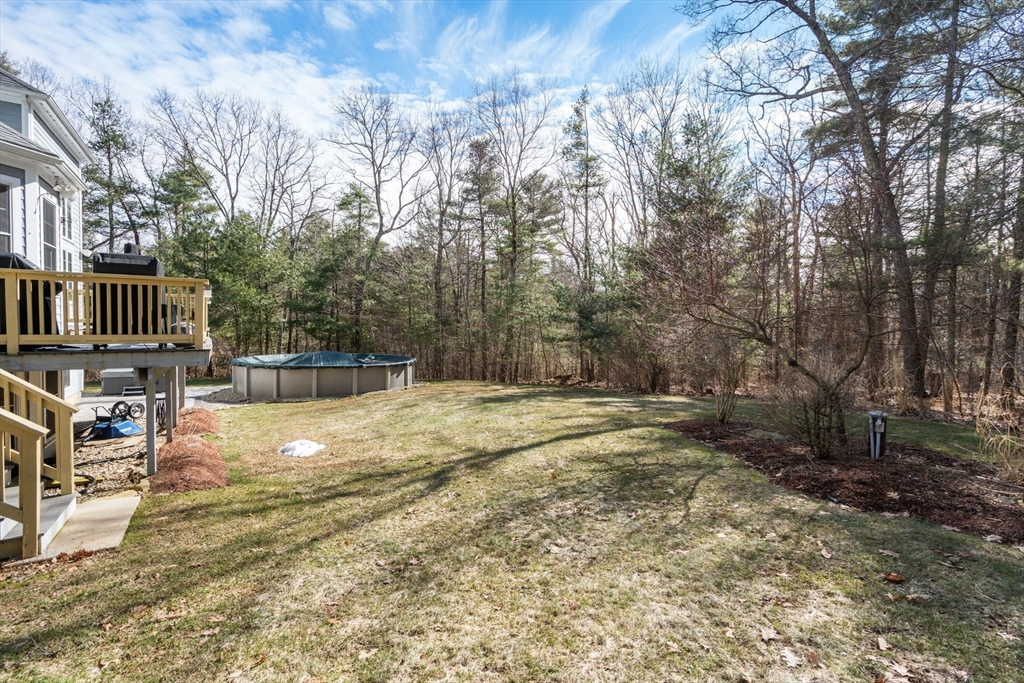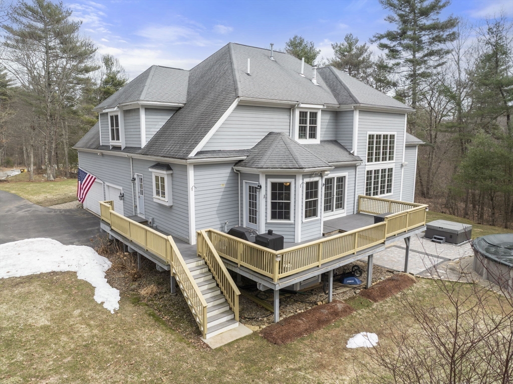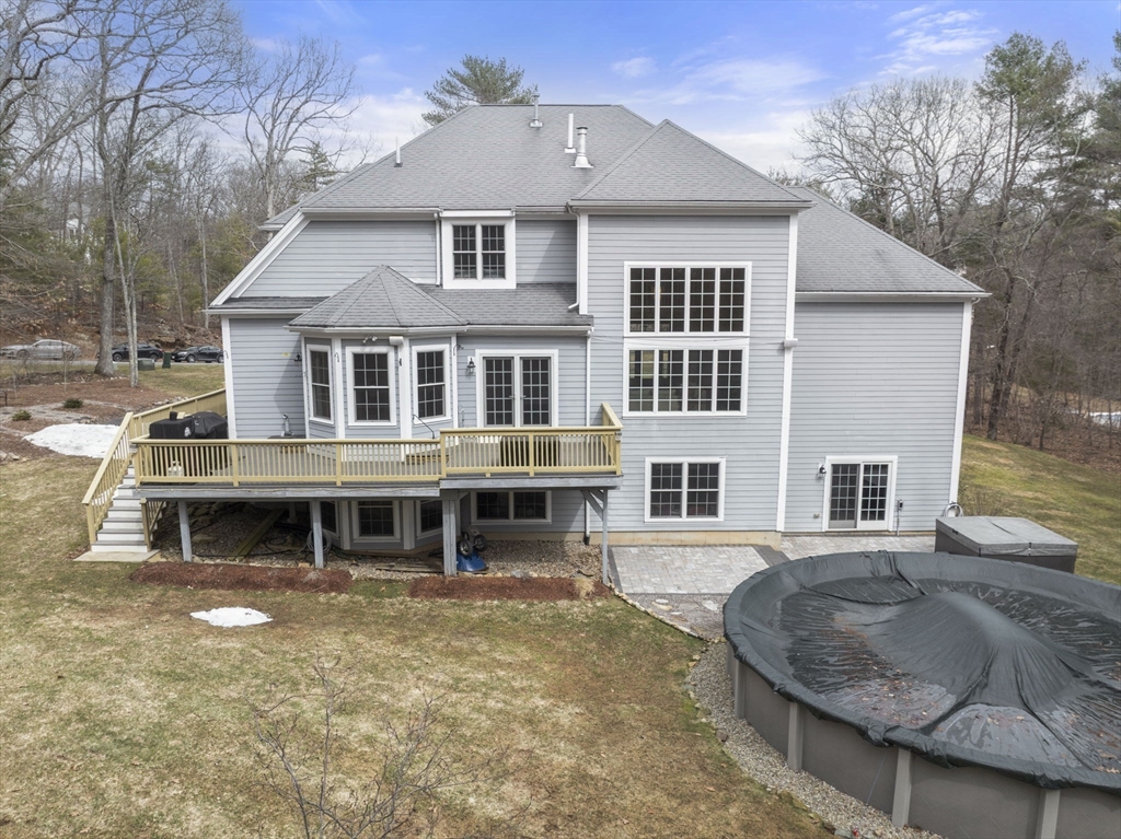 Privately set on a wooded cul-de-sac, custom colonial offers indoor-outdoor living. Situated on 4+ acres w/expansive lawn, mature plantings & irrigation, grounds are complemented by a wraparound deck, patio, hot tub & heated above-ground pool, creating a retreat-like setting. Interior is filled w/natural light & defined by an open, airy layout w/hardwoods thru-out 1st flr. 2-sided fireplace connects LR, framed by a dramatic wall of windows, to kitchen, creating a seamless flow for everyday living. Kitchen is well-appointed w/ lg island, gas cooktop, stainless appliances, pantry & sunlit breakfast nook. DR: detailed millwork & bay window adds an elegant touch. Primary is privately positioned just above the main level & features a dedicated office/sitting rm, tray ceiling, walk-in closet & spa-inspired bath. 2nd floor en-suite bedrm w walk-in closet & vaulted ceiling. 2 additional bedrms share a jack-jill bath. Bonus rm, Side-entry mudrm w/laundry. Walk-out basemnt w/potential to finish.