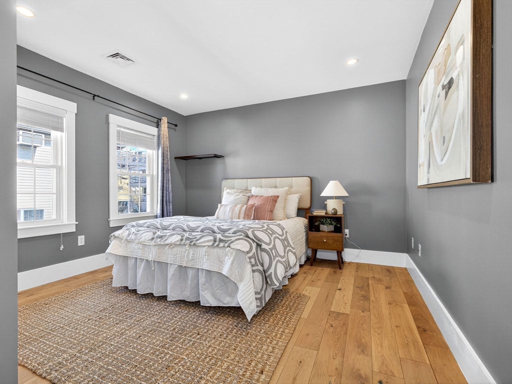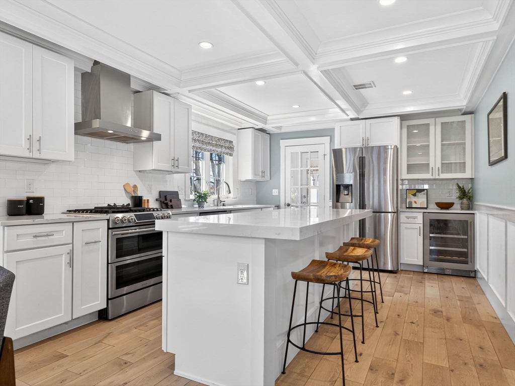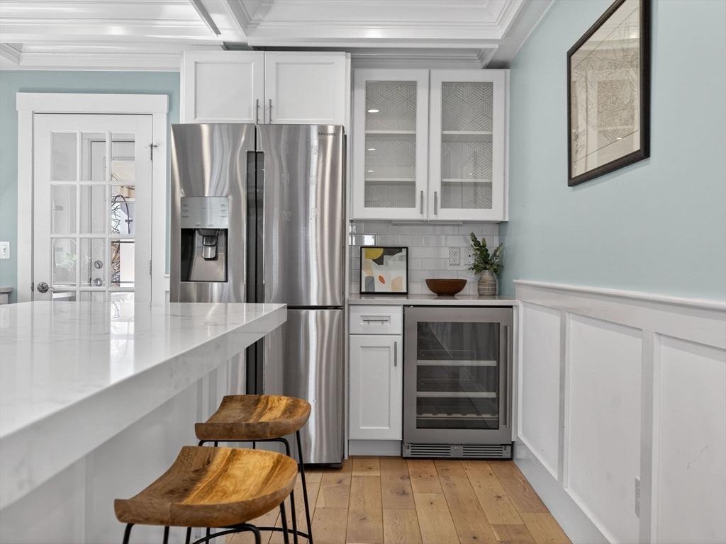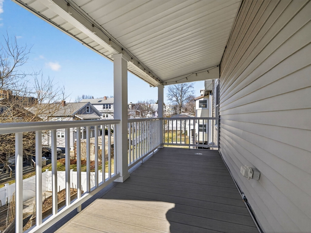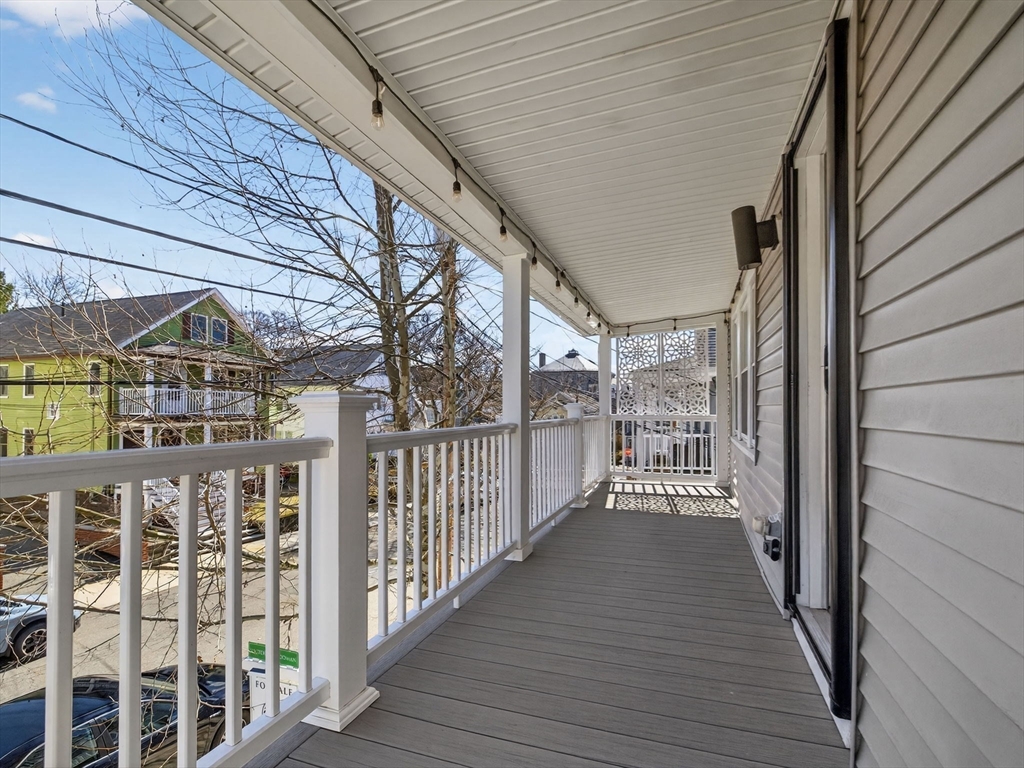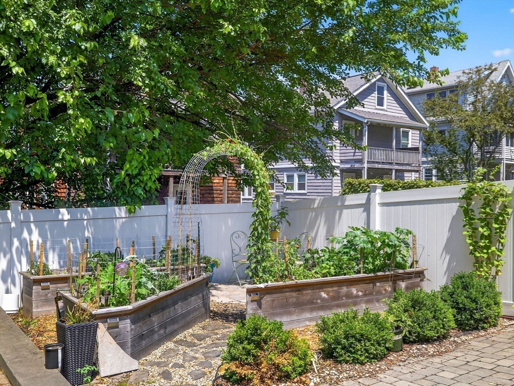 Nestled on a quiet, one-way residential street between Teele and Davis Square, this top-level condo blends luxury with an unbeatable location. Offering 3 bedrooms and 2 full baths, the home features an open layout with coffered ceilings, a gas fireplace, and designer finishes throughout. The kitchen shines with an oversized island, stainless steel appliances, and a beverage nook—perfect for entertaining. Enjoy private front and back decks ideal for relaxing at the end of the day. The upper level includes a flexible bonus area and a spacious primary suite with a large walk-in closet and ensuite bath with heated floors. Complete with in-unit laundry, storage, one deeded parking space and a private garden space all just minutes from the Red Line, restaurants, shops, parks, and the bike path
