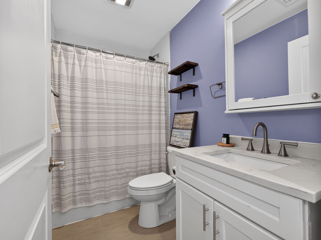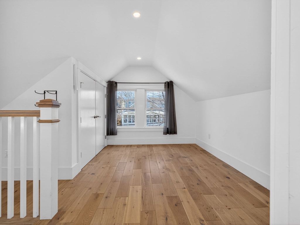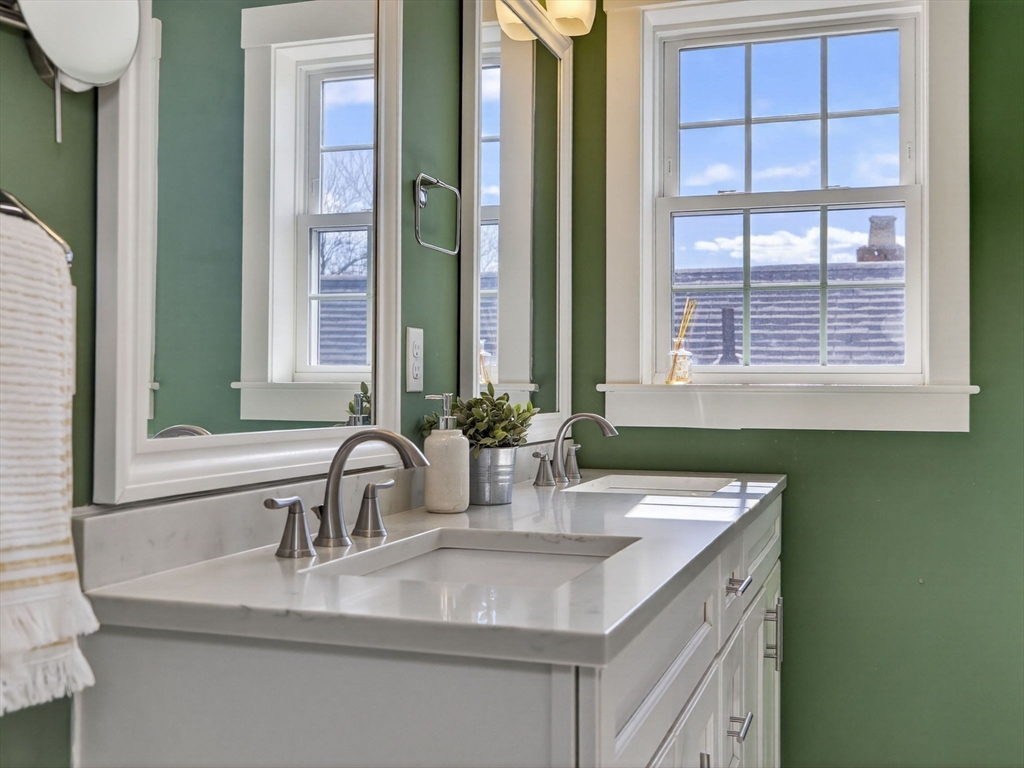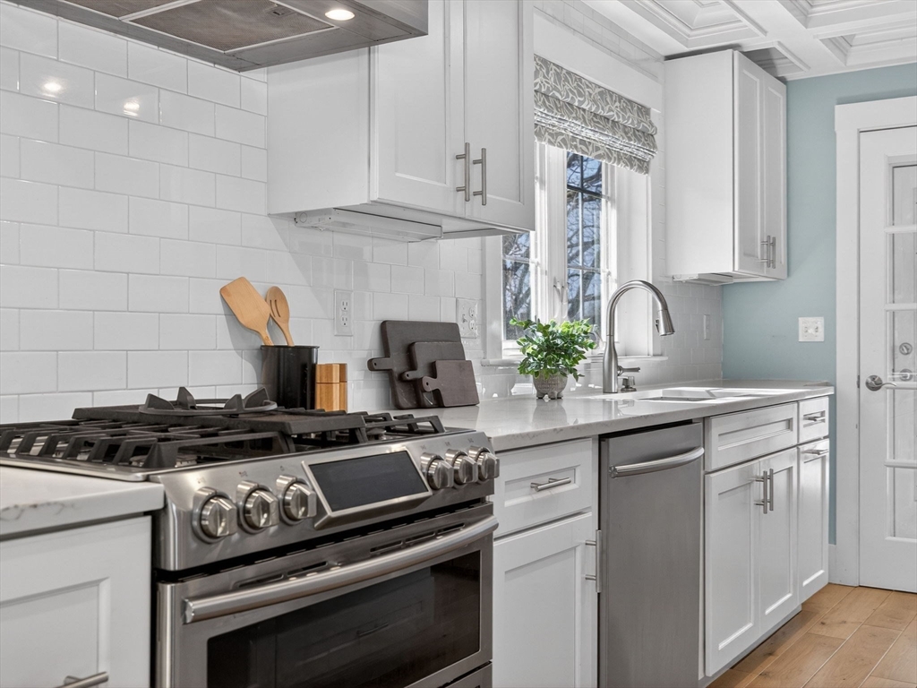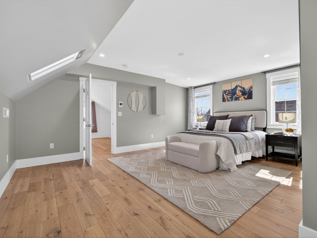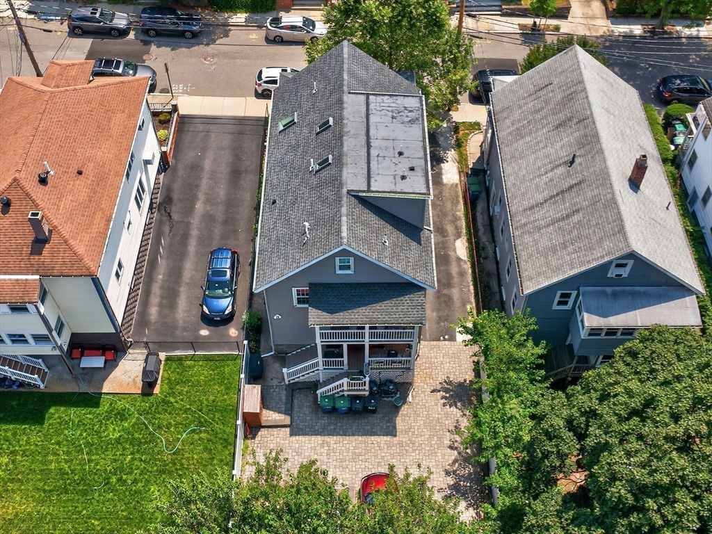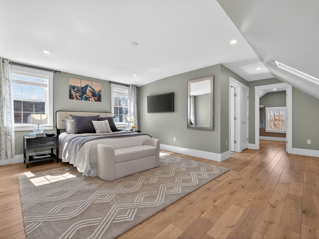 Nestled on a quiet, one-way residential street between Teele and Davis Square, this top-level condo blends luxury with an unbeatable location. Offering 3 bedrooms and 2 full baths, the home features an open layout with coffered ceilings, a gas fireplace, and designer finishes throughout. The kitchen shines with an oversized island, stainless steel appliances, and a beverage nook—perfect for entertaining. Enjoy private front and back decks ideal for relaxing at the end of the day. The upper level includes a flexible bonus area and a spacious primary suite with a large walk-in closet and ensuite bath with heated floors. Complete with in-unit laundry, storage, one deeded parking space and a private garden space all just minutes from the Red Line, restaurants, shops, parks, and the bike path