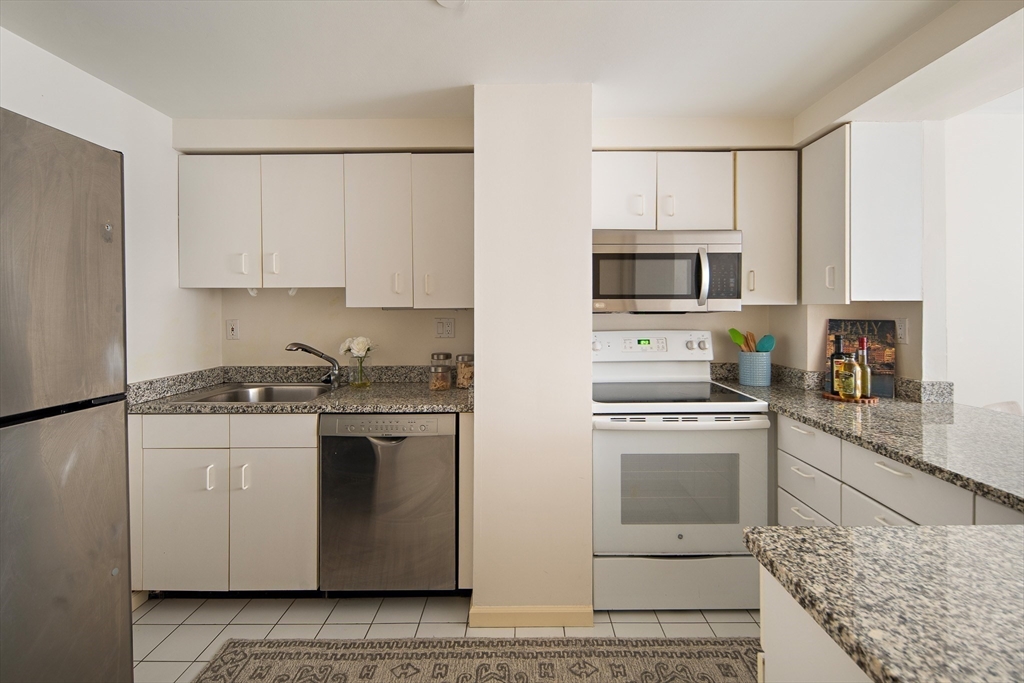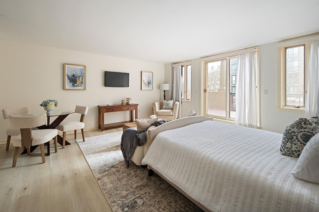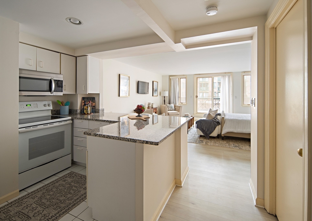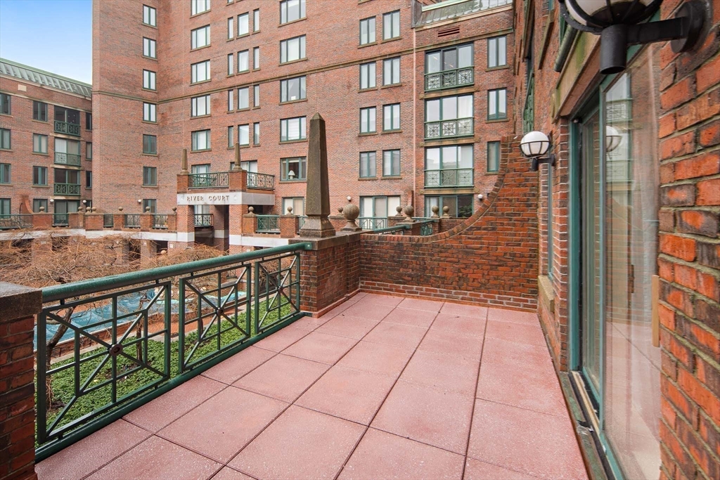 Spacious & unique 644 sq ft studio residence at River Court with exceptional courtyard and fountain views, featuring a private balcony significantly expanding the living area. A wall of windows fills the home with natural light. Large white kitchen with s/s appliances & granite counters. Neutral luxury vinyl tile flooring. Excellent storage including substantial walk-in-closet + private storage locker. Full marble bath with tub and shower. In-unit laundry. Central air. 1 garage parking. River Court amenities include 24-hr concierge, prof. management, 6 elevators, indoor lap pool, fitness center, sauna, landscaped courtyards w/seating, bike storage, guest pkg, two furnished guest suites, and roof deck with panoramic Boston and Cambridge views. Prime Kendall Sq location near the Charles River, dining, shopping, MBTA, MIT, Harvard, life-science hubs, and easy access to Boston and highways. Seller to pay special assessment. First showings @ OH Sat. 3/28. Offers due Wed. 4/1 @ 2.