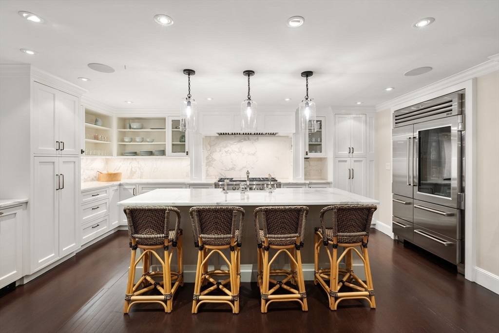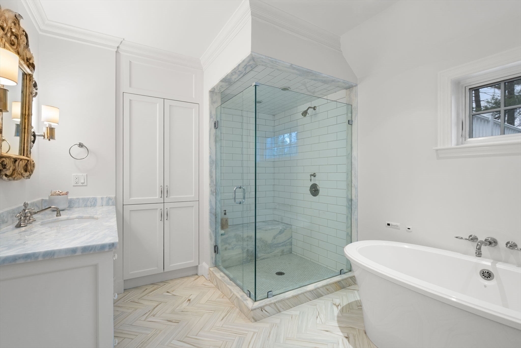 Incredible custom renovated 5 bedroom home that has undergone significant upgrades making this one of Wellelsey's sought after properties. White washed brick face exterior with pea stone drive and parking court all trimmed in cobblestone creates a gorgeous approach. Stunning 2 story foyer with herring bone floors greets you into this welcoming 7300 sq ft space on nearly one acre of flat and private land! Kitchen with island and banquette dining area opens into family room with fireplace and wall of built-ins. Cozy den with more built-ins and fireplace. First floor main bedroom with fabulous walk-in closet and spa-like bath. Mudroom off of garage. 2nd floor w/ secondary main bedroom, sitting area and walk-in closet. 3 additional bedrooms all similar in size with 2 more baths. Office area completes the 2nd floor. Lower level with huge playroom, exercise room plus large storage room. Blue stone patio with firepit and built-in grill. Enjoy the Peirce Estate neighborhood w/ an easy commute.