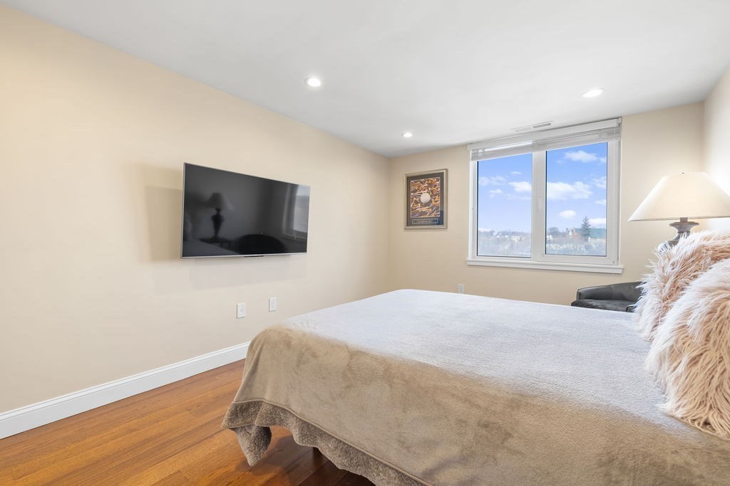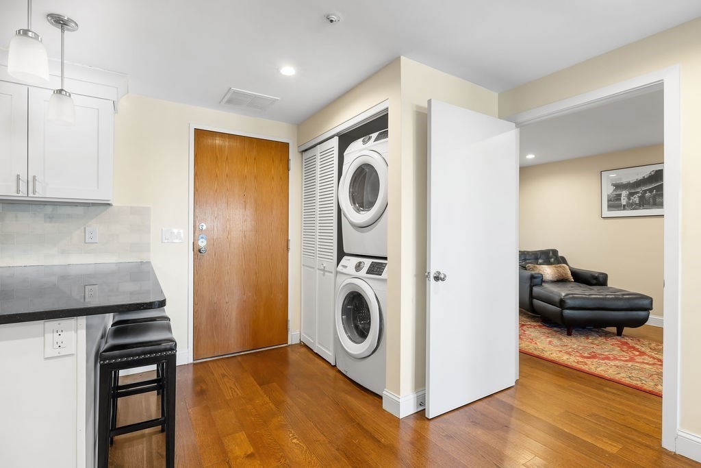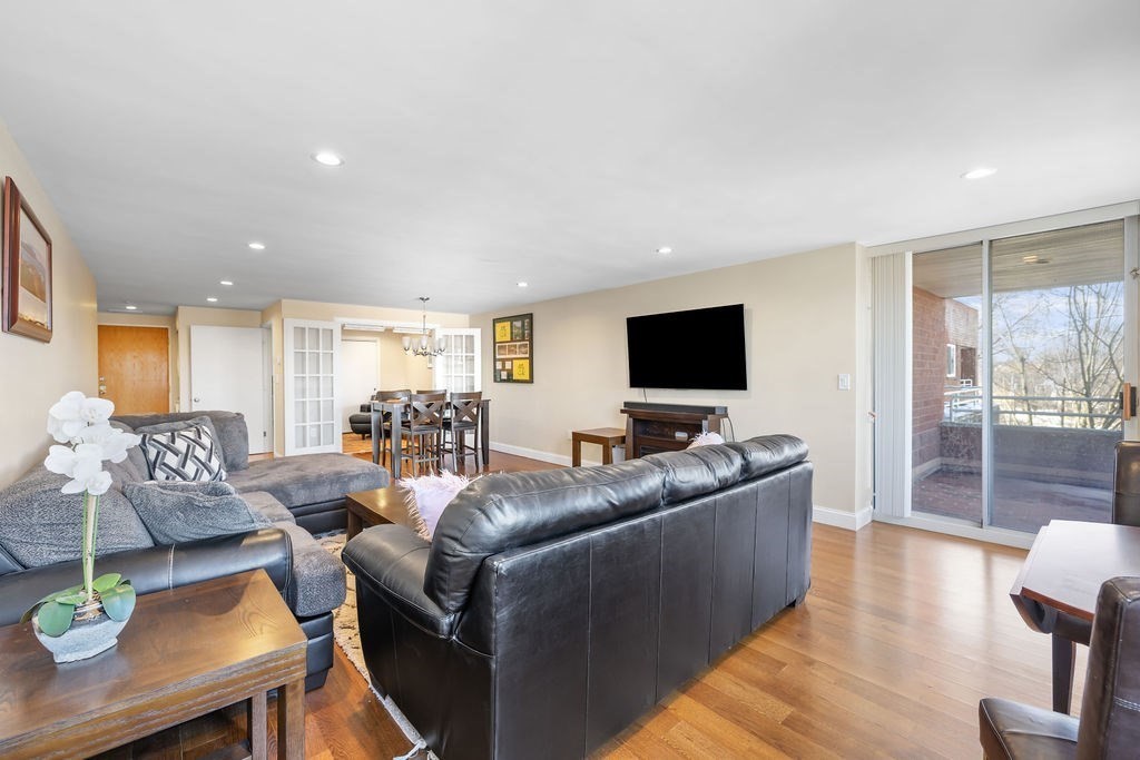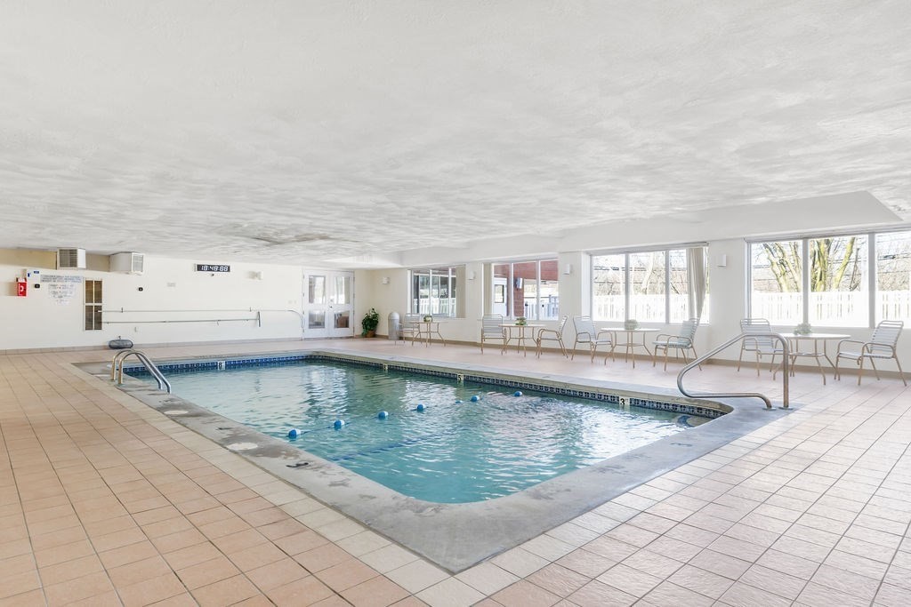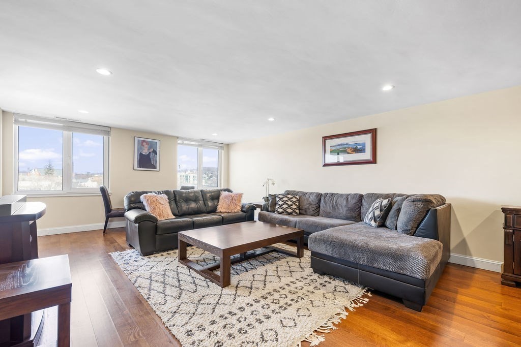 Welcome to Waterbridge! Located in the heart of Watertown Square, this spacious one bedroom, one bathroom condo offers a special opportunity to live comfortably in close proximity to city amenities, parks and open space. This fourth floor unit was beautifully renovated in 2017 with a thoughtfully designed kitchen including granite countertops, stainless steel appliances and sleek soft-close shaker-style cabinetry. From the entry, the kitchen flows seamlessly to dining and living spaces which enjoy bright indirect sunlight from large windows. An adjoining office with a large closet and French doors offers many possible uses. Off the living area is the private covered patio, boasting open-sky views overlooking the Charles River and the city to the north and west. The bedroom and closet are generously sized as well. A deeded covered parking spot with elevator access ensures ease and accessibility. Building amenities include indoor heated pool, exercise room, locker rooms and saunas.