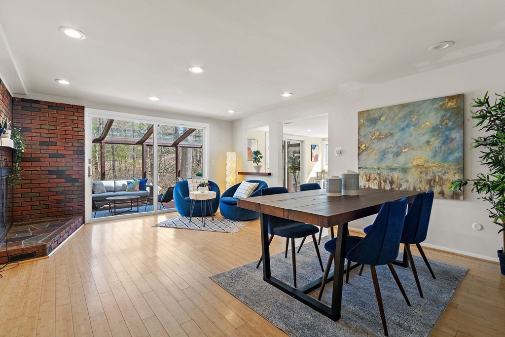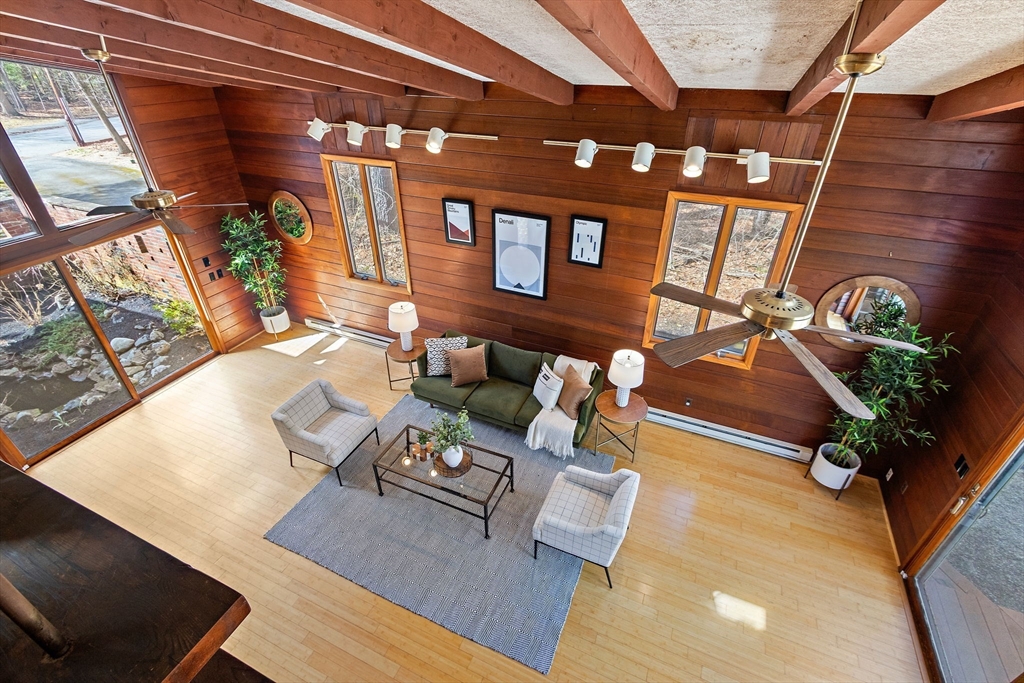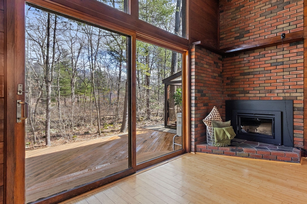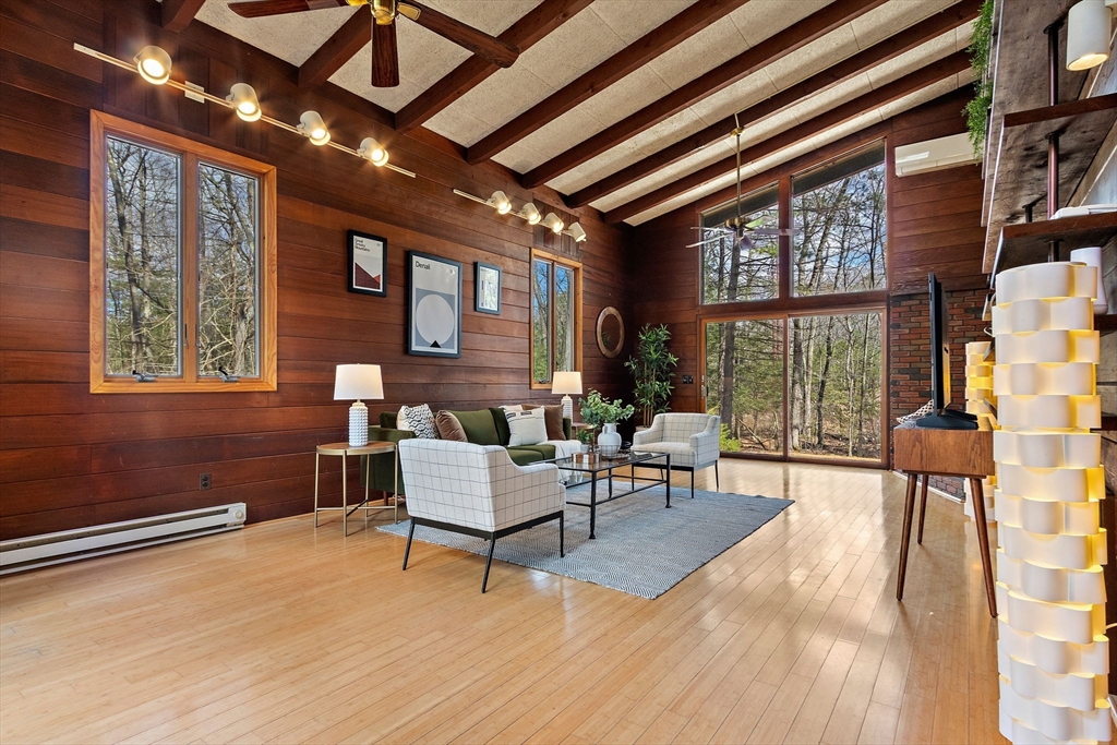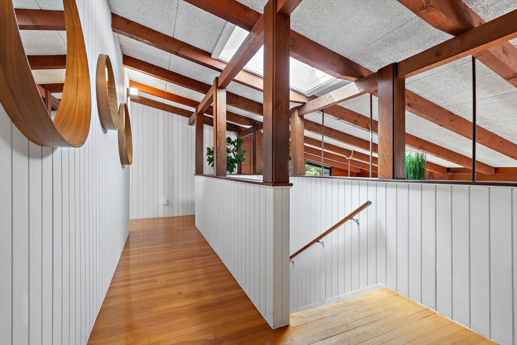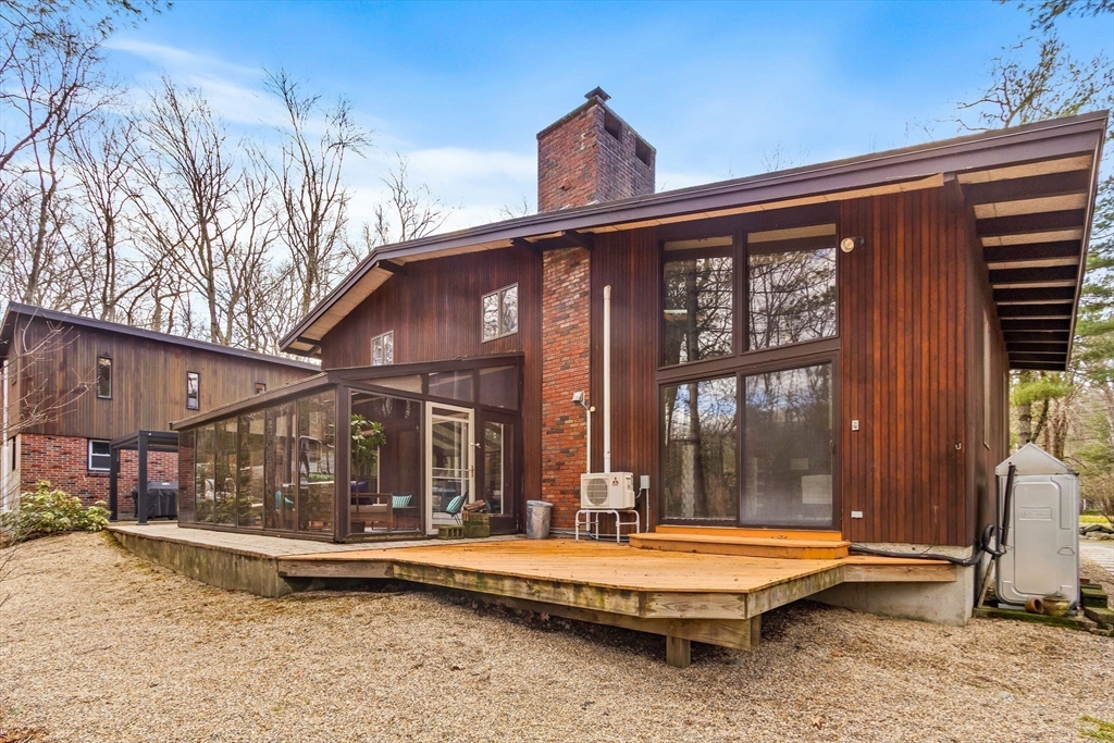 Tucked into nearly an acre of mature trees in Lexington’s Turning Mill neighborhood developed by architect Walter Pierce, this distinctive mid-century modern style home offers privacy, character and upgrades throughout. Clean lines and expansive windows fill each room with natural light creating a connection to the surrounding landscape. Thoughtfully designed for both gathering and retreat, you’ll enjoy generous living and dining areas, a welcoming Great Room with 15ft ceiling anchored by a dramatic double-sided fireplace, large sunroom, updated kitchen and baths. Five bedrooms spread across the upper level, including a primary with ensuite. The detached heated/cooled CARRIAGE HOUSE features a home gym and spacious second-level bonus area for exceptional flexibility. Enjoy peaceful wooded views, oversized stone patio, attached two-car garage, bonded membership at Painted Rock community pool and close proximity to conservation land, trails, commuting routes, and award-winning schools.