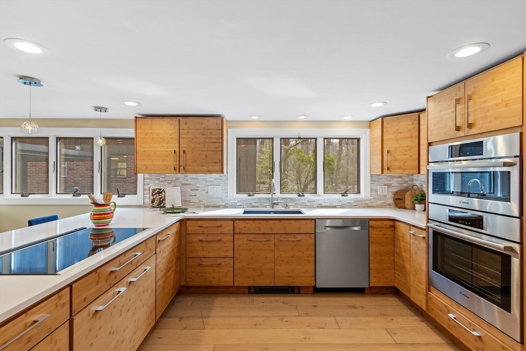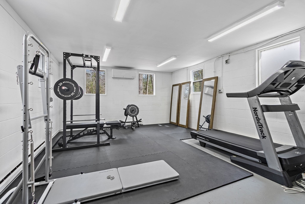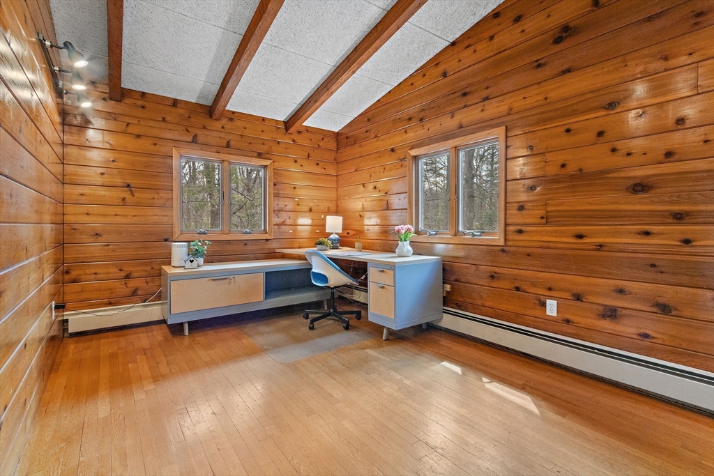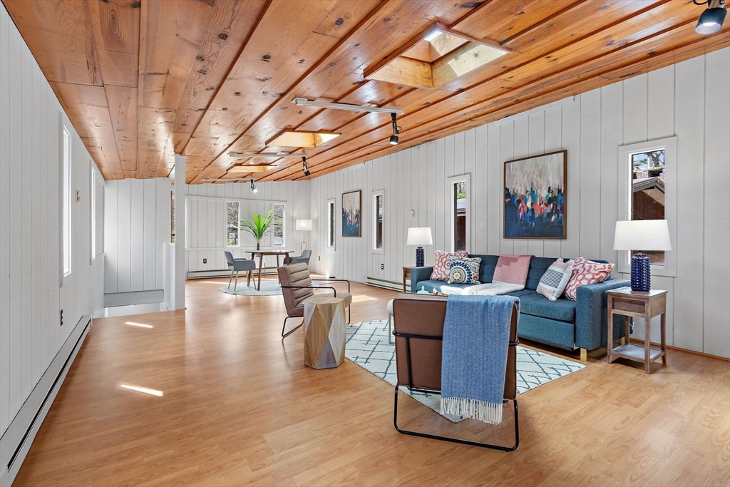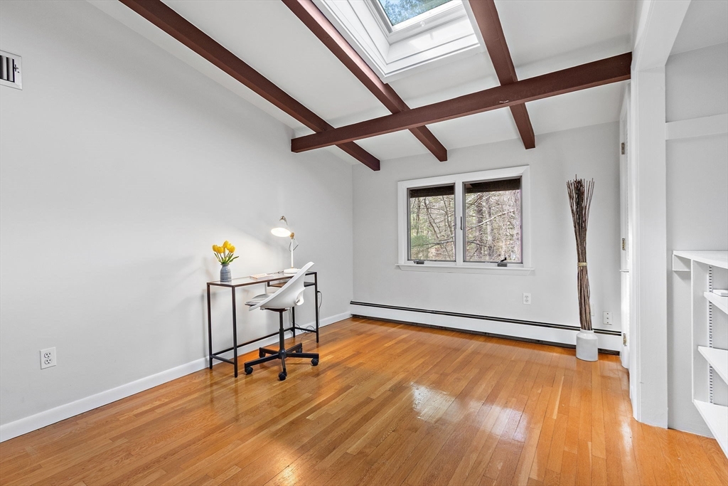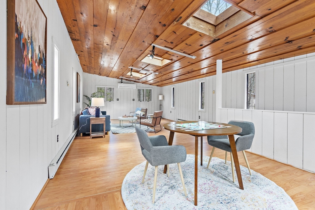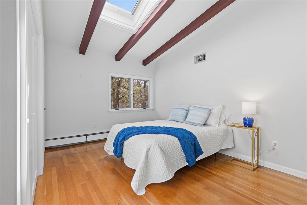 Tucked into nearly an acre of mature trees in Lexington’s Turning Mill neighborhood developed by architect Walter Pierce, this distinctive mid-century modern style home offers privacy, character and upgrades throughout. Clean lines and expansive windows fill each room with natural light creating a connection to the surrounding landscape. Thoughtfully designed for both gathering and retreat, you’ll enjoy generous living and dining areas, a welcoming Great Room with 15ft ceiling anchored by a dramatic double-sided fireplace, large sunroom, updated kitchen and baths. Five bedrooms spread across the upper level, including a primary with ensuite. The detached heated/cooled CARRIAGE HOUSE features a home gym and spacious second-level bonus area for exceptional flexibility. Enjoy peaceful wooded views, oversized stone patio, attached two-car garage, bonded membership at Painted Rock community pool and close proximity to conservation land, trails, commuting routes, and award-winning schools.