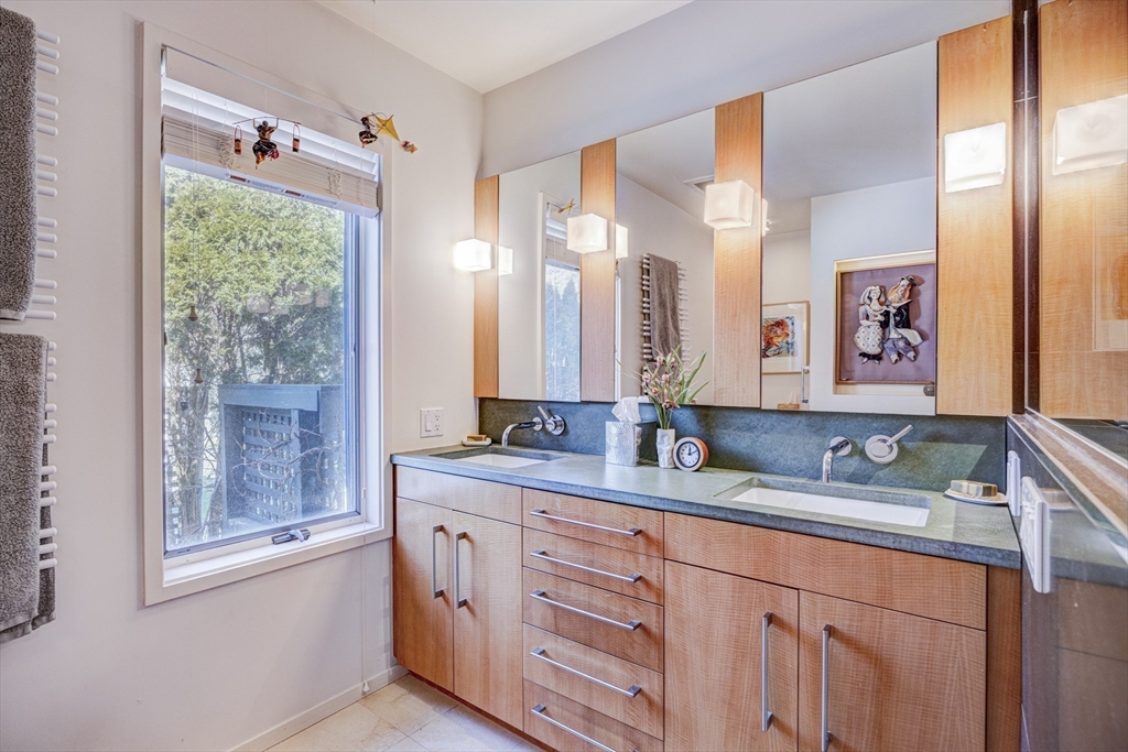 Stunning, fully renovated residence in the highly sought-after Ledgebrook community, offering modern design and exceptional comfort. This elegant home features high-end kitchen with stainless steel appliances and an open floor plan with dining area and a dramatic cathedral-ceiling living room with gas fireplace opening to a private backyard. The first-floor primary suite offers comfort and convenience with radiant heated bathroom floors. A stacked W/D on the main level adds everyday ease. The second level includes two generous bedroom suites with large closets and modern baths, plus a large home office with built-in cabinets. The finished lower level offers versatile space ideal for a home gym or entertainment area, with a full bathroom, additional storage, and a full-size W/D. One-car garage, private deck, and peaceful backyard complete this special home. Ledgebrook residents enjoy clay tennis courts, private swimming pool, and a clubhouse with kitchen, pool table, and ping-pong table
