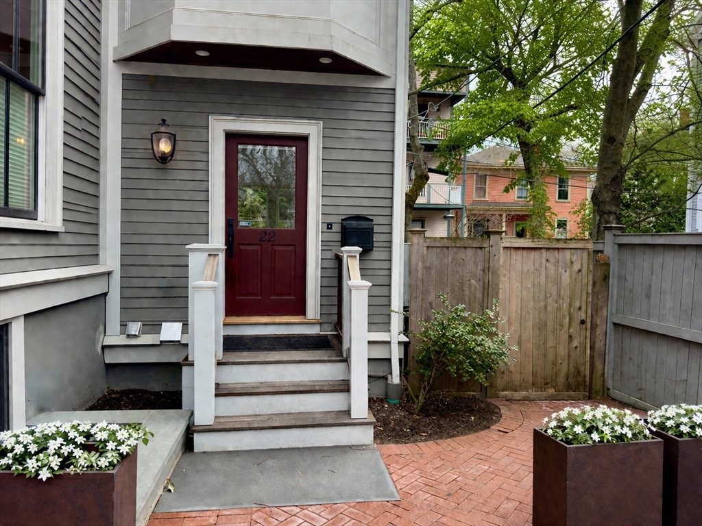 Spanning three levels in the heart of Mid-Cambridge, this serene rear townhouse opens from a private entrance to a main level with living & dining rooms, chef’s kitchen, powder room, and direct access to a fenced garden with bluestone terrace. The living room features walnut floors, 9-foot ceilings with crown moulding, and a gas fireplace with stone surround and custom built-ins, while the adjacent bay-windowed dining area seats 6-8. The kitchen includes Carrara marble counters, a Wolf dual-fuel range, Sub-Zero refrigerator, integrated Bosch appliances, and breakfast bar seating. Upstairs, the primary suite features a bay window, custom closets including a walk-in, and a Carrera marble bath with skylights, double vanity, soaking tub, and glass-enclosed shower. Two additional bedrooms and a full bath complete the second floor. The finished lower level offers a media/family room, guest en-suite bedroom, laundry & utility closet. Two tandem parking spaces & ADT security complete the home.