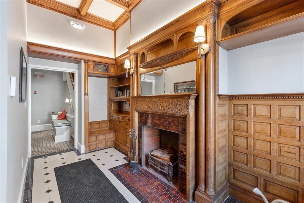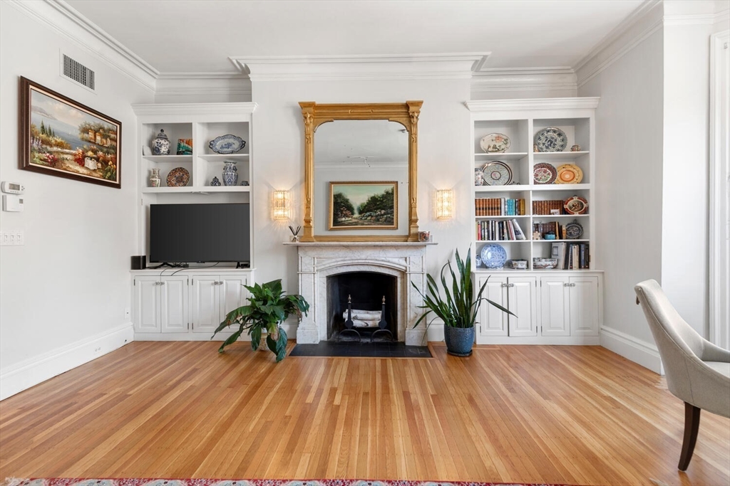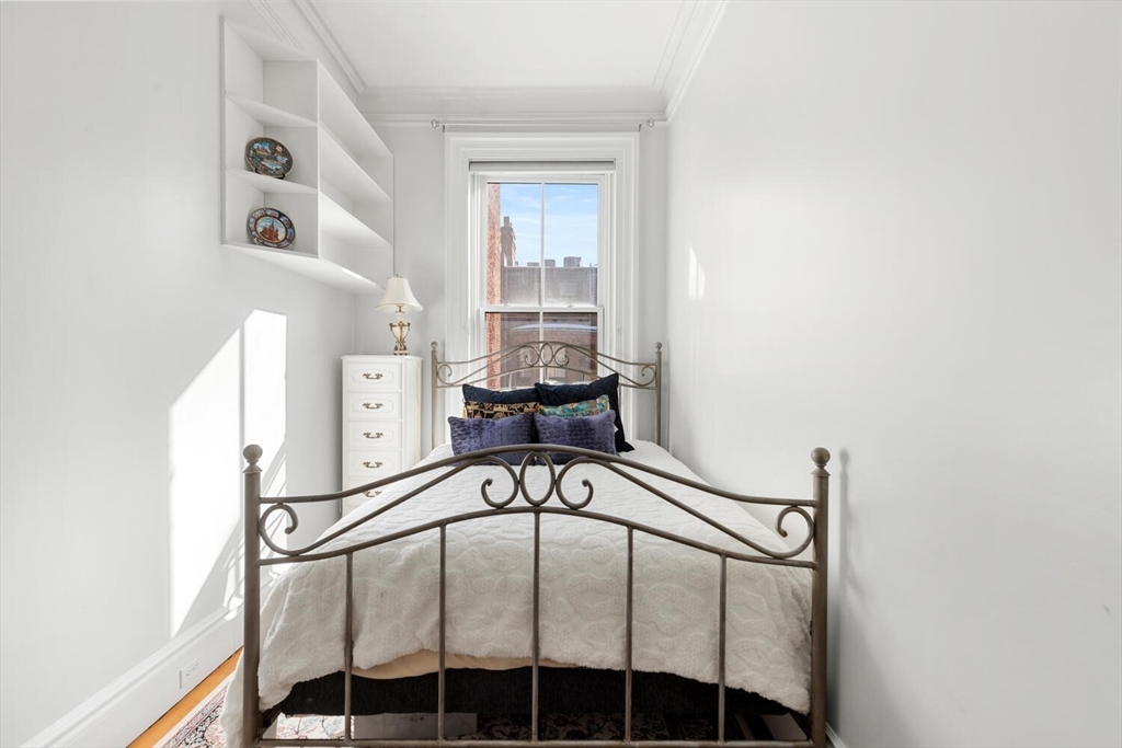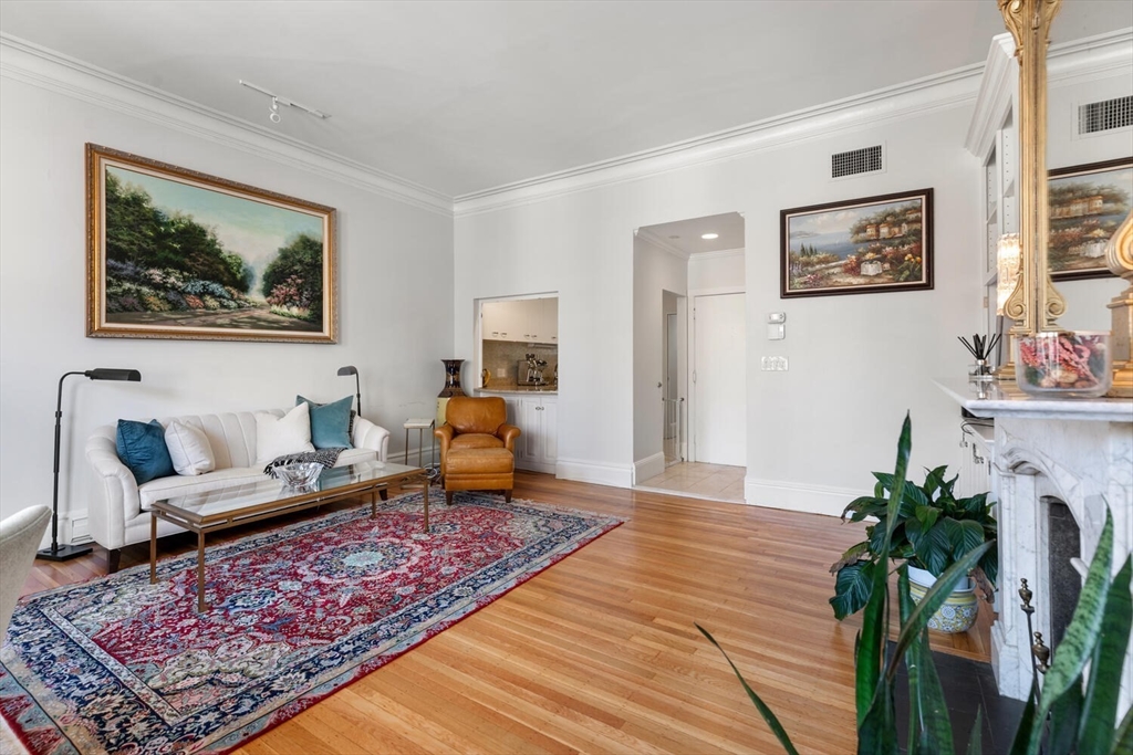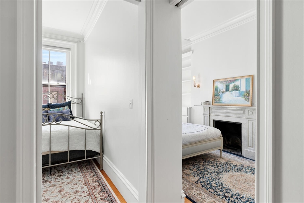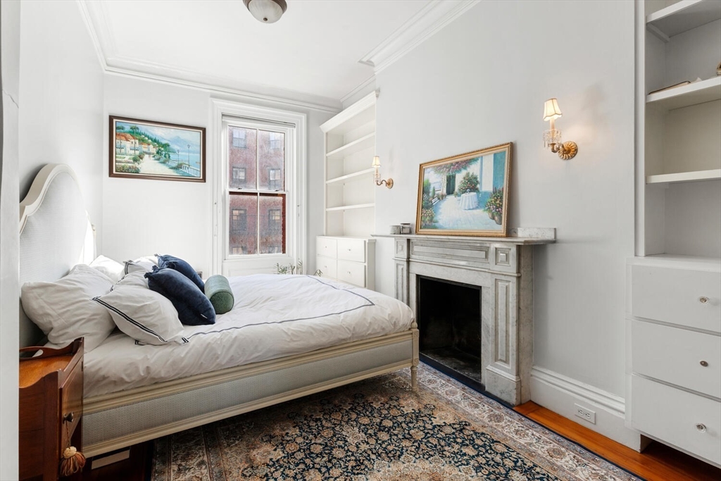 Sunny floor-through 2-bedroom, 1-bath residence with tall ceilings and refined detail throughout. The spacious living and dining room is illuminated by oversized windows, flooding the home with natural light, while custom built-ins surround an ornate decorative fireplace. The fully outfitted kitchen has a dishwasher and pass-through opening that enhances light and flow. A generous walk-in closet at the entry offers exceptional storage for coats, shoes, and luggage. The bathroom features dual pocket doors, built-in shelving, and a sleek stand-up shower. The primary bedroom showcases a tall window, custom built-in shelves and drawers, and a decorative fireplace, while the second bedroom/office offers flexibility. IN UNIT WASHER AND DRYER complete this home. Set in a charming Back Bay brownstone with an original millwork lobby, moments from the Esplanade, Green Line, and some of Back Bay’s best dining and shopping. Nearby rental parking available. Small dogs considered.