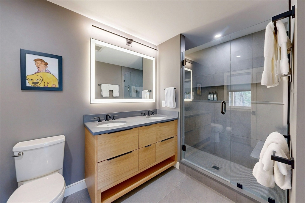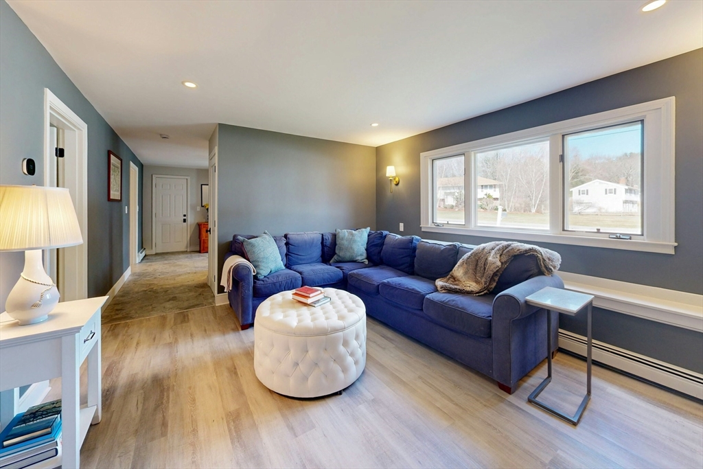 Nestled on a quiet cul-de-sac in the sought-after Hardinghood neighborhood, this beautifully renovated contemporary home offers both privacy and style, backing onto protected land. Thoughtfully redesigned, every detail has been carefully considered. A bright, spacious foyer welcomes you, and leads you to a cozy fireplaced family room. The stunning and private primary suite features generous closets, custom built-ins, and a luxurious new en-suite bath. The sunlit living room flows seamlessly into the dining area and a stunning updated kitchen, complete with quartz “wet concrete” countertops, stainless appliances, and a sleek and inviting breakfast bar. A desirable vaulted four-season sunroom opens to a composite deck overlooking the level yard and the serene and natural surroundings. Three additional bedrooms with ample storage, complemented by an updated full bath complete this level. Enjoy a friendly, walkable neighborhood with access to trails, Bellforge and the Kingsbury Club.