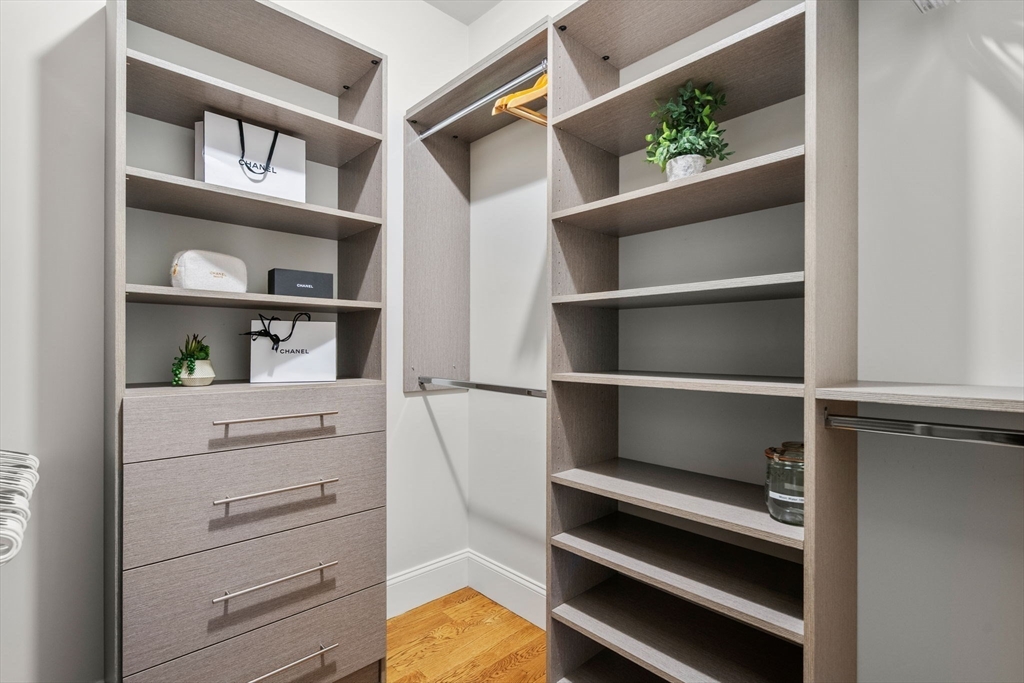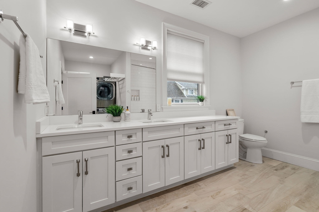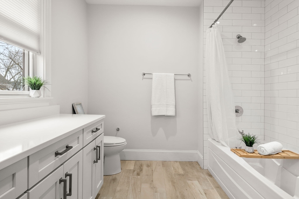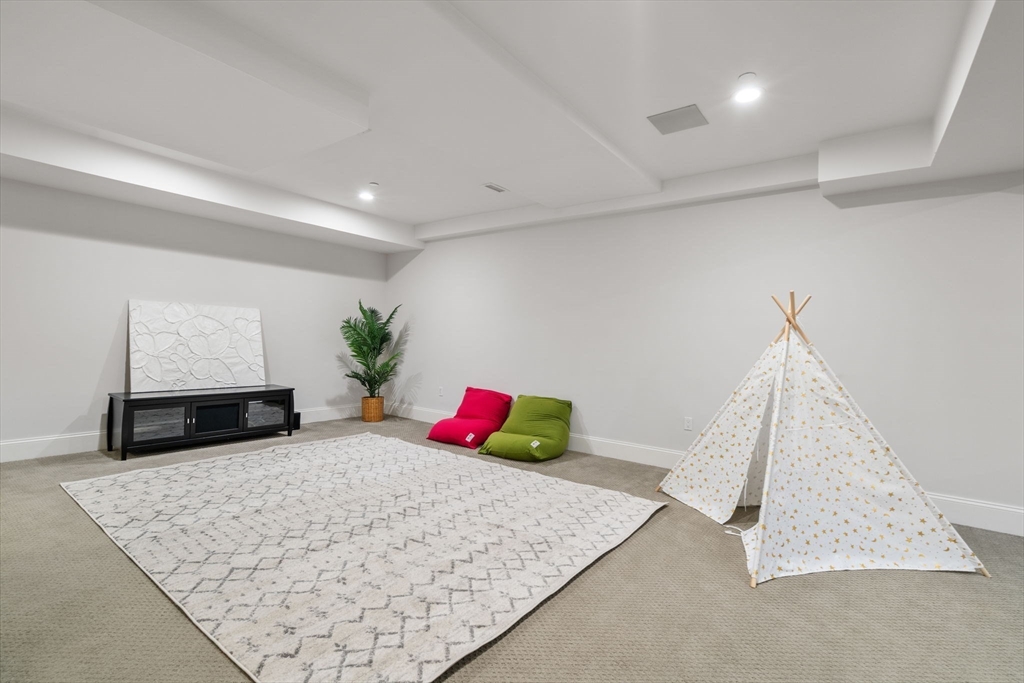 This sophisticated 4-5 bedroom, 4 bath townhouse nestled on a tree lined side street, just minutes from the commuter rail and express bus to Boston lives like a single family home. Through the welcoming foyer is a sophisticated home office, a 3/4 bath and mudroom to the 2 car garage. Continue to the elegant living area, bathed in natural light from oversized Pella windows and doors. The modern kitchen features white shaker cabinetry, quartz countertops, stainless steel appliances and flows seamlessly into the living and dining areas with ~10’ ceilings, gas fireplace, and built-in bookcases. Step out to your private stone patio and fenced yard—perfect for entertaining or unwinding. Upstairs, the primary suite offers a peaceful retreat with a private bathroom and custom walk-in closet. Two additional bedrooms, a large bonus room, and a family bathroom with laundry complete this level. The finished lower level adds a bedroom and huge flexible space ideal for a media or fitness area.