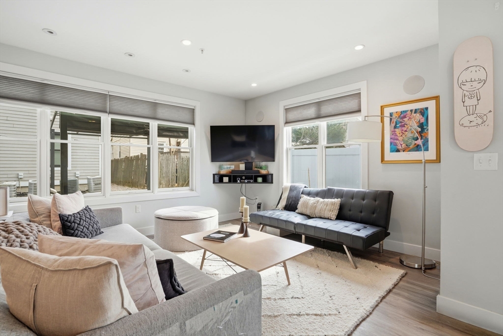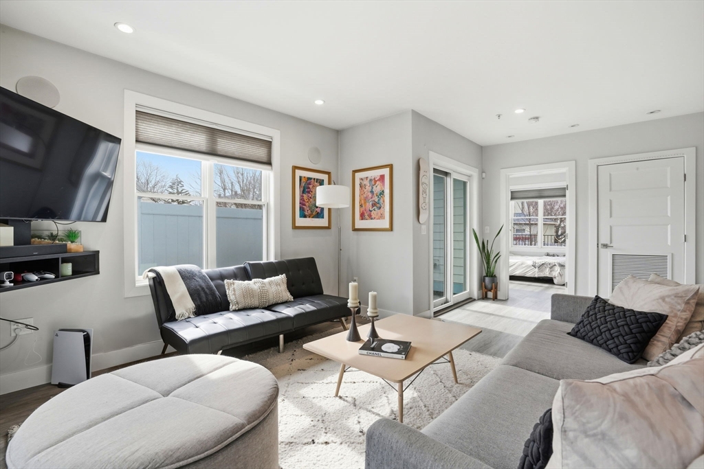 Welcome to The Gateway at 151 Hancock Street, a premier luxury condominium community in North Quincy. This thoughtfully designed 2-bedroom, 1-bath garden-level home features an open floor plan, and a stylish and functional kitchen with quartz counters and stainless steel appliances. Central air and surround sound extend throughout the unit, while oversized closets provide plenty of storage. Enjoy your private wraparound deck with custom pergola, perfect for relaxing with your morning coffee or entertaining guests in the evening. This unit comes with two deeded parking spaces — one in the garage and one in the driveway — along with additional building amenities including an elevator, and a common roof deck with sweeping views. Ideally located moments to the North Quincy T stop, shopping, dining and Wollaston Beach. A rare opportunity to own in one of Greater Boston’s most desirable locations!