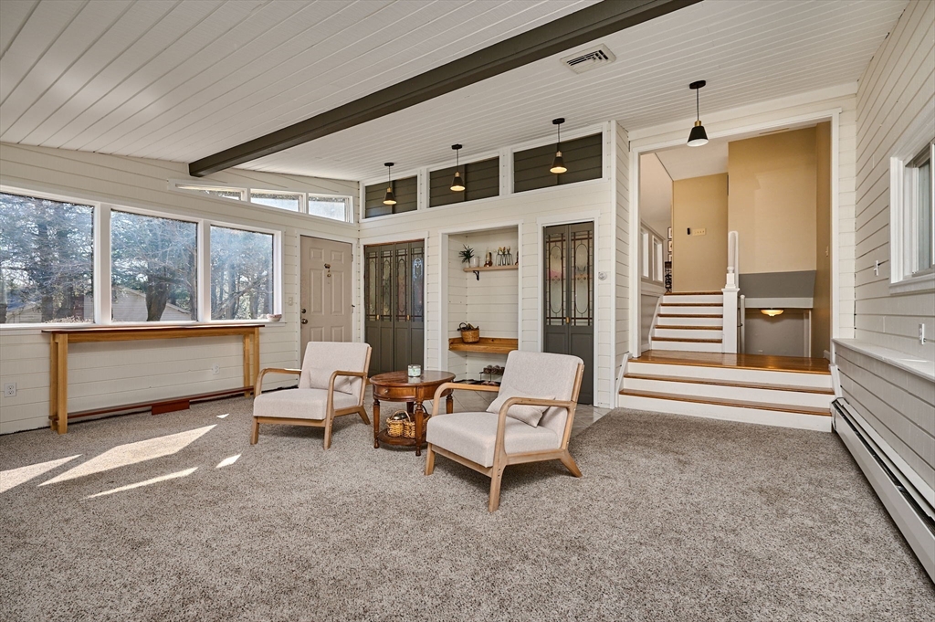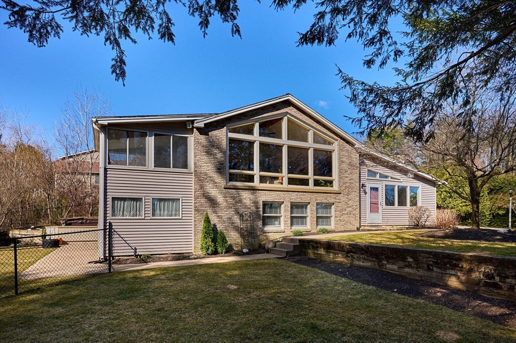 Beautiful Contemporary home with abundant, versatile living spaces! Step into the freshly painted family room with a cozy pellet stove and built-in bench for shoes & coats, then move into the main living area where cathedral ceilings and a wall of large windows flood the space with natural light over beautiful wood floors. The open-concept living/dining area leads to a sunny 3-season porch overlooking a landscaped backyard with an above-ground pool, outdoor shower, and patio. The main level also includes the kitchen with ample cabinetry, two bedrooms and a full bath with a Jacuzzi tub. The lower level offers two additional bedrooms, another full bath, and a walk-out basement, ideal for storage or potential additional living space. Recent updates and features include a newer roof (2023), irrigation system, central air, natural gas utilities, and fresh paint throughout. Expect to be impressed!