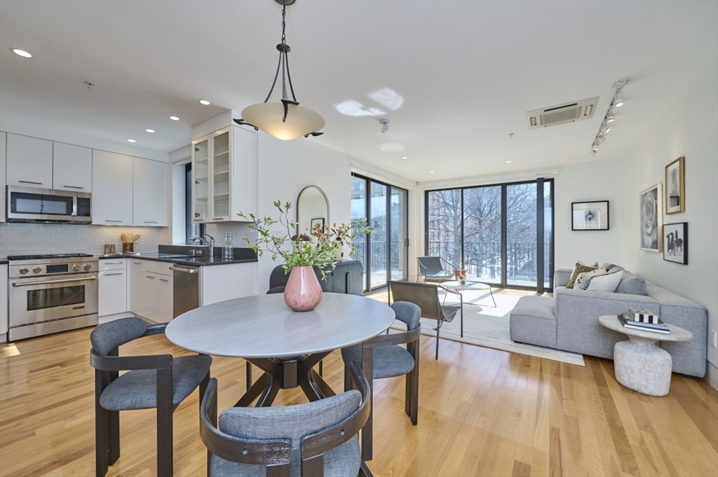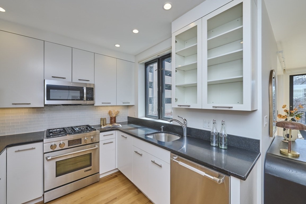 This sophisticated 2 bedroom 2 bath condo offers an exceptional Cambridge lifestyle . Located in a striking boutique building over looking a park, it offers an elevator, direct access garage, and heated driveway. A sleek, efficiently designed kitchen with custom cabinets, tile back splash and Jenn-Air appliances opens to a dining area accented by custom built-ins. The sunny living room features a wall of glass with sliders to your private terrace. Both bedrooms are tucked away and have large windows with views of the park. The en-suite primary bedroom offers a "spa like " marble bath with double sinks and over-sized shower. The 2nd bathroom has a tile shower and single sink vanity. In addition, there is a full-sized stackable laundry and utility closet in the foyer. A private storage closet as well as bike storage in the garage complete this special condo. Prime, vibrant location, walk to Tech Sq. MIT, Harvard ,Central Sq., The Charles River with Boston a bridge away & dog park.
