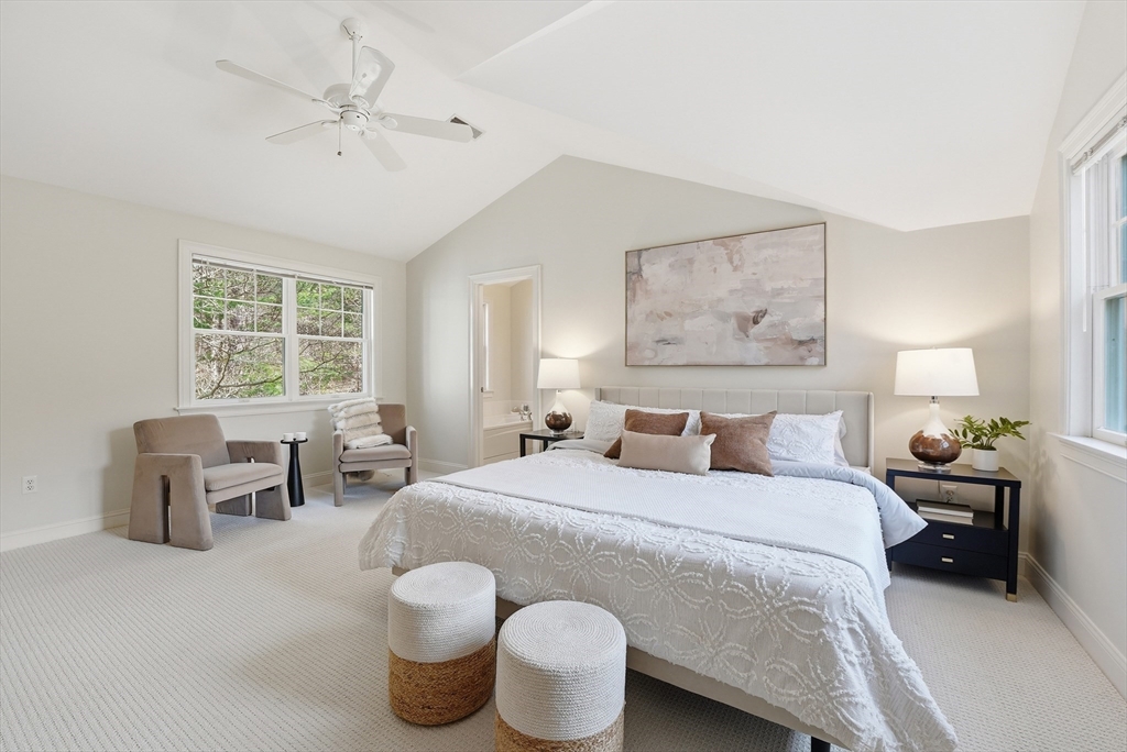 Well-maintained contemporary home in the desirable Bellows Farm neighborhood with space to live, relax, and entertain. Open-concept first floor features spacious living and dining room area adjacent to vaulted family room with gas fireplace off the kitchen. Eat-in kitchen with stainless steel appliances and wood cabinets. Sunny, 3-season porch off family room leads to a deck and backyard with thoughtfully curated landscaping, stone walls, and gardens. Upstairs, newly installed stair runner and carpet throughout. Spacious primary with vaulted ceilings and ensuite bath complete with jacuzzi tub, enclosed shower, and double vanity. Separate, shared full bath at the top of the stairs accommodates the 2 additional bedrooms. Convenient access to the neighborhood's shared pool, tennis courts, gym, and clubhouse- just a short walk away! Top- rated schools and proximity to Rt.2, commuter rail, shopping, Freeman Rail Trail, Nara Park, restaurants, and more!