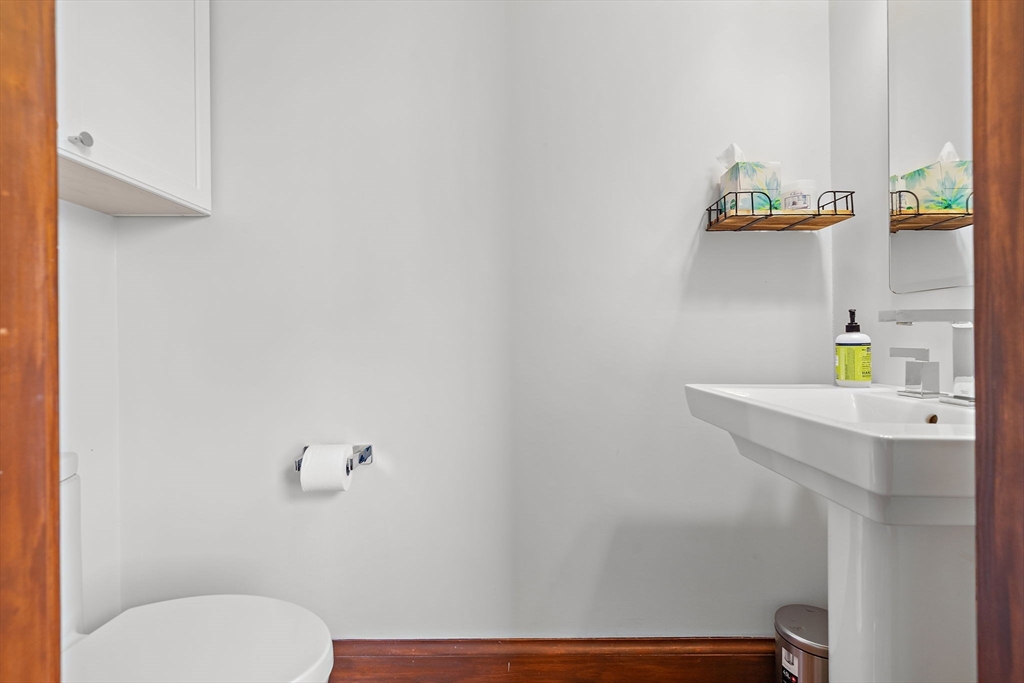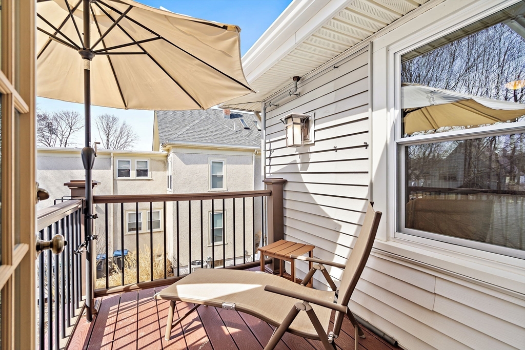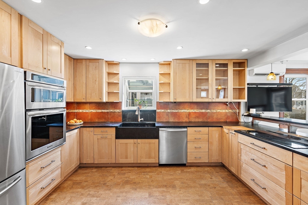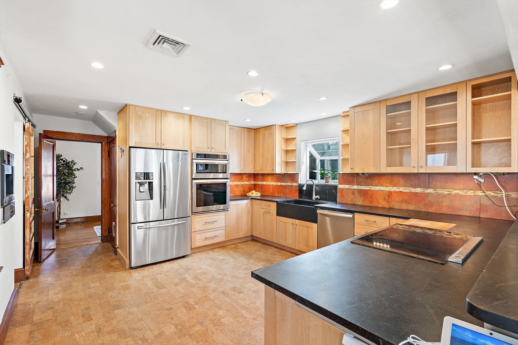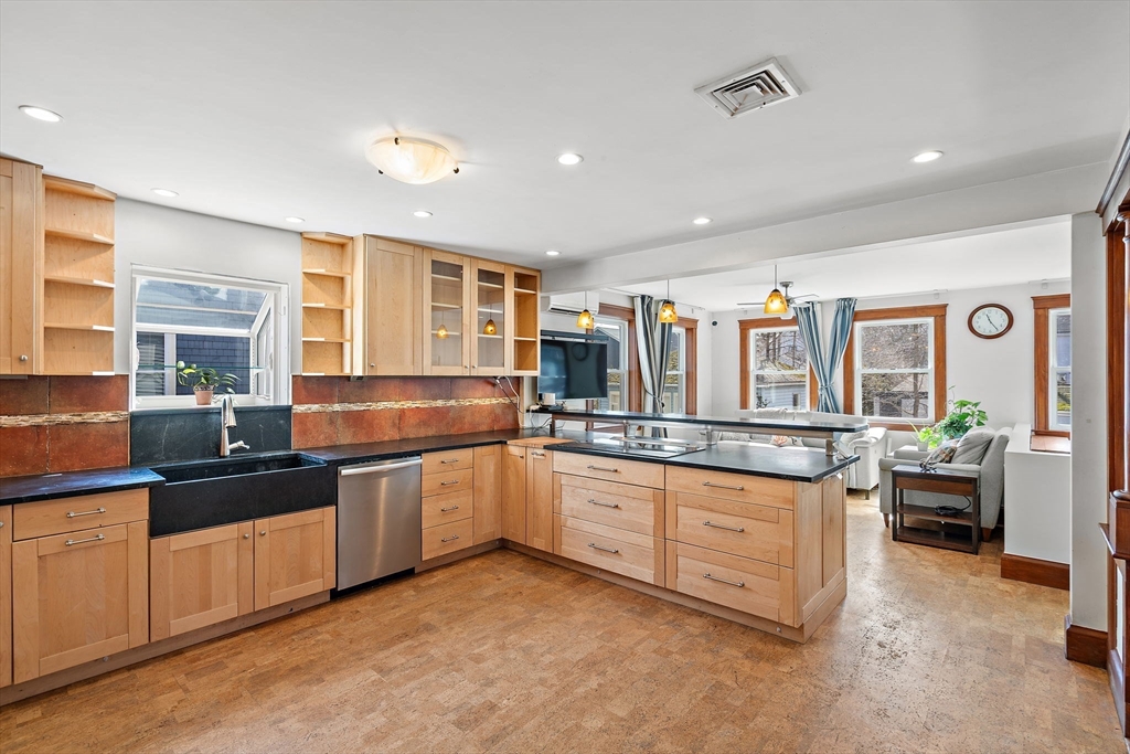 On a quiet street in the heart of Natick Center, this renovated antique pairs preserved details with well-executed updates. A 3-season porch welcomes you in. The foyer opens to a living room/office and custom kitchen with cork floors, custom cabinetry, soapstone counters and sink, pantry, built in coffee station, and breakfast bar. The family room sits just beyond, with a mudroom and stained glass at rear entry. A formal dining room and half bath complete the main level. Upstairs are four bedrooms, laundry, and two updated baths, including primary suite with radiant heat floors, tiled shower and private balcony. The lower level includes storage, bonus room, and workshop or craft space. A patio, 2-car garage, shed, and level backyard add covered parking, storage and space to garden, play or relax. Benefit from cost-saving features like solar panels, insulation and EV charger. Close to shops, restaurants, and commuter rail in Natick's vibrant town center!