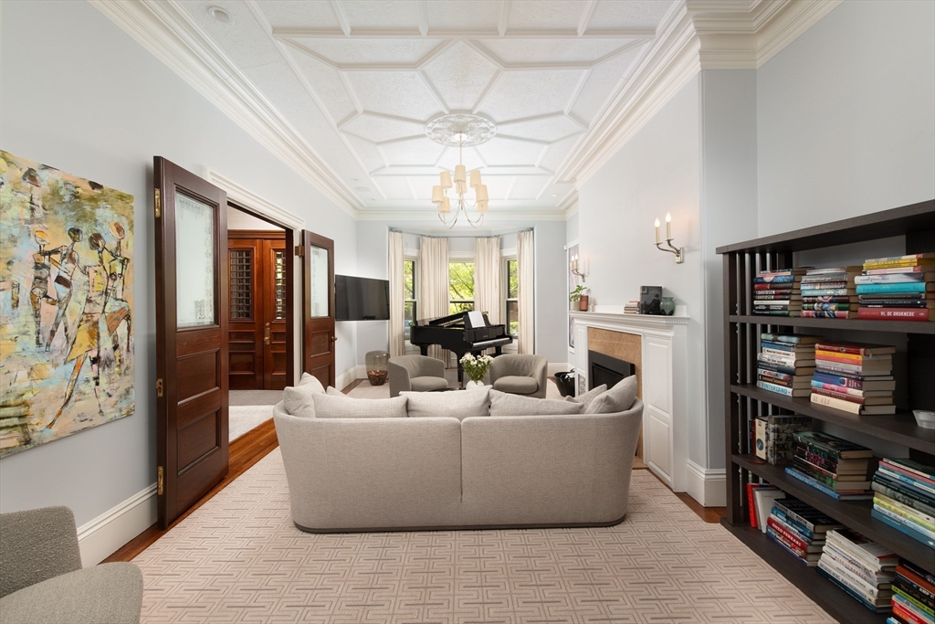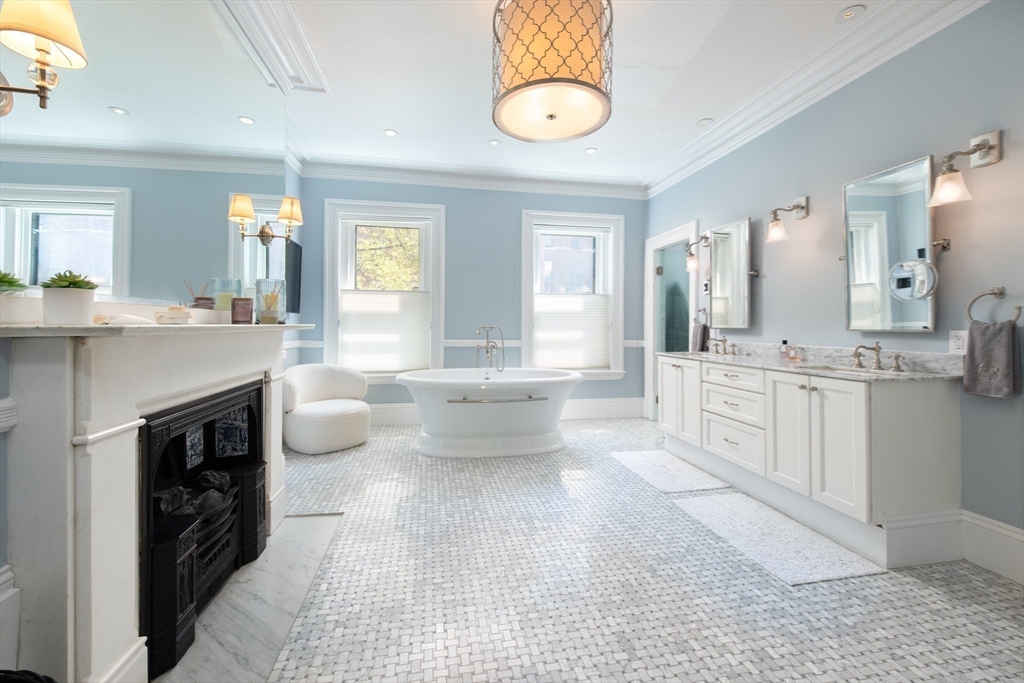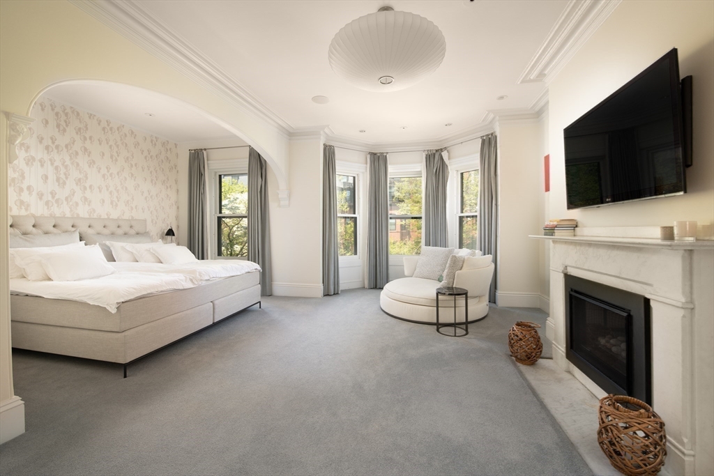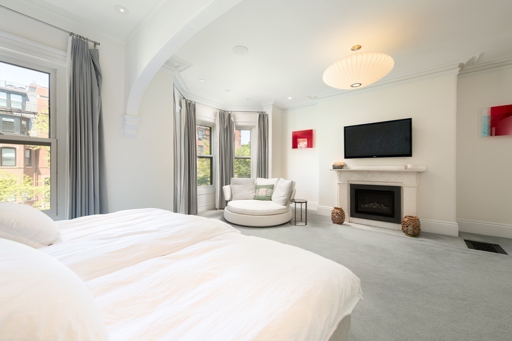Elegant single family home set on a landscaped European garden on Marlborough St. Renovated to the finest standards while keeping the quintessential Back Bay details, this home boasts 5 BR's, 3 full & 2 half baths.There is a gourmet chef's kitchen & family room on the lower level that lead out to a private patio, hot tub & direct to 2 full sized parking spaces. The main level showcases a fireplaced formal living room & dining room w/ a butler's pantry, perfect for hosting family & friends. Up one flight to the 2nd floor on an original classic staircase, you will enter the sumptuous primary suite w/ fireplace. It spans the entire floor, complete with a huge spa bathroom w/ a large soaking tub. A custom walk in closet is not to be missed. The remaining four BR's are on the upper floors & are spacious & versatile for home office & guests. Two more full baths service these BR's. A beautiful stained glass skylight crowns the top of this fabulous home. Central AC rounds out this showpiece!