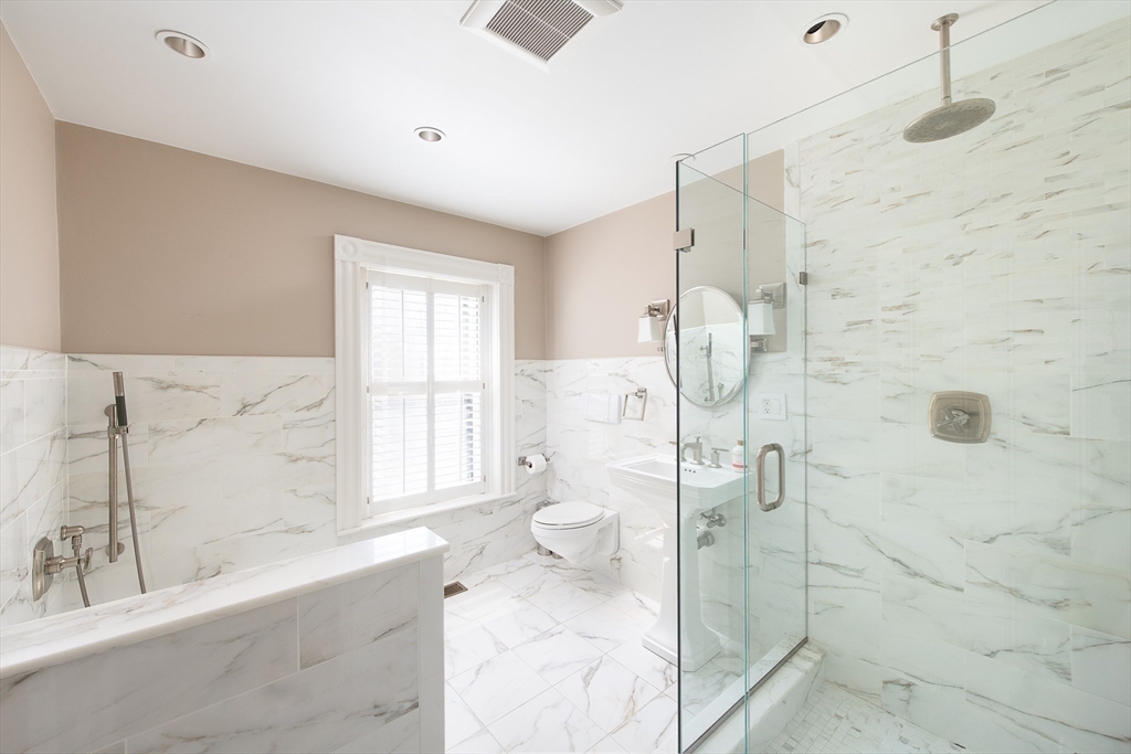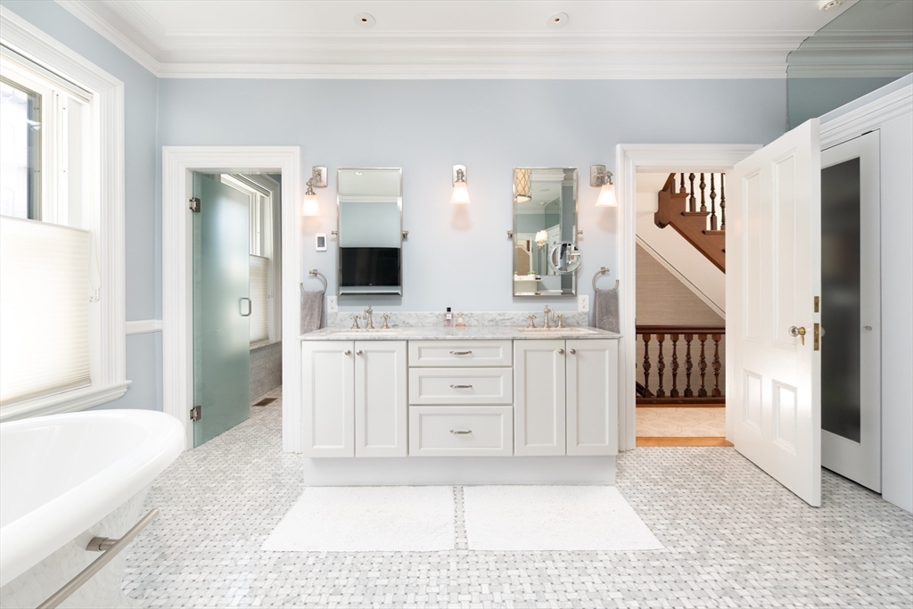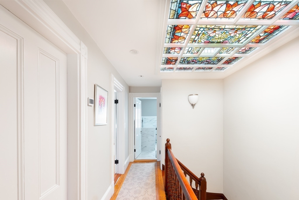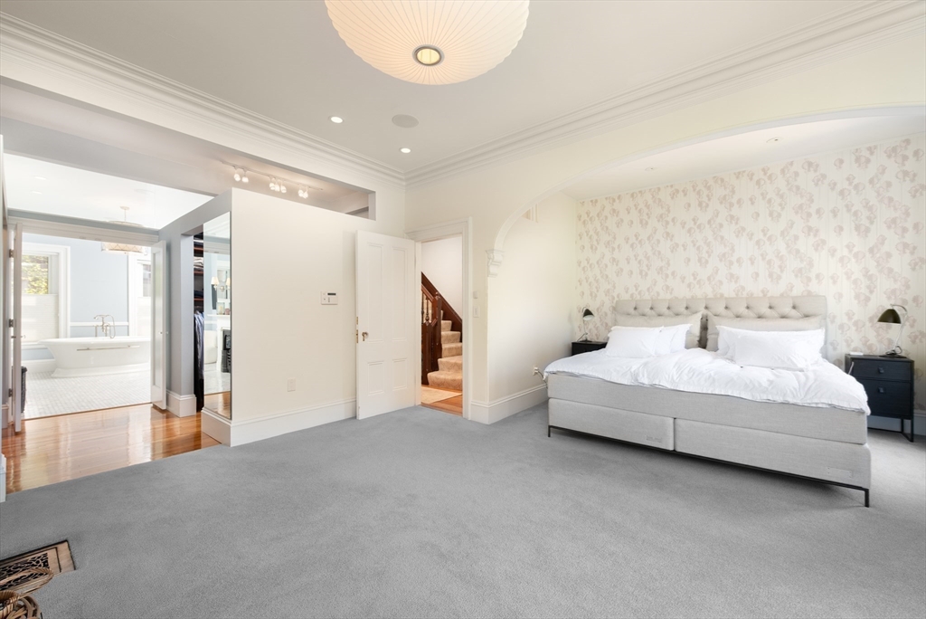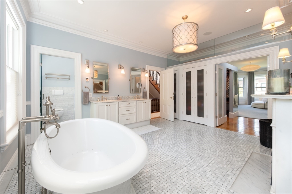 Elegant single family home set on a landscaped European garden on Marlborough St. Renovated to the finest standards while keeping the quintessential Back Bay details, this home boasts 5 BR's, 3 full & 2 half baths.There is a gourmet chef's kitchen & family room on the lower level that lead out to a private patio, hot tub & direct to 2 full sized parking spaces. The main level showcases a fireplaced formal living room & dining room w/ a butler's pantry, perfect for hosting family & friends. Up one flight to the 2nd floor on an original classic staircase, you will enter the sumptuous primary suite w/ fireplace. It spans the entire floor, complete with a huge spa bathroom w/ a large soaking tub. A custom walk in closet is not to be missed. The remaining four BR's are on the upper floors & are spacious & versatile for home office & guests. Two more full baths service these BR's. A beautiful stained glass skylight crowns the top of this fabulous home. Central AC rounds out this showpiece!