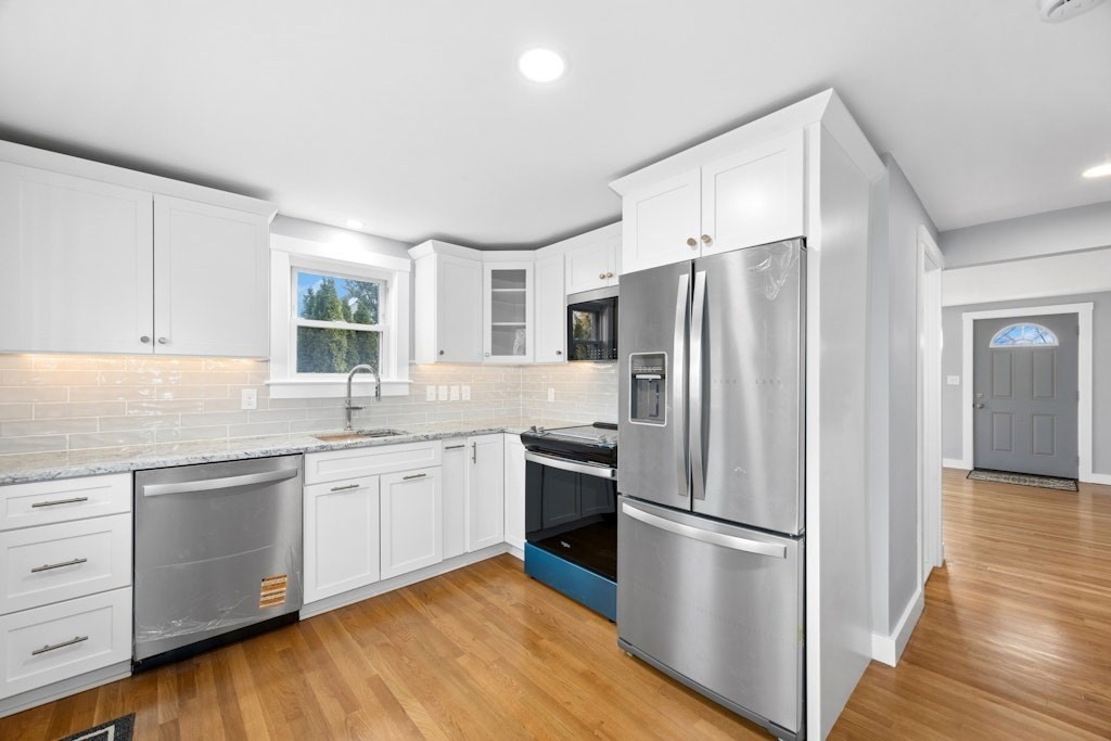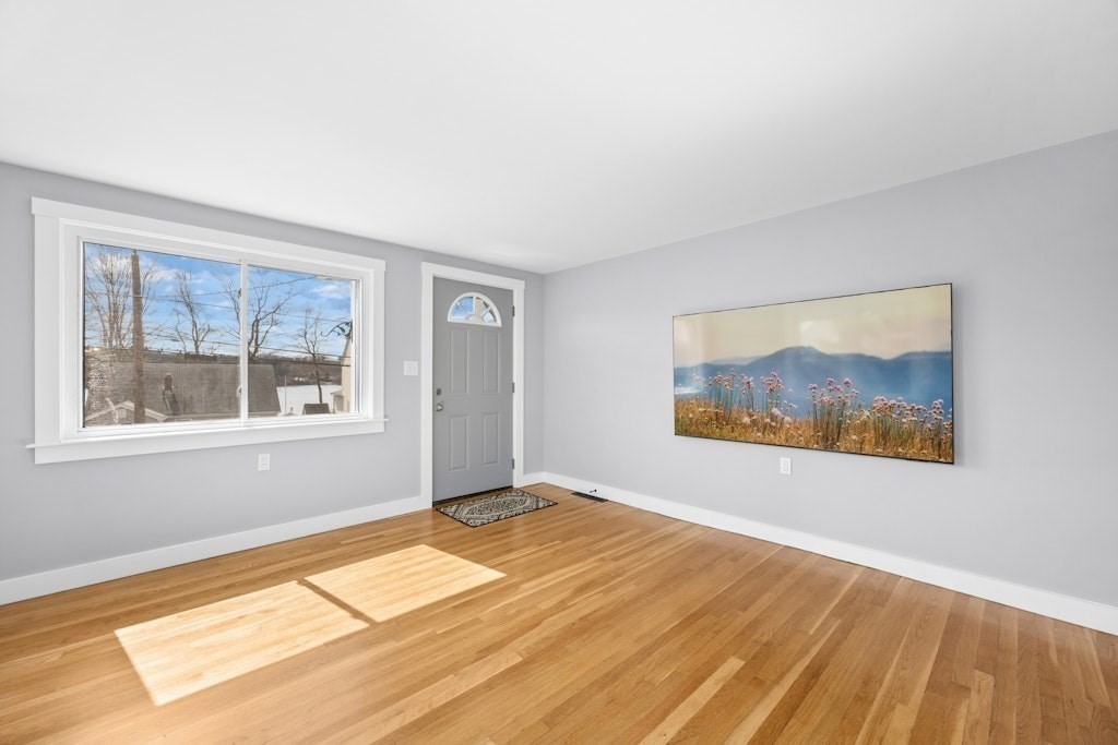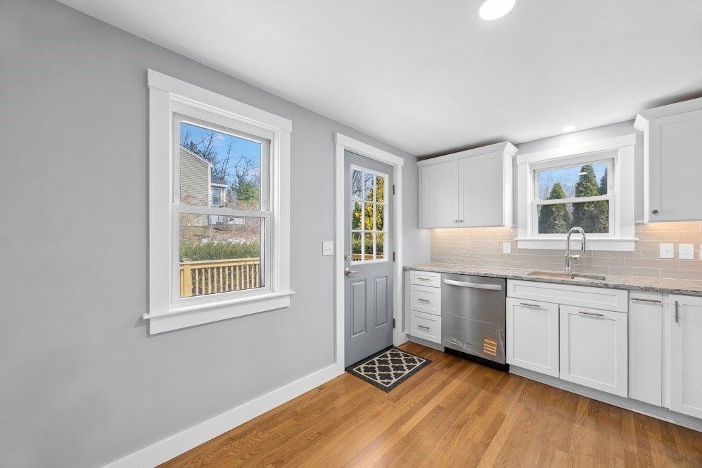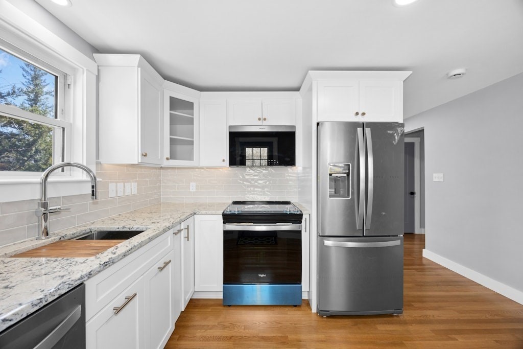 Newly remodel ranch style home with picturesque views of Fort Meadow Lake. The new kitchen strikes a balance between modern brightness & classic warmth with new cabinetry, granite counter tops, tiled backsplash, recessed lights & ss appliances. Access to deck area for grilling and outside dining. Living room with lake views, hardwood floors & wall mounted TV. Remodeled bathroom blends classic clean lines with updated textures to create a space that feels both fresh & timeless. With pristine tilework, polished fixtures, sleek vanity, & contemporary flooring. The remodeled bedrooms have great natural light, polished hardwood floors, modern recessed lighting & closets. Walkout basement has laundry area and great potential for additional space. New On Demand HW heater. Plumbing Updated. Updated electrical & interior lighting. Central Air. New Doors. Updated deck area. New interior painting. Vinyl siding & new exterior trim. Town water & sewer. Access to beach. Boat dock area nearby.