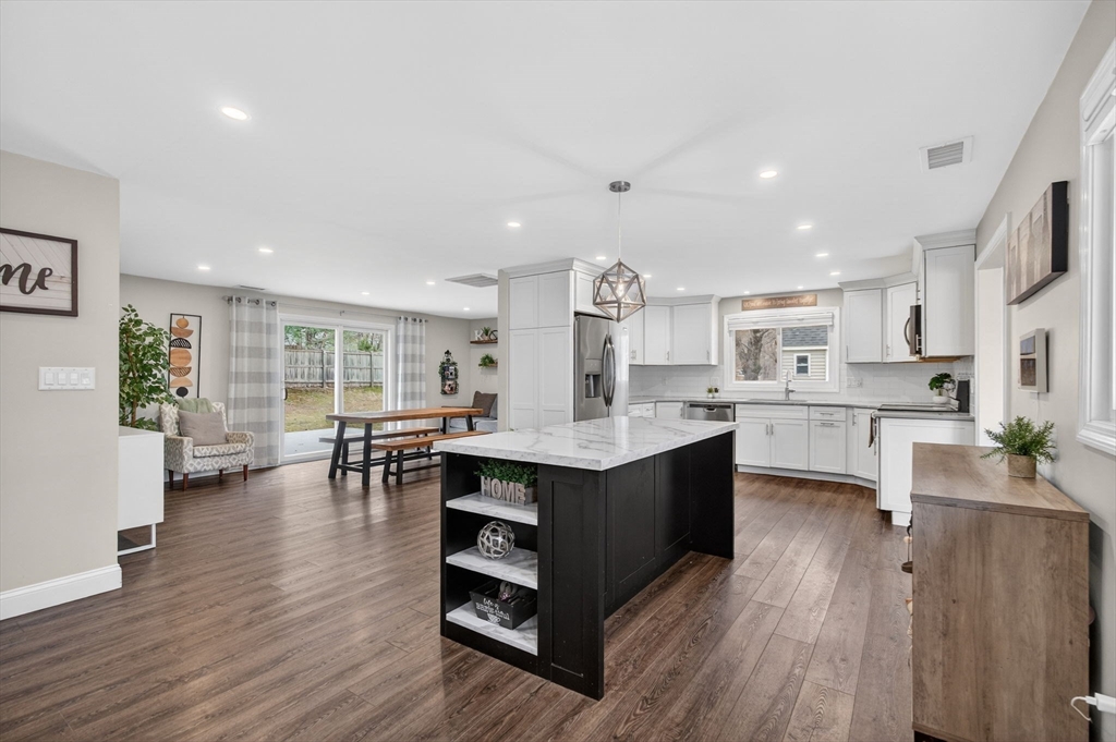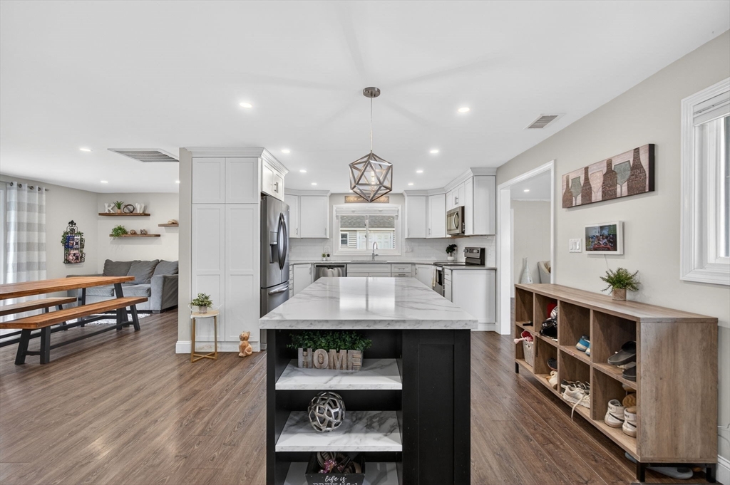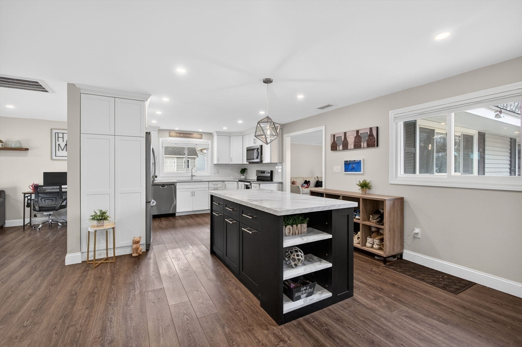 Welcome to this beautifully renovated, move-in ready home in the desirable Symphony Park area of West Peabody. Rebuilt from the studs in 2020, this property combines newer construction with the charm of an established neighborhood.This spacious single-level home features 3 bedrooms and 2.5 bathrooms across 2,158 square feet. The open-concept layout is ideal for daily living and entertaining, showcasing a stunning kitchen with quartz countertops, a large island, and stainless steel appliances.The inviting living room, with its classic brick fireplace and oversized windows, brings in abundant natural light. Updated bathrooms feature modern finishes, including a beautifully tiled walk-in shower. Major upgrades in 2020 included electrical, plumbing, HVAC, roof, windows, and flooring—offering a true turnkey experience. Set on a generous lot with a large driveway and fenced yard, this home is perfect for relaxation and entertaining. Conveniently located near major routes- TRULY TURN KEY!