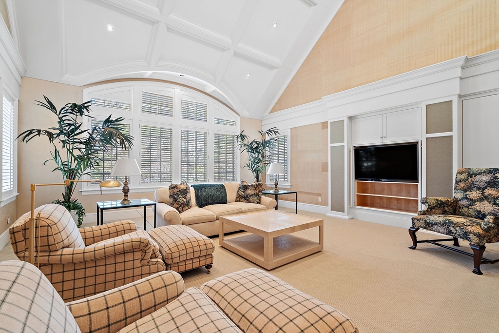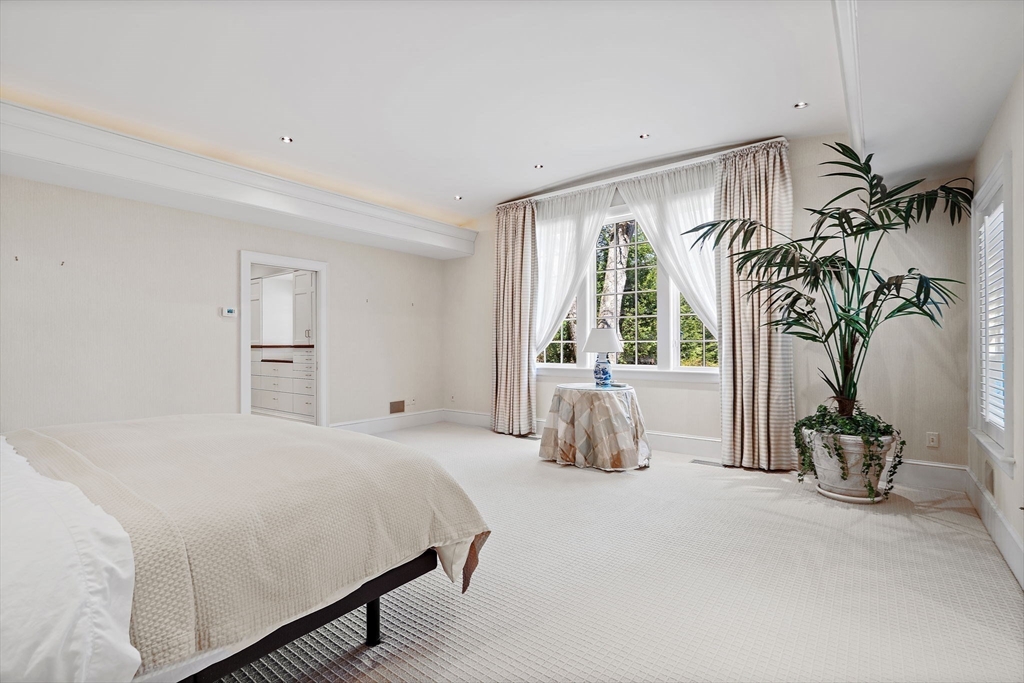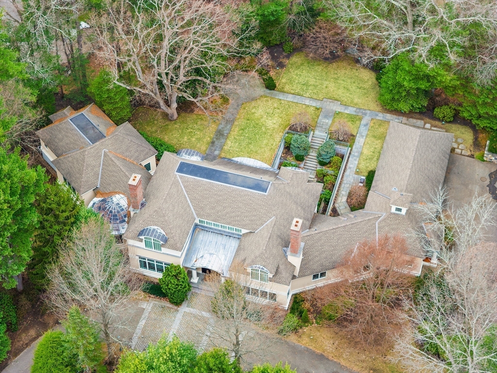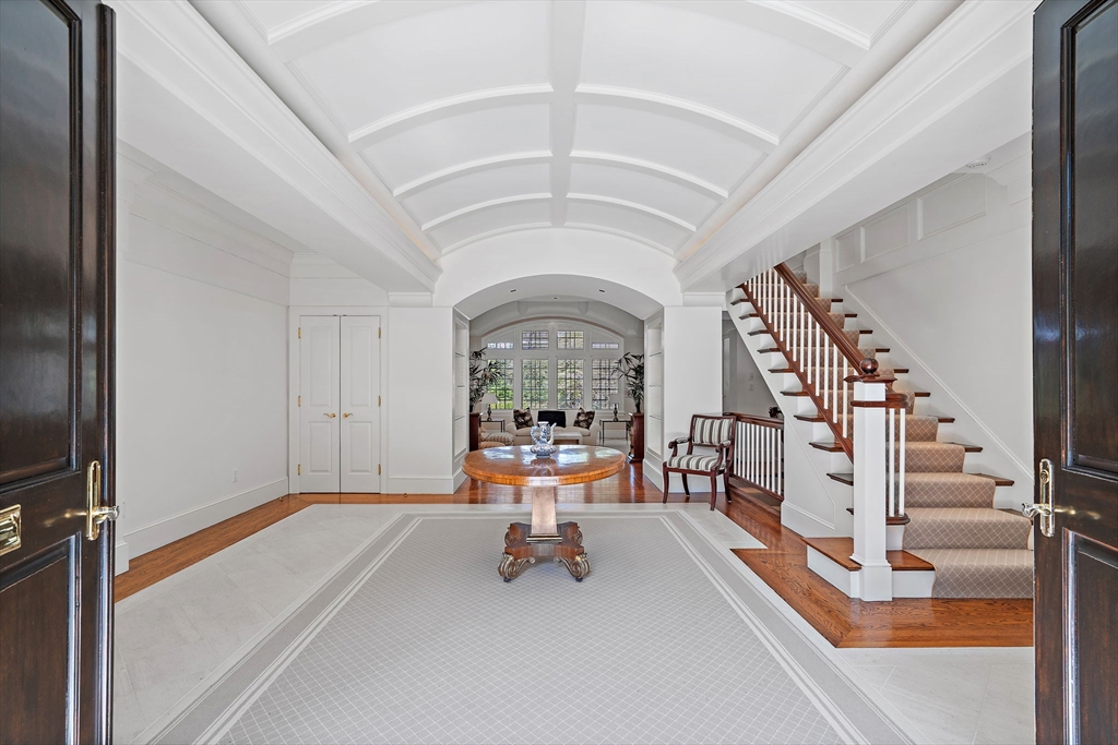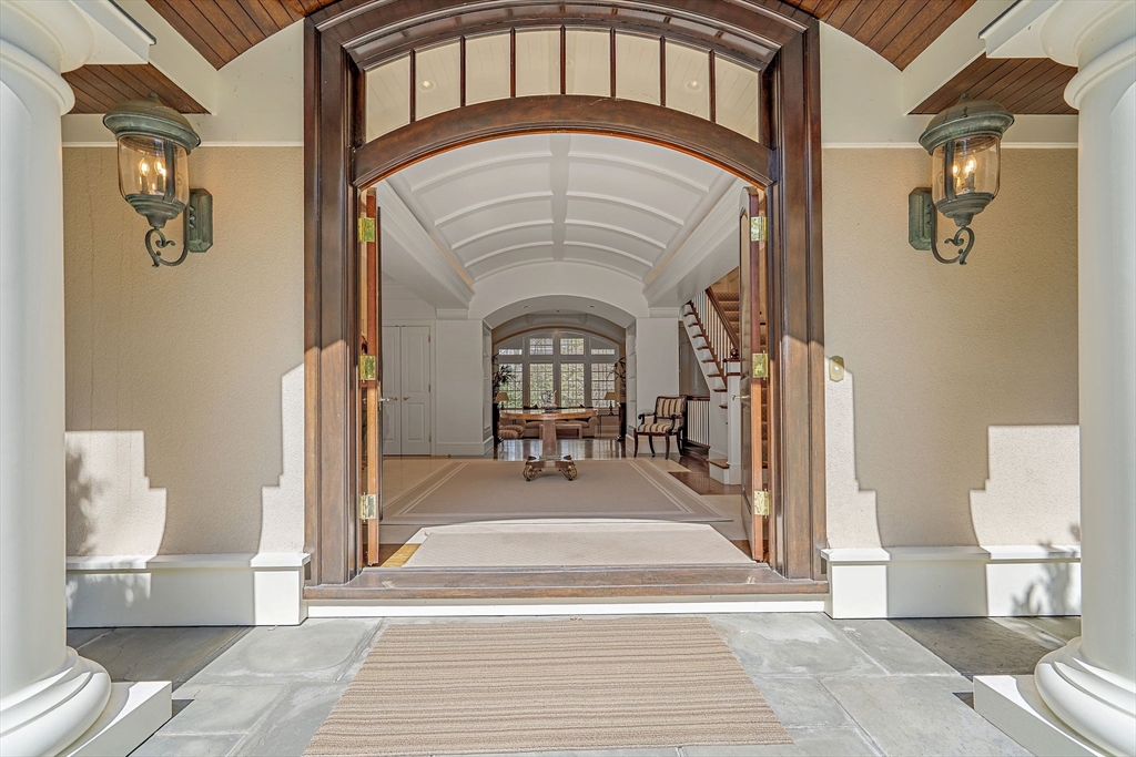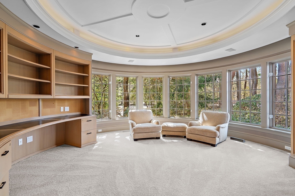 Nestled on a lush 60,000+ square foot lot just nine miles from Boston, this exceptional custom-designed home offers the feel of a private retreat with striking architectural design. Thoughtfully arranged with two wings set at a 30-degree angle, the layout captures beautiful views of the sprawling gardens and tranquil courtyards throughout.One wing features a luxurious primary suite with a circular study, spacious bedroom, sitting room, and elegant bath with dual dressing rooms and walk-in closets. The opposite wing is designed for everyday living and entertaining, offering a chef’s kitchen, breakfast room, walk-in pantry, wet bar, laundry, half bath, mudroom, and three-car garage. Coffered ceilings, walls of windows, and a warm, inviting family room highlight the home’s craftsmanship, while the open floor plan allows each space to flow seamlessly. A rare and distinctive property that must be experienced to fully appreciate its beauty and privacy.