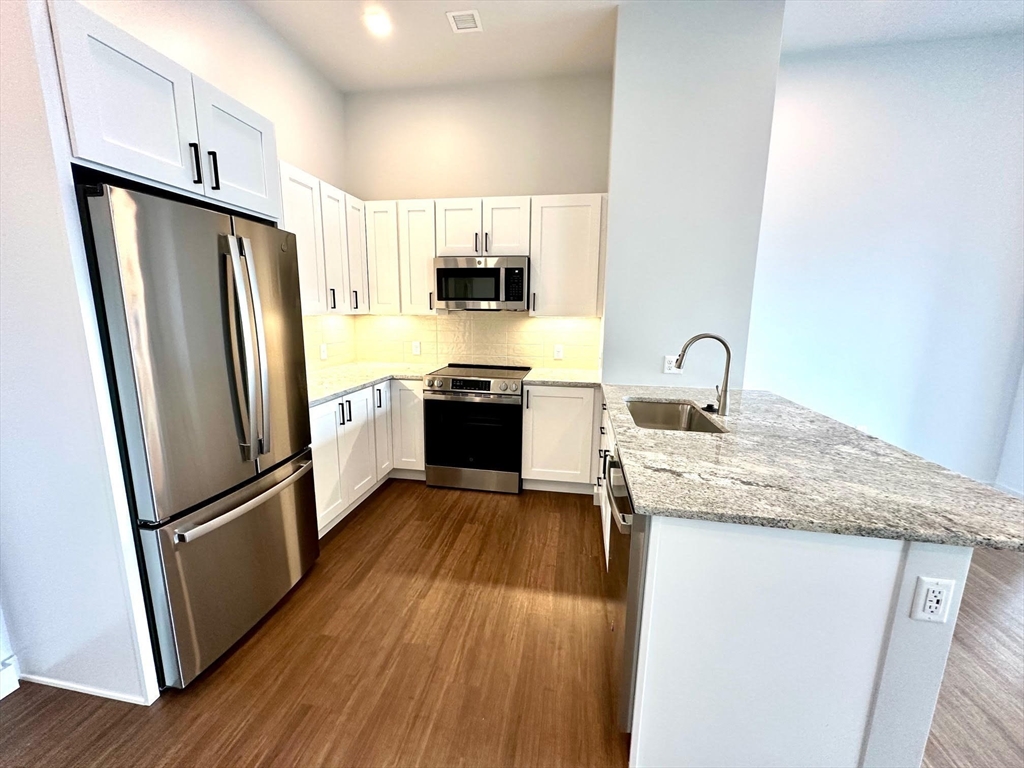 BRAND NEW mixe-use building in downtown Natick w/ 46 residential apartments. Unit 313 is a 3rd floor 712sqft 1 BED 1 BATH unit. Kitchen has soft-closing cabinets (w/ under lighting), GRANITE counters, STAINLESS STEEL appliances, breakfast bar & an open floor plan w/ high ceilings. Flooring consists of engineered hardwood in common areas and carpeted bedrooms, tiled bathroom w/ walk-in shower. IN-UNIT WASHER & DRYER. Central forced air heat & COOLING. The building has 2 elevators & GARAGE PARKING FOR ONLY 1 is underground. PET FREINDLY BUILDING (additional monthly pet rent may apply). Roof deck for use in the summer months w/ furniture and grills provided by owner. The street level is commercail space w/ new businesses opening up. There are 3 upper levels of apartments. There are EV stations for use. Great location close to Commuter Rail, the Common, shops, restaurants and more.