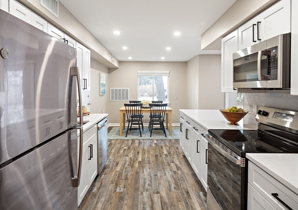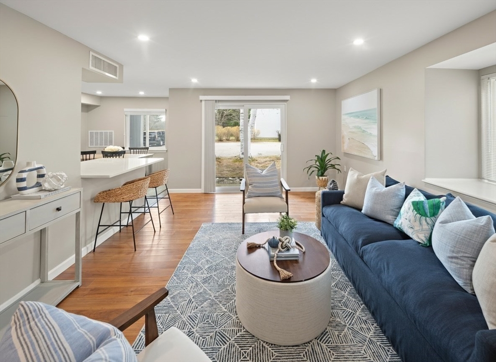 Completely updated, this highly coveted first floor unit feels like new construction! Bright and airy, the brand new kitchen impresses with stainless steal appliances, gorguous quartz countertops and island seating. The renovated bathroom is equally spectacular with oversized quartz vanity and tiled shower. Other upgrades include recessed lighting and new flooring throughout. You will love the easy access to this first floor unit and private garden patio. The Beal's Cove community offers an incredible location, maintenance free living, and fantastic facilities, including the outdoor pool, separate storage space and plenty of parking. This condo is just half mile to the Hingham Shipyard, where you can catch the Commuter Boat to Boston and enjoy the incredible shops and restaurants. The low association fee includes heat, hot water, and exterior maintenance.
