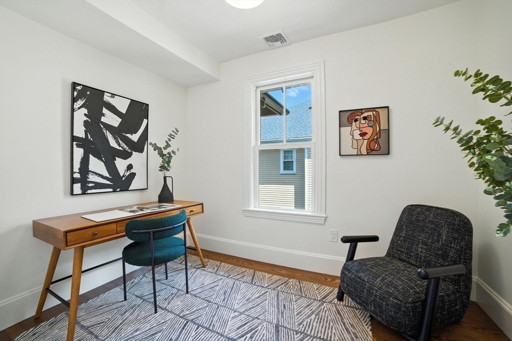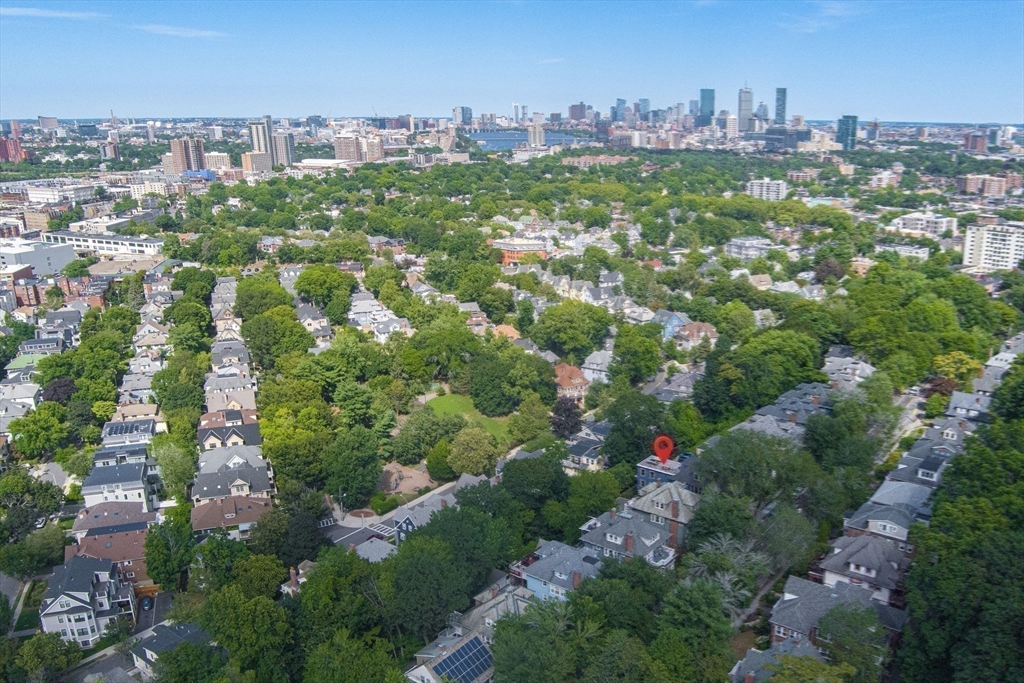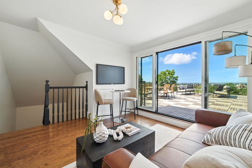 Rare, fully renovated home (2025) offering 3,250+ SF, exceptional skyline views from Cambridge to Back Bay and four private outdoor spaces. This condominium exemplifies a refined standard of living, presenting a luxurious residence distinguished by amazing design and crafted with top tier materials. Large rear addition provides over 2,175 SF on the main living level (2nd floor) with 3 bedrooms, 2.5 baths, central kitchen, formal dining room, living room, home office, laundry and two balconies. 3rd floor primary suite features a sitting room with wet bar and an expansive roof deck with gas BBQ connections. Lower level mudroom has direct entry from two attached garage parking spaces (wired for EV charging). Plus a private 470+/- SF yard. Architect plans available to add a private elevator from garage to living level.