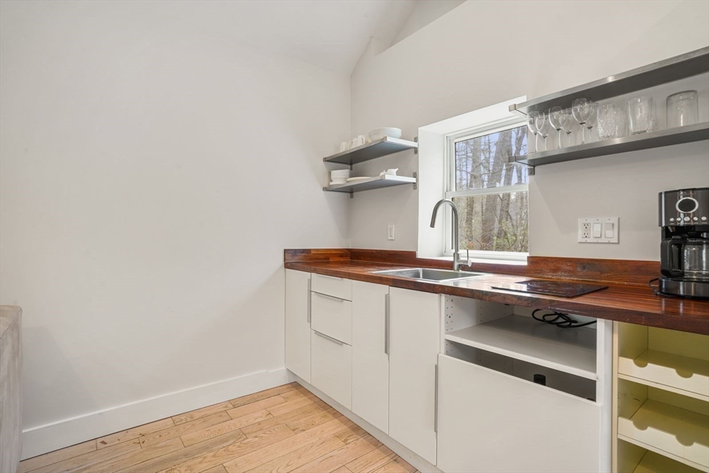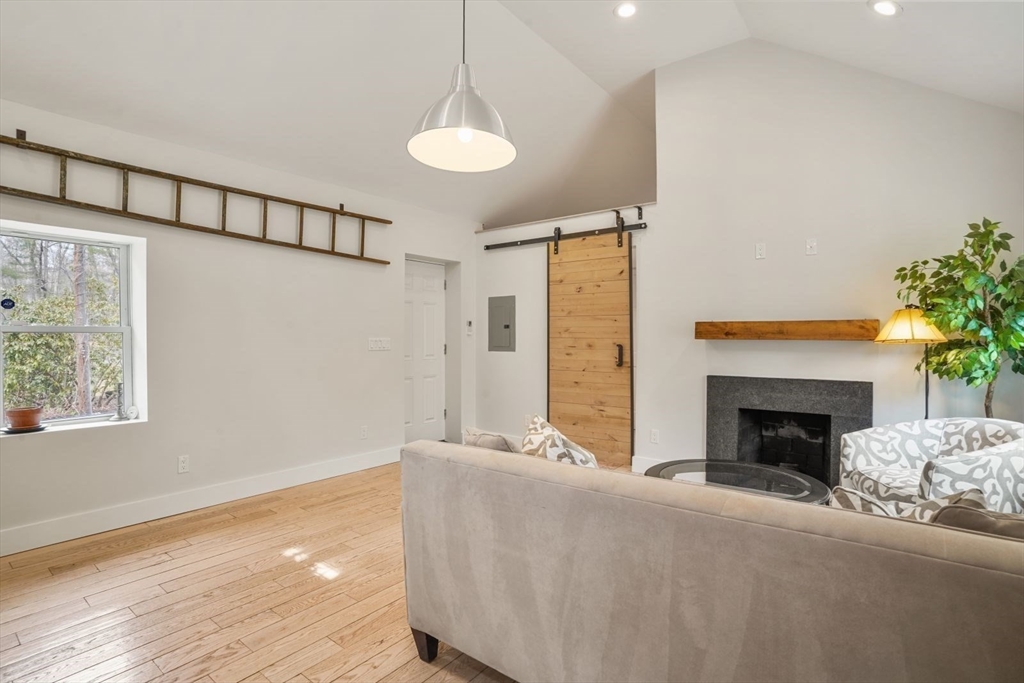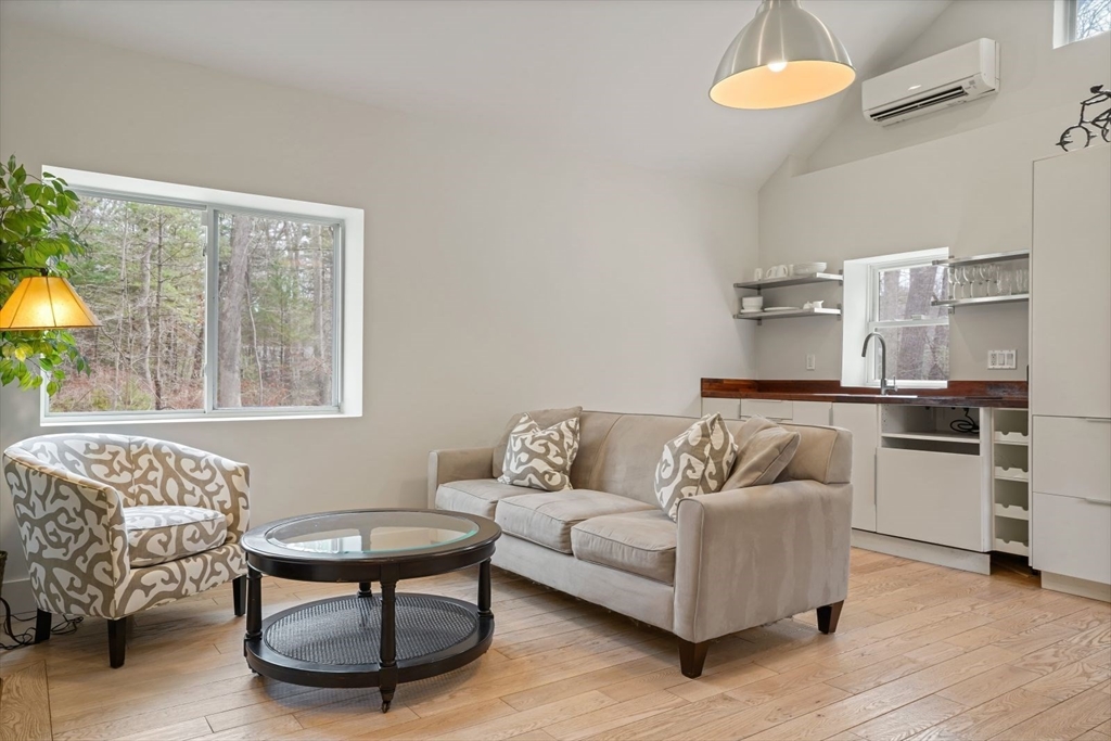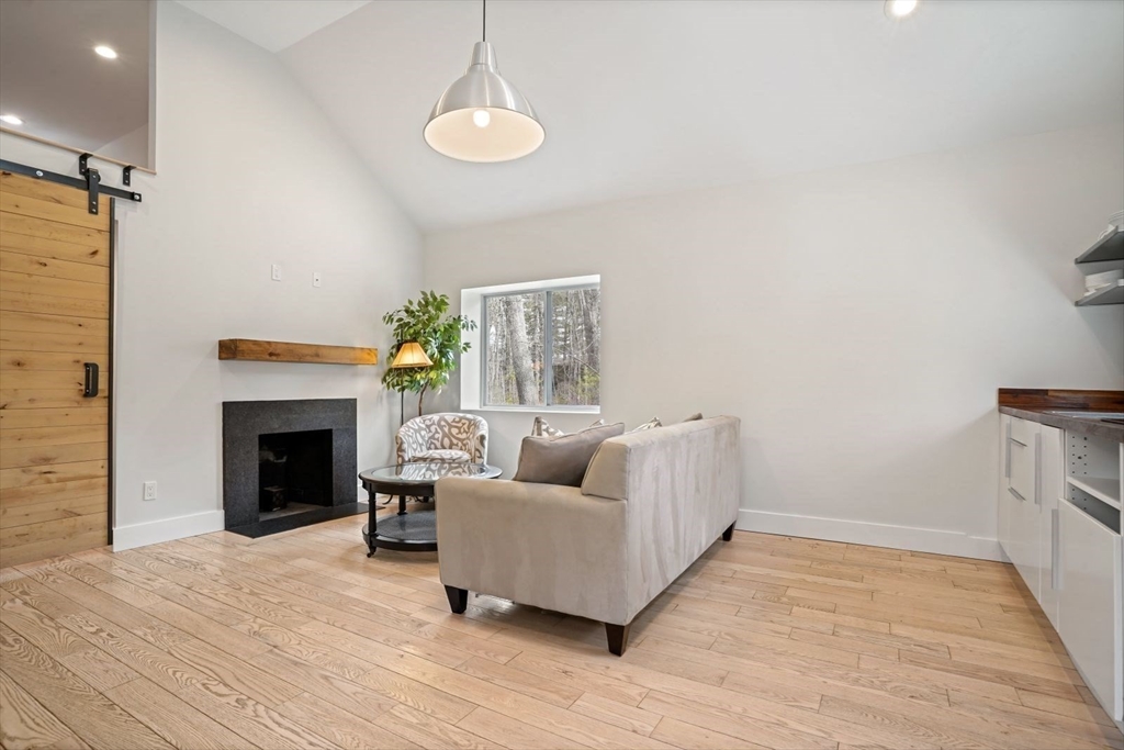 Tucked along a quiet road, this picture-perfect cottage offers a rare blend of privacy, simplicity, and storybook charm. Set on a beautifully level lot and surrounded by mature trees, this home is a peaceful retreat. With just under 800 square feet, it is an ideal investment/rental opportunity or for anyone seeking a downsized lifestyle, weekend escape, or condo alternative. A welcoming front entry, framed by classic stone steps and lush greenery, sets the tone for the warmth inside. Natural light fills the space, while the thoughtful layout maximizes every square foot. The open-concept kitchen/living room with vaulted ceiling includes a wood burning fireplace, perfect for chilly winter nights. Cozy. Full kitchen incl awesome storage, induction cook top, open shelving and more. Private bdrm, bath and generous closet completes the main liv area. Bonus loft offers more storage.