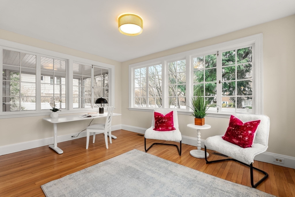 Gracefully set on a 14,000+ sq ft lot, this Chestnut Hill residence blends timeless character with the ease of Newton Centre living. Sunlight fills a gracious interior featuring an eat-in kitchen, formal dining room, expansive living room with wood-burning fireplace, serene sunroom, dedicated home office, and screened porch overlooking professionally landscaped grounds. The second floor offers a spacious primary suite with walk-in closet and spa-like bath with soaking tub and separate shower, plus two additional bedrooms and full bath. Thoughtful updates include newer systems, new kitchen counters and faucet, updated lighting, and fresh paint. Walk-up attic and unfinished basement provide excellent storage and future potential. Mudroom with laundry leads to detached 2-car garage. Ideally located near the D Green Line T, top-rated schools, and easy access to Boston. Don't miss this rare opportunity!