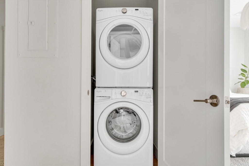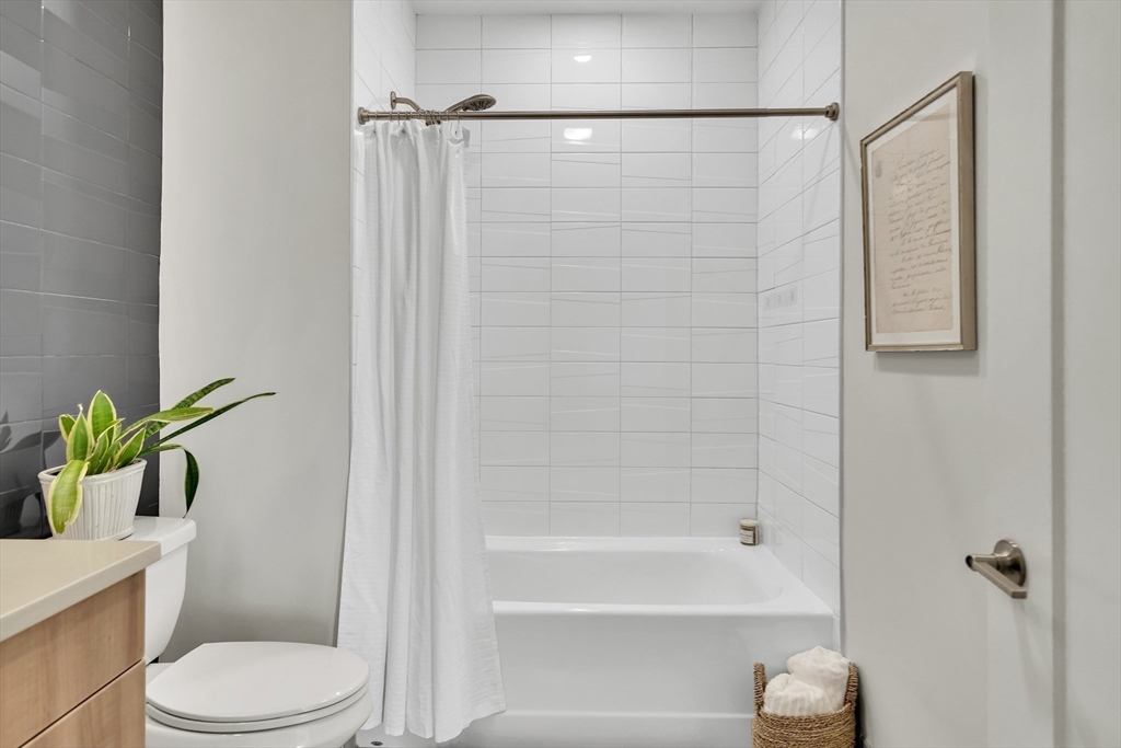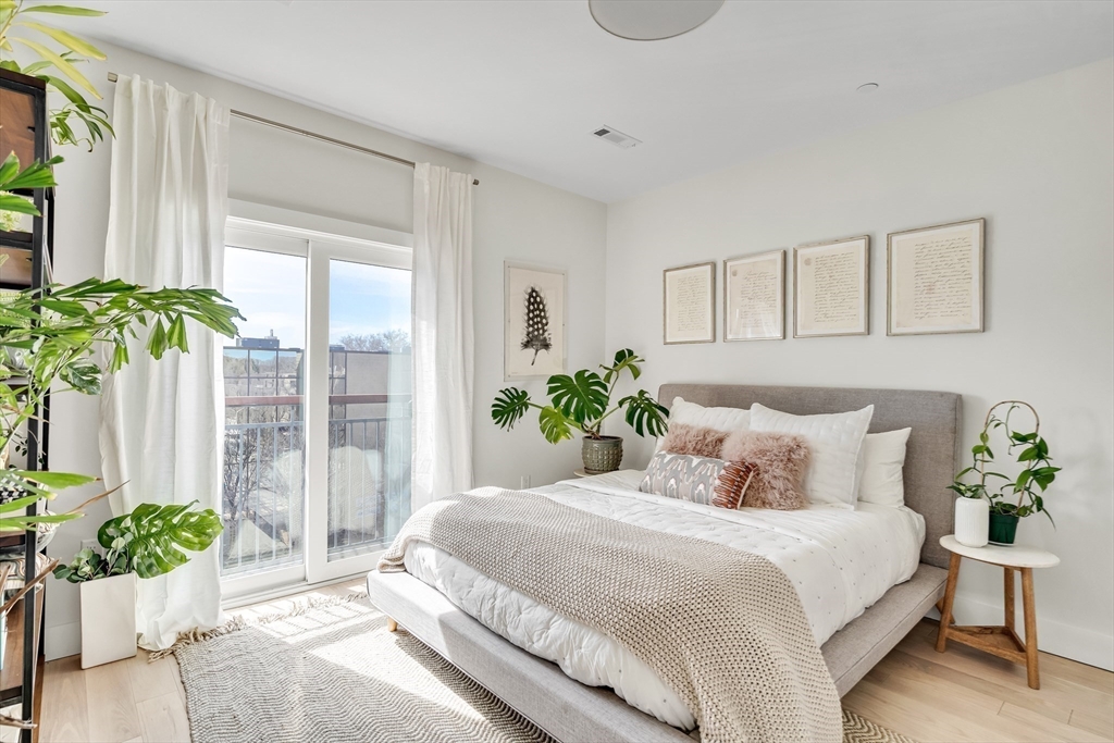 Top-floor unit in a c. 2016 building in the heart of Porter Square. Urban living with a quartz/stainless kitchen and open-concept living/dining with southwest-facing windows. Primary bedroom with en suite bathroom and Juliet balcony; smartly laid-out second bedroom, full bathroom, and in-unit laundry. Two hall closets. Bountiful natural light throughout the unit. The Association features a common roof deck with views over the leafy residential neighborhood. Gated, covered parking.