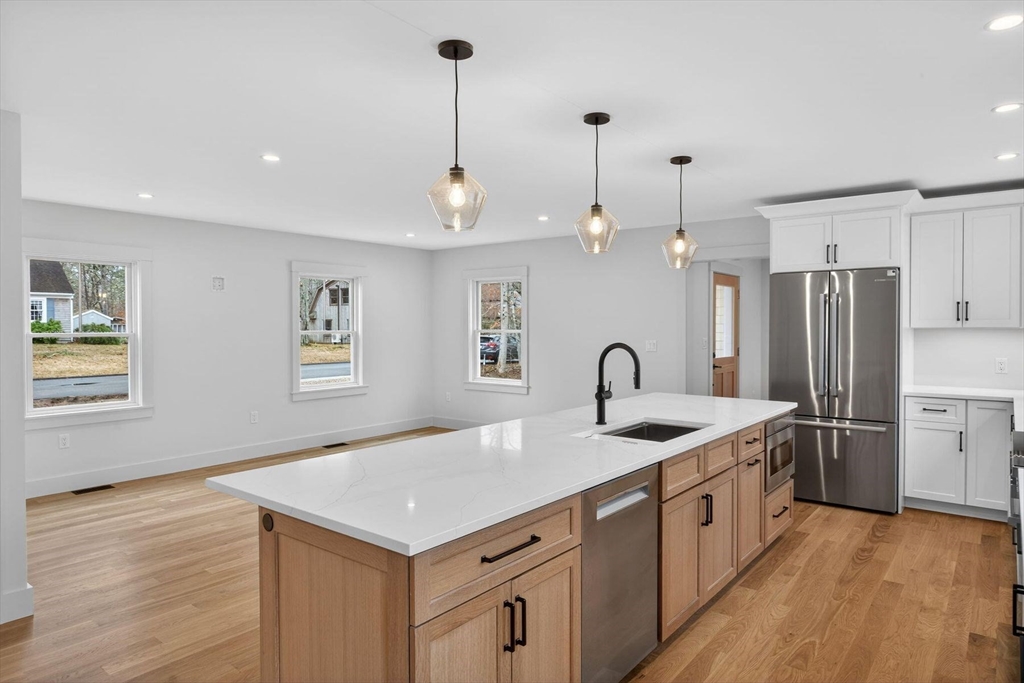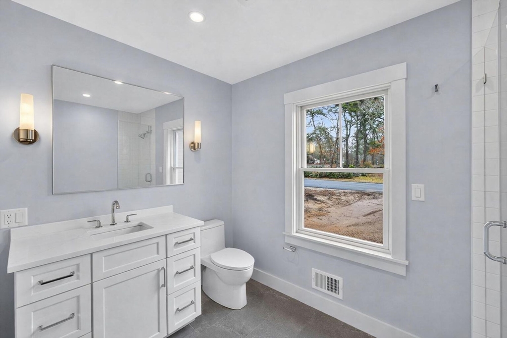 In a quiet neighborhood near Nauset Light Beach is this brand-new 3 bed, 2.5 bath Cape built by Cape Associates, Inc. Thoughtfully designed for one floor living near Nauset Light & the Cape Cod Rail Trail this 1,950 sq.ft. home offers beautifully finished living space with 1,160 sq.ft. on the first & 790 sq.ft. on the second. High-end details include Bosch appliances, quartz countertops in the kitchen, bar, & baths, white oak flooring, Andersen 400 Series windows, solid-core shaker interior doors, and striking fir exterior doors. A high-efficiency heat pump forced hot air system to warm you in winter with central air for the summer days. Sonos is pre-wire in the kitchen & living room along with an EV charger plug in the garage. Mahogany decking and an outdoor shower, a must for any Cape house connect inside and outdoors. A full basement provides for many possibilities; the majority framed out in preparation for finishing a 700 sq. ft. bonus room.