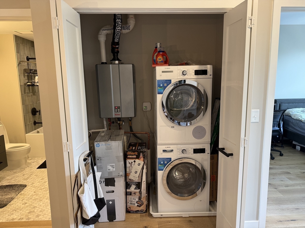 **Available 9/1** Experience modern living in this refined one-bedroom plus den, thoughtfully designed for comfort and style. Enjoy Bosch stainless steel appliances, vented gas cooking, quartz countertops, and oak flooring throughout. Includes garage parking with an EV charging station. Residents have access to premium amenities: a fitness center, co-working space, resident lounge, spa suites, and a dog recreation area. Whether working from home or relaxing, this professionally managed community has it all. Ideally located near Boston Landing, Arsenal Yards with endless options for dining, shopping.