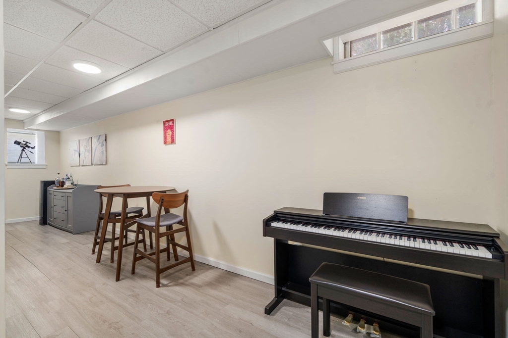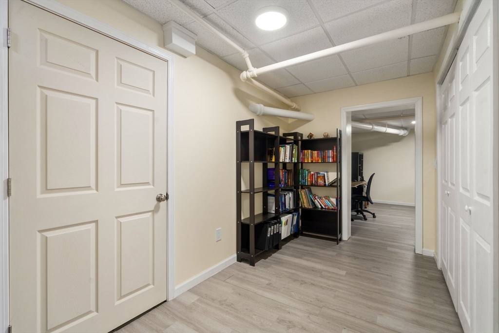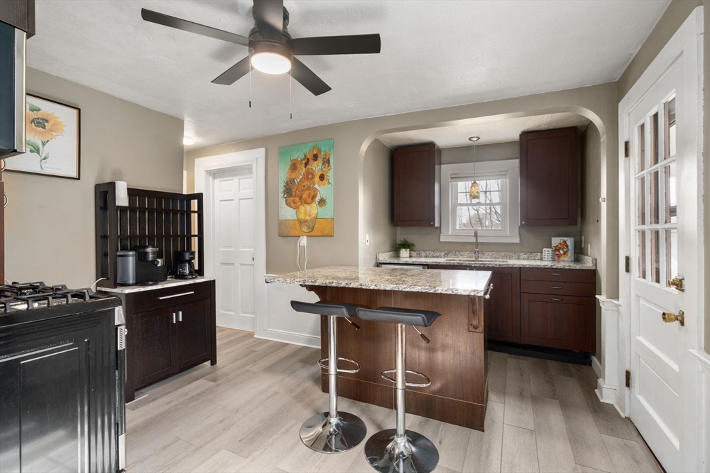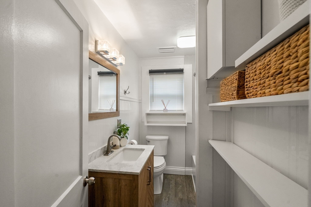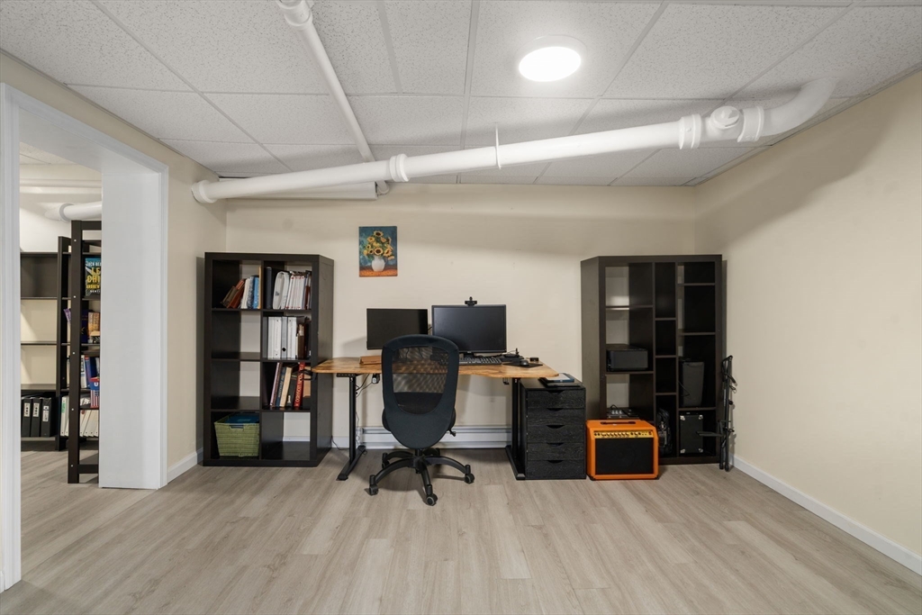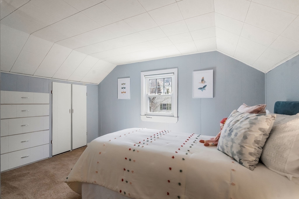0.4 mi to Maynard Center shops & dining • 0.3 mi to Assabet River Rail Trail • Near Maynard schools • Quarter-acre level lot • Finished basement (~500 sq ft) • Single-level living option. Cape-style home on Bancroft Street set on a 0.25-acre level lot in an established Maynard neighborhood. Large, level backyard offers outdoor space for recreation or gardening. Main level supports single-level living with two bedrooms and two full baths. Living room with fireplace and higher ceilings. Updated kitchen with granite countertops and center island. Spacious primary BR with en suite bath. Side entry with mudroom and first-floor laundry. Upper level includes third bedroom, study, and storage. Finished basement adds ~500 sq ft of bonus space for office, recreation, or fitness. Updates in past 4 years include new roof, renovated main bath, and added heat to second floor and basement. Includes video walkthrough.