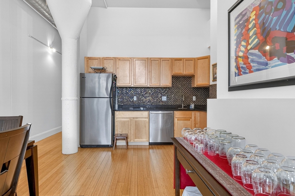 A rare offering at the coveted Harrison Lofts, this sophisticated residence - once the industrial stables of Jordan Marsh & Company - offers a striking blend of history and modern sophistication in the heart of the South End’s vibrant SoWa district. Soaring 22-foot ceilings make a striking first impression, with the opportunity to create a two-level urban sanctuary, without additional HOA cost. Sunlight pours through oversized southeast-facing windows, illuminating an expansive open-concept living, dining, and kitchen space designed for effortless hosting and entertaining. Natural bamboo floors ground the home in warmth, while the oversized bedroom retreat features a custom-built walk-in closet with in-unit laundry and exceptional storage. This professionally managed building also offers a stunning common roof deck with grill, wet bar, and sweeping Boston skyline views. Complete with central AC, deeded garage parking, and additional storage. This is true city living, at its finest.