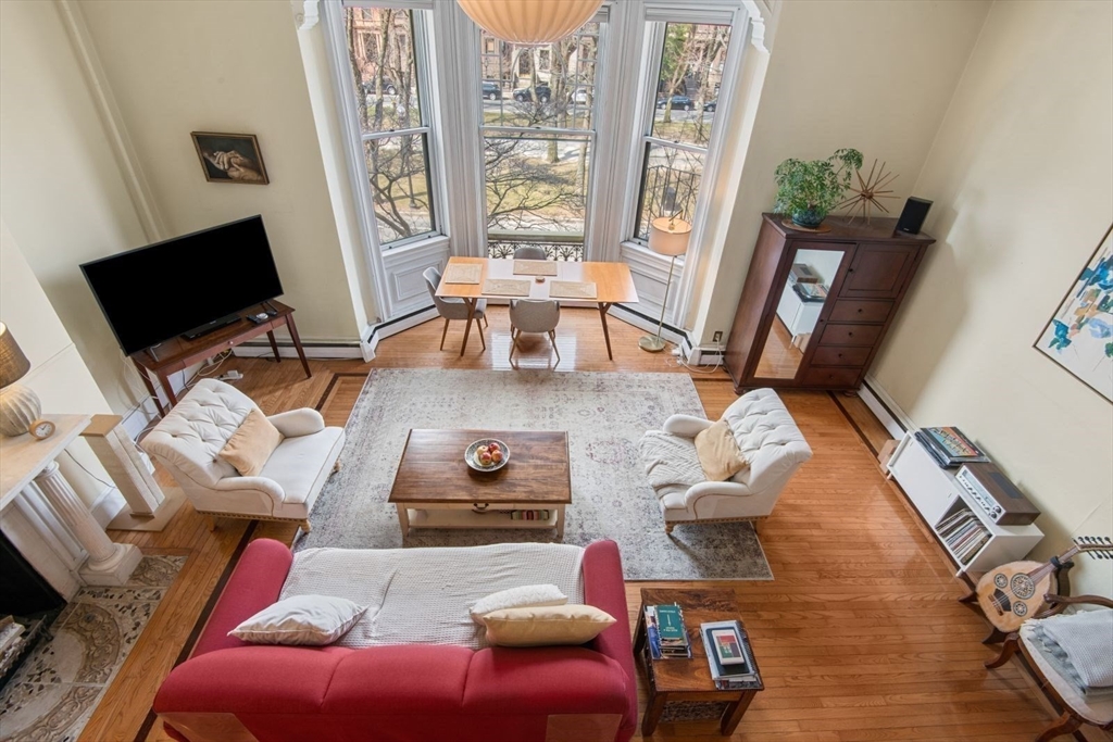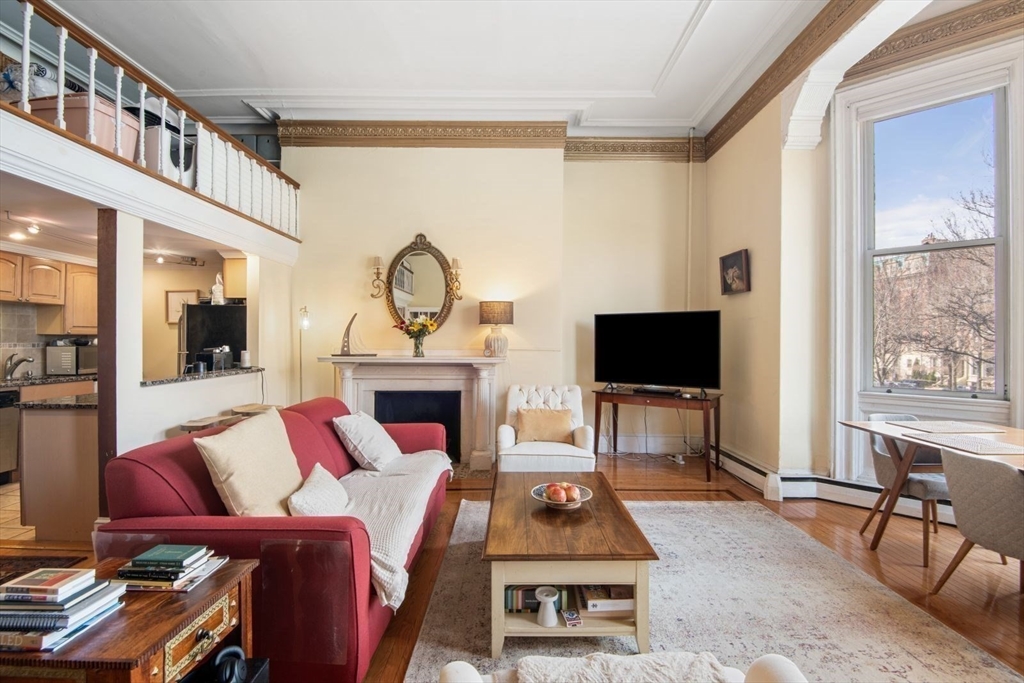 Stunning one bedroom with an additional loft located in the Prestigious Back Bay area. This front facing unit offers a magnificent view of the Commonwealth Avenue Mall tree line. Situated on the second floor mostly furnished, can be negotiable, offering open layout, enter living/dining room, French doors leading to the bedroom, hardwood floor throughout, stainless appliances kitchen, cabinets, granite countertop, breakfast bar, decorative fireplace, high ceilings, oversized windows providing abundance light into the entire unit. The heat and one tandem parking space included in the rent. Located with close proximity to shopping, dining in distinguished restaurants in Bay Bay, Copley Square and the Esplanade along the Charles River.