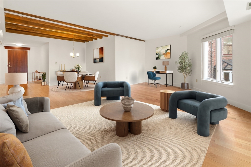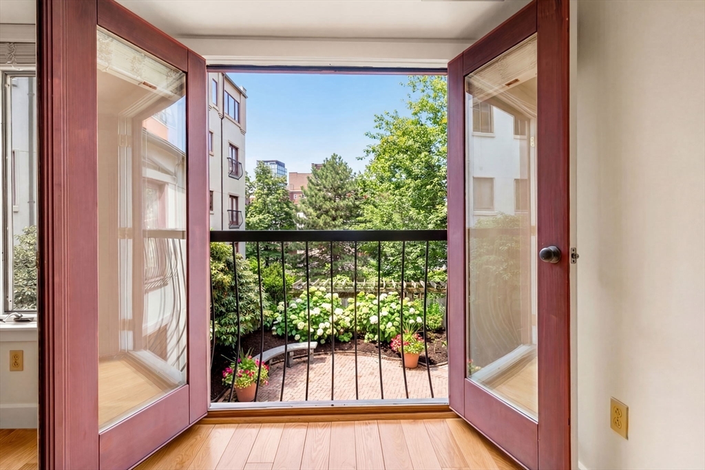 All windows in this renovated residence overlook a lushly landscaped courtyard. Generous living space offers hardwood floors throughout and the dining room presents the character of exposed beams. A spacious nook off the living room is ideal for an office or guest area. Enjoy cooking in your large eat-in kitchen with white cabinets, recessed lighting, quartz counter tops and JennAir appliances. The washer/dryer sits in a separate laundry room within the kitchen. For quiet and comfort, the oversized bedroom accommodates king-size furniture and has two closets. An added bonus is deeded garage parking. Building amenities include elevator, concierge, exercise room, bicycle area, private storage and a peaceful courtyard. This exceptional property is located steps to Boston Harbor, Faneuil Hall Marketplace, the Financial District and several MBTA stations. Experience the charm of living in Boston's Waterfront/North End. You are almost home.