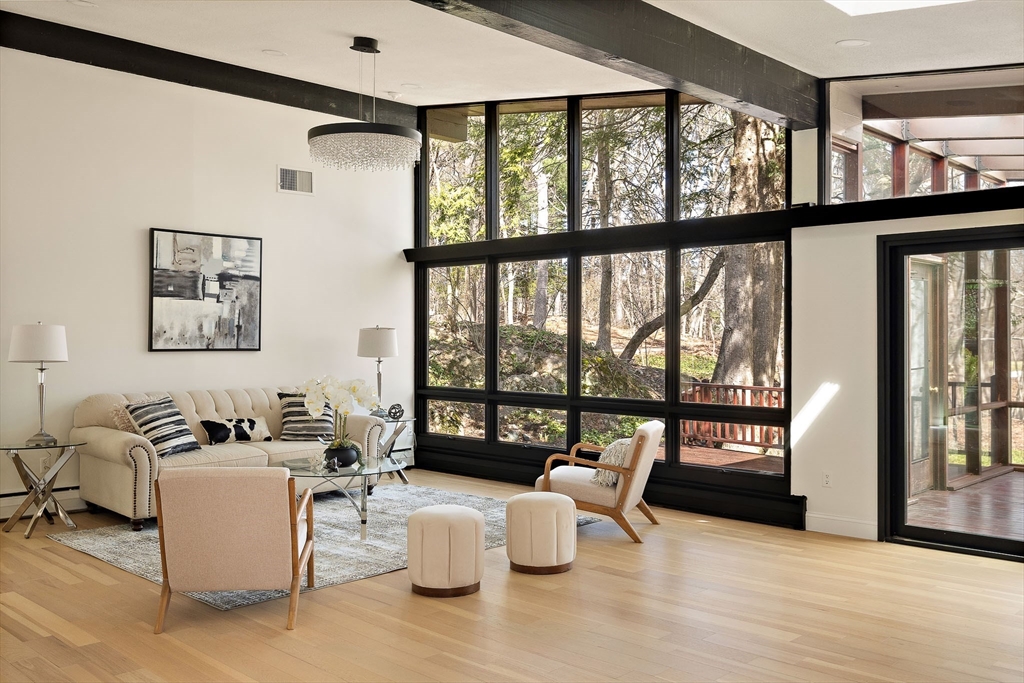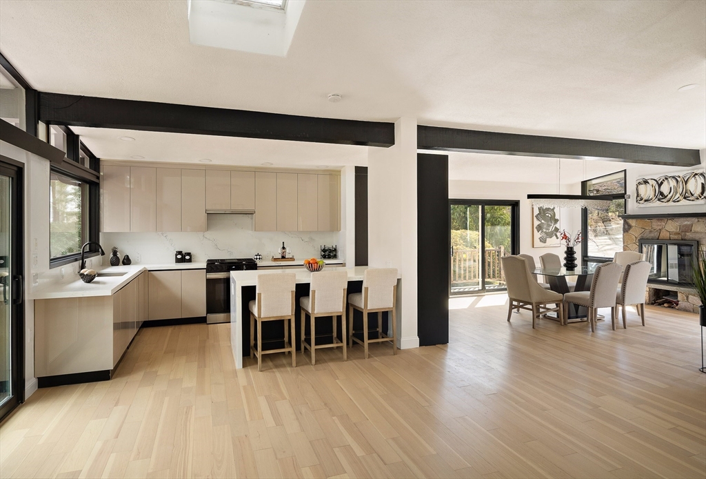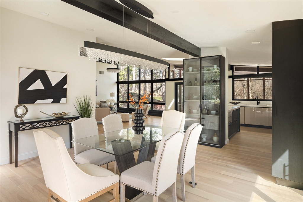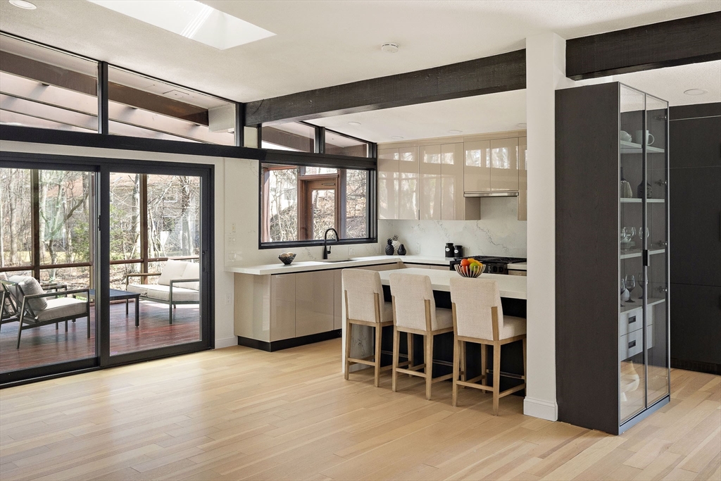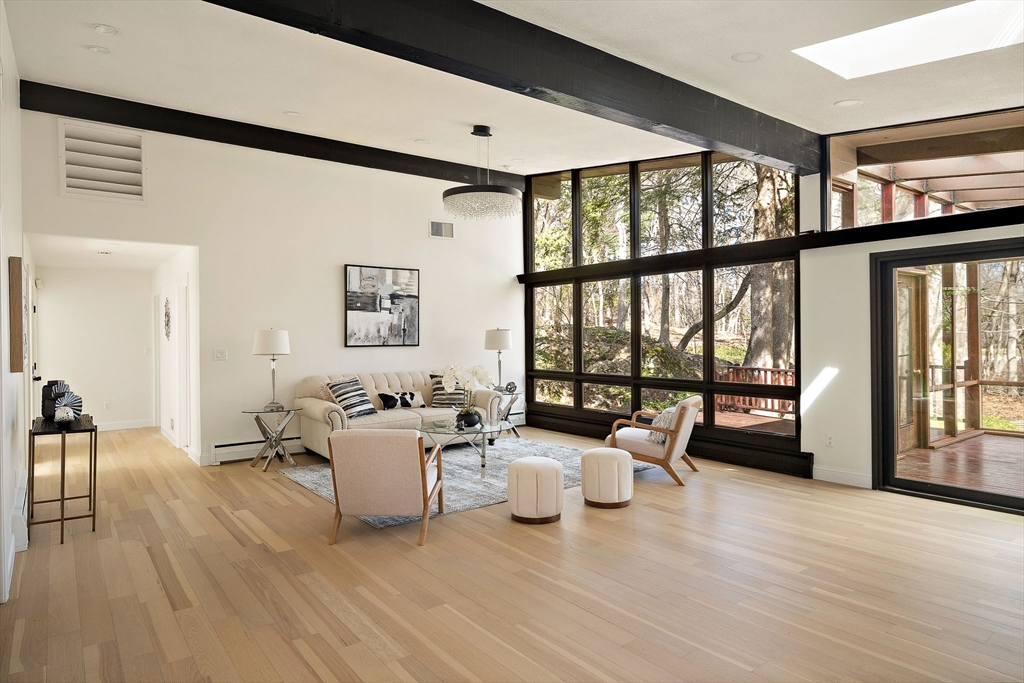 Beautifully Renovated Mid-Century Modern Gem! Nestled on a sprawling 24,459 SF landscaped lot, this home blends timeless mid-century design with modern updates. The grand living room wows with soaring beam ceilings, a wall of windows, and views of the screened porch and serene backyard. The newly renovated kitchen features sleek cabinetry, countertops, appliances, and a peninsula with easy access to the deck. The main level boasts three spacious bedrooms, two updated baths, and a cozy wood-burning fireplace. The primary suite overlooks the lush yard, offering a peaceful retreat. The finished lower level is ideal for guests or extended family, with a great room, kitchenette, patio access, a fourth bedroom, full bath, studio, bonus room, and abundant storage. New flooring, fresh paint, updated baths, and select windows/doors complete this move-in-ready home. A rare find combining architectural charm, modern comfort, and flexible spaces—this one’s a must-see!