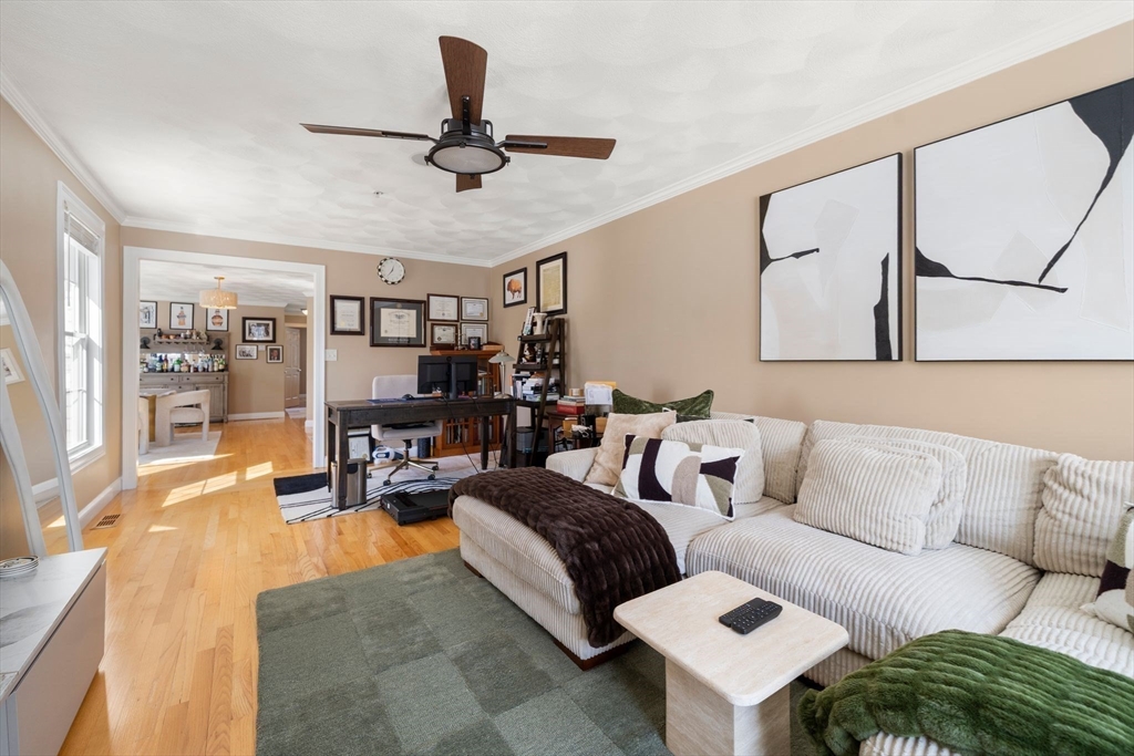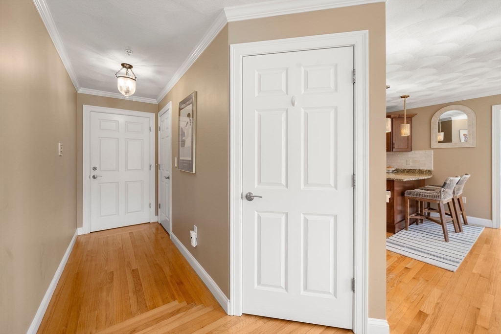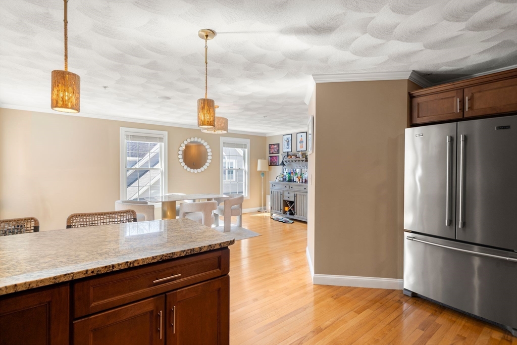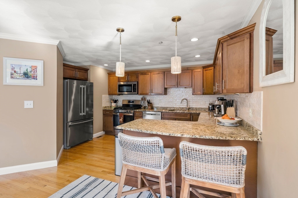 Located in the heart of Wilmington, this beautifully maintained 2-bed, 1-bath single-level condo offers the perfect blend of comfort and convenience—just 0.3 miles to the MBTA Commuter Rail to Boston. The bright, open-concept layout features high ceilings, hardwood floors, recessed lighting, and oversized windows that fill the home with natural light. The updated kitchen offers elegant cabinetry, granite countertops, tile backsplash, stainless steel appliances, and a peninsula with seating, flowing seamlessly into a dedicated dining area—ideal for everyday living and entertaining. The spacious primary bedroom includes a spacious closet, and the full bath features ample storage and tub for the perfect relaxing retreat. Additional highlights include in-unit laundry, central air, private deeded storage, and two deeded parking spaces. Ideally located near highways, shopping, dining, parks, and Wilmington Town Common.